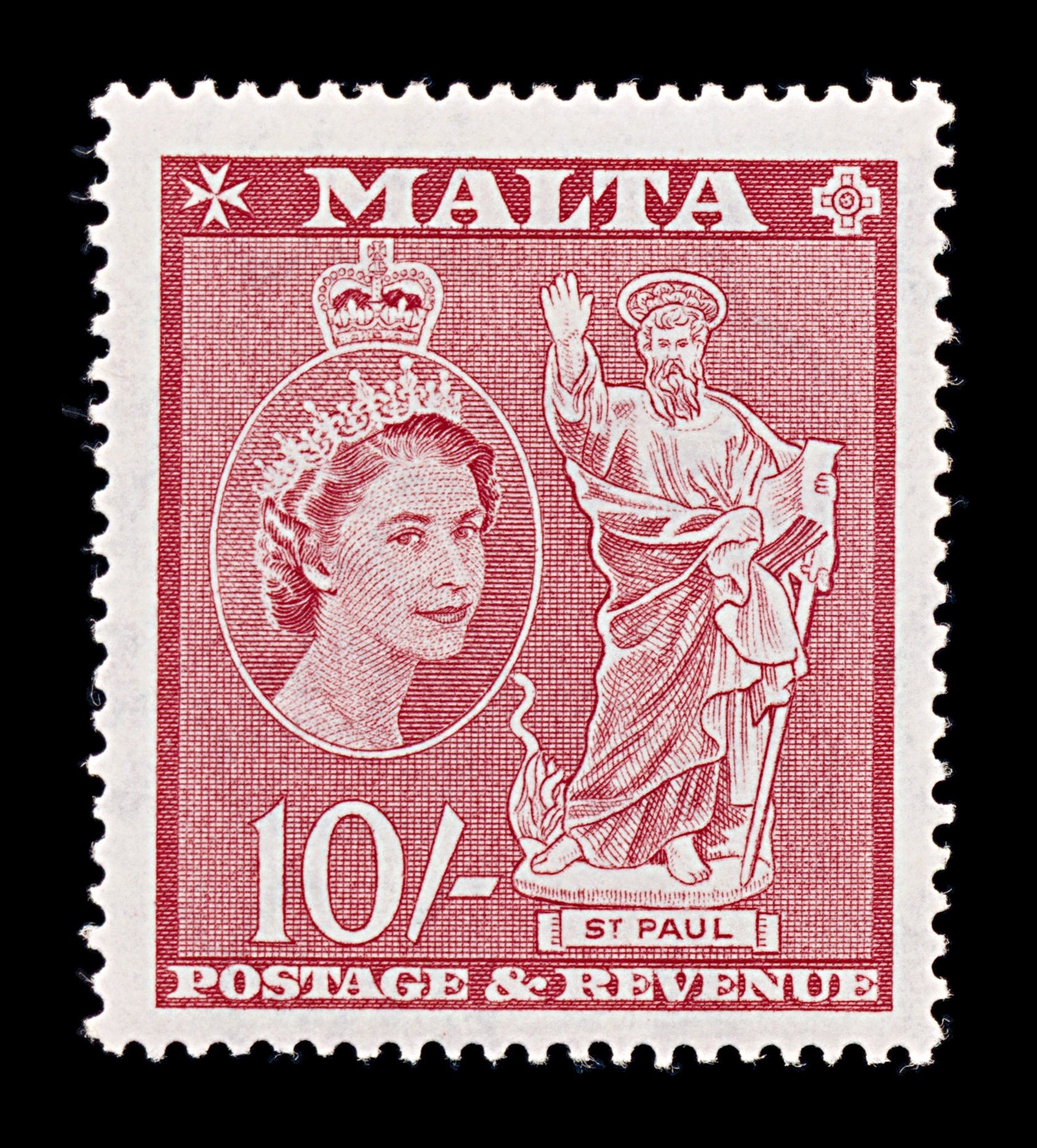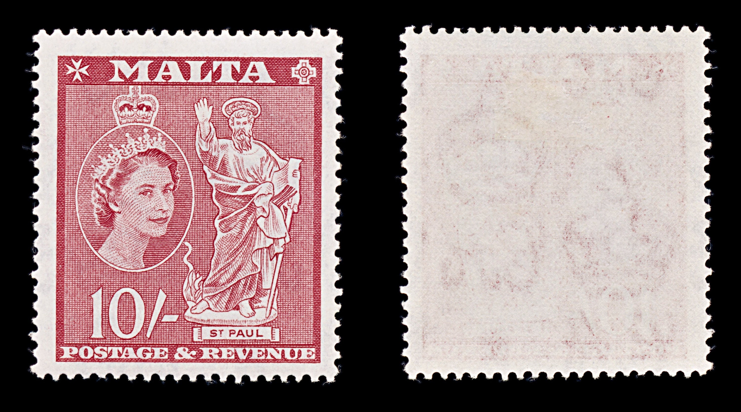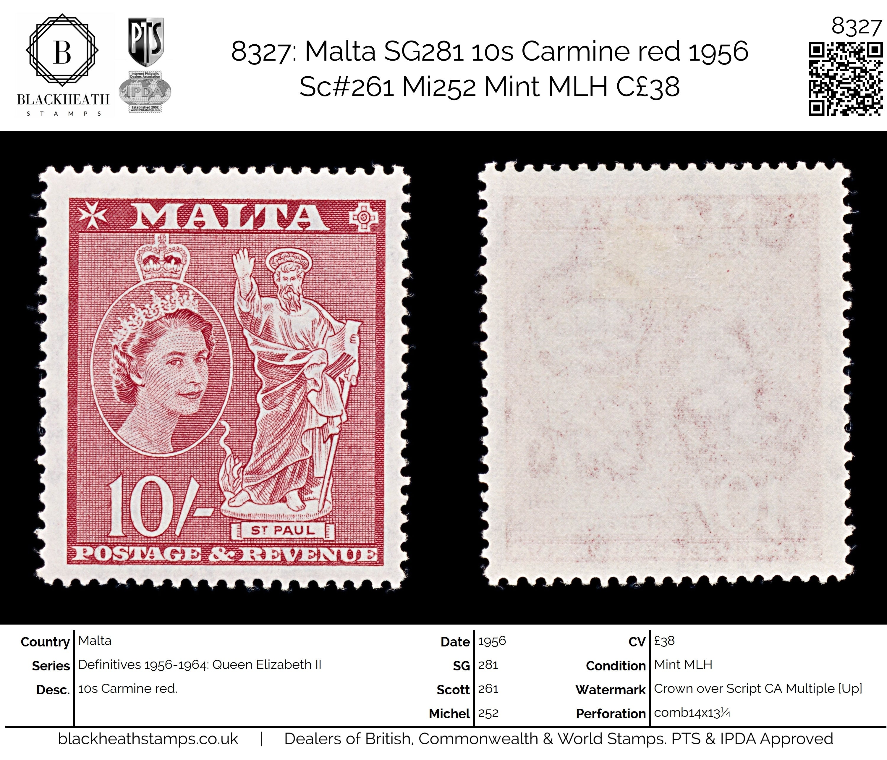 8327: Malta SG281 10s Carmine red 1956 Sc#261 Mi252 Mint MLH C£38