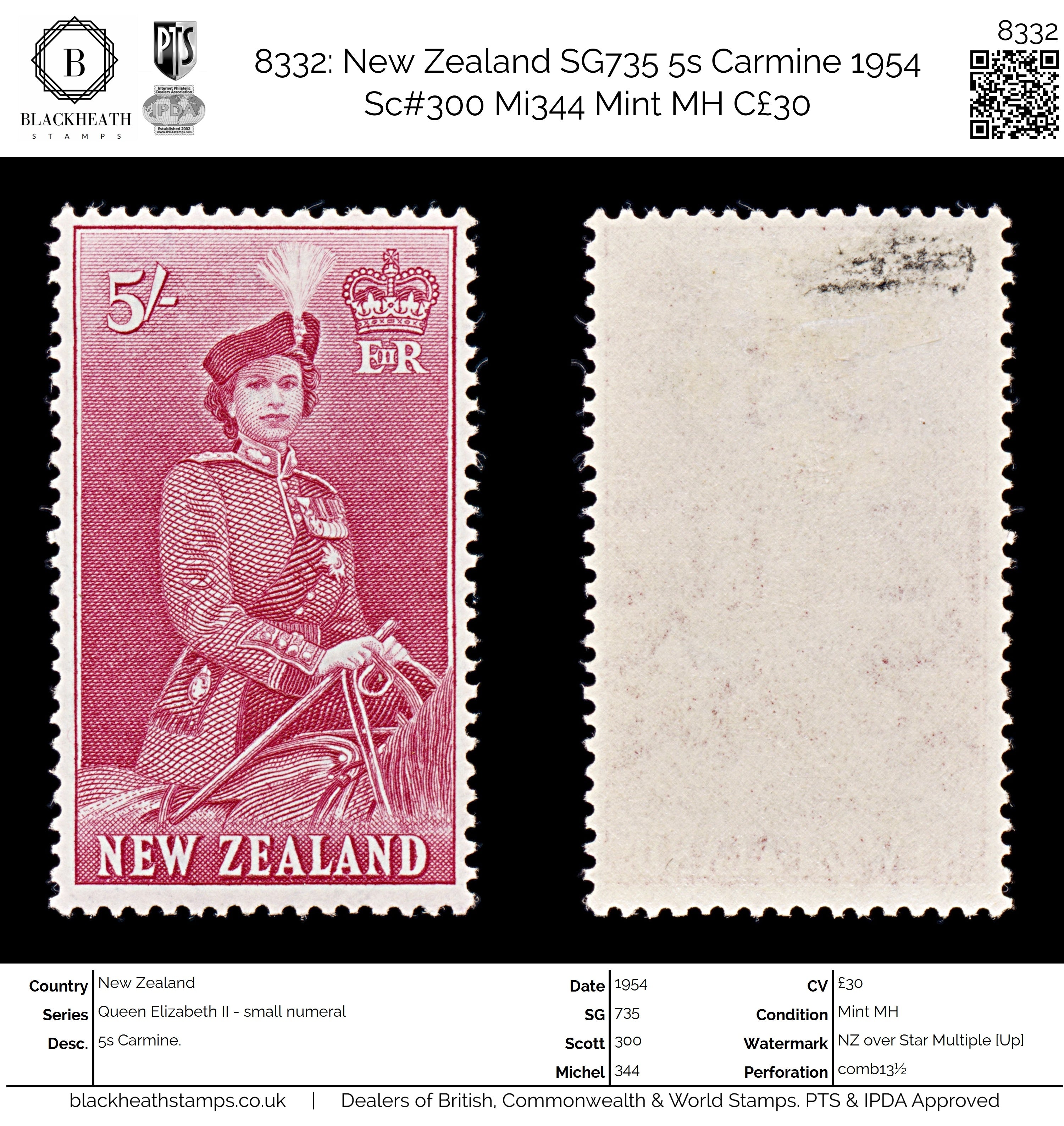 8332: New Zealand SG735 5s Carmine 1954 Sc#300 Mi344 Mint MH C£30