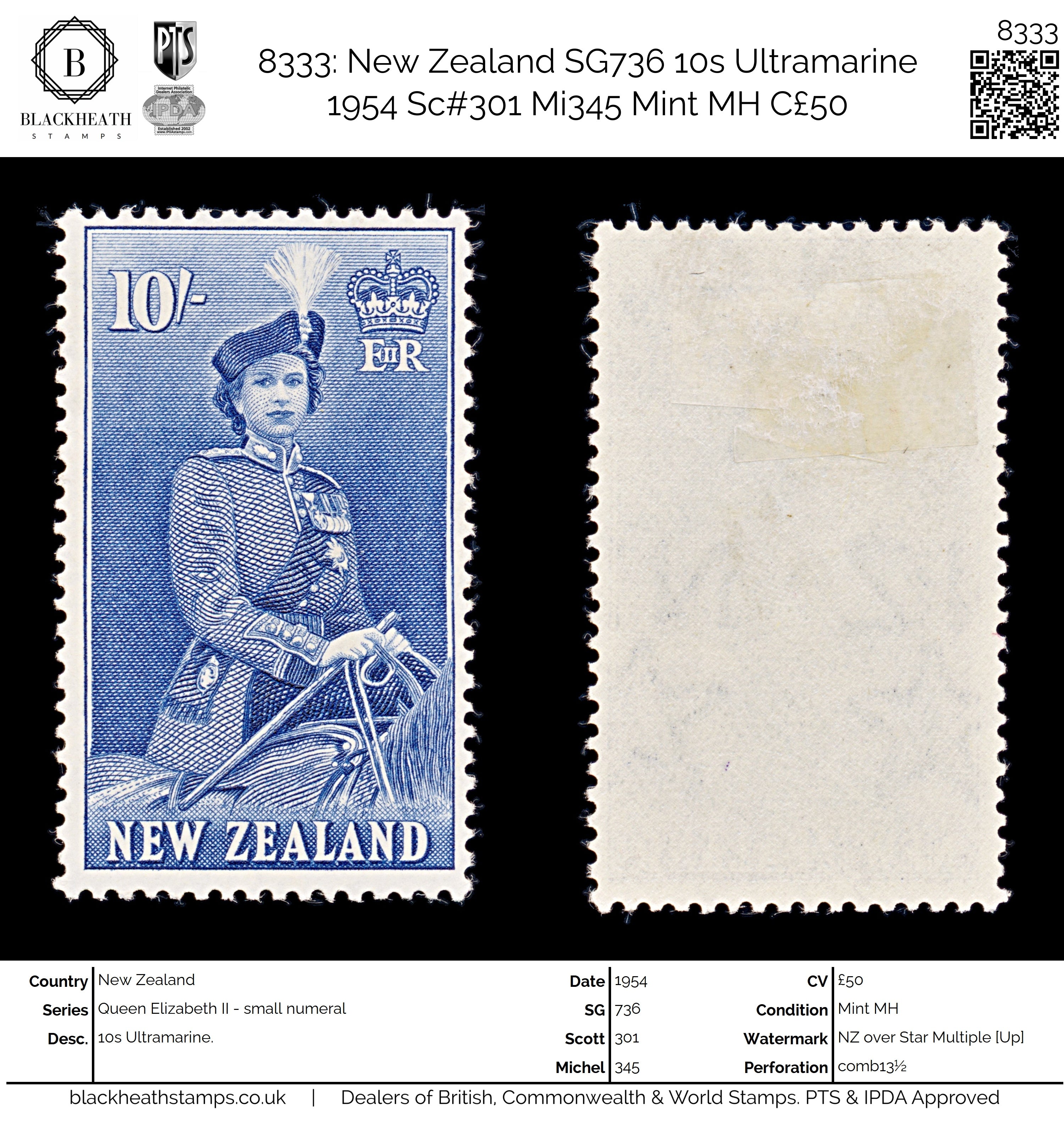 8333: New Zealand SG736 10s Ultramarine 1954 Sc#301 Mi345 Mint MH C£50