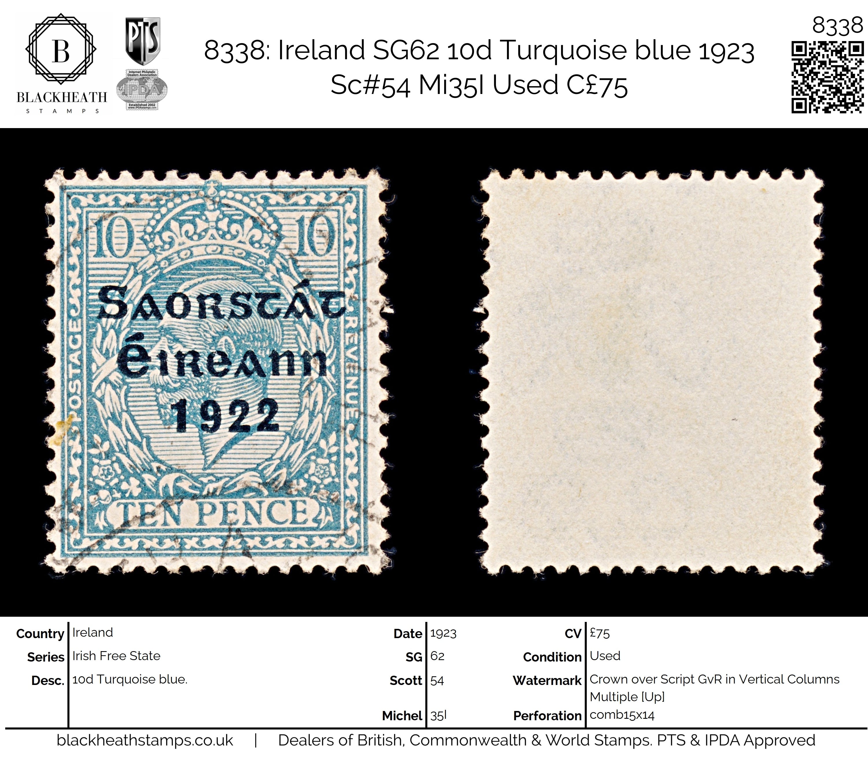 8338: Ireland SG62 10d Turquoise blue 1923 Sc#54 Mi35I Uséd C£75