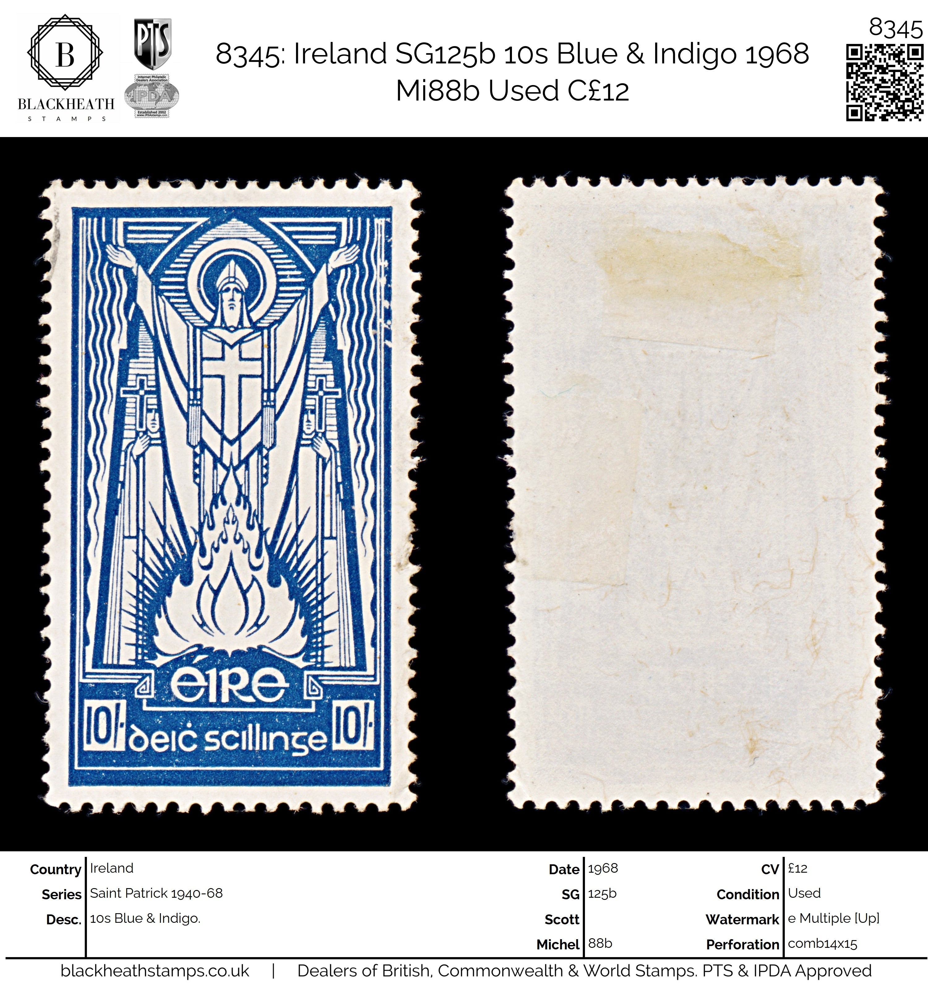 8345: Ireland SG125b 10s Blue & Indigo 1968 Mi88b Used C£12