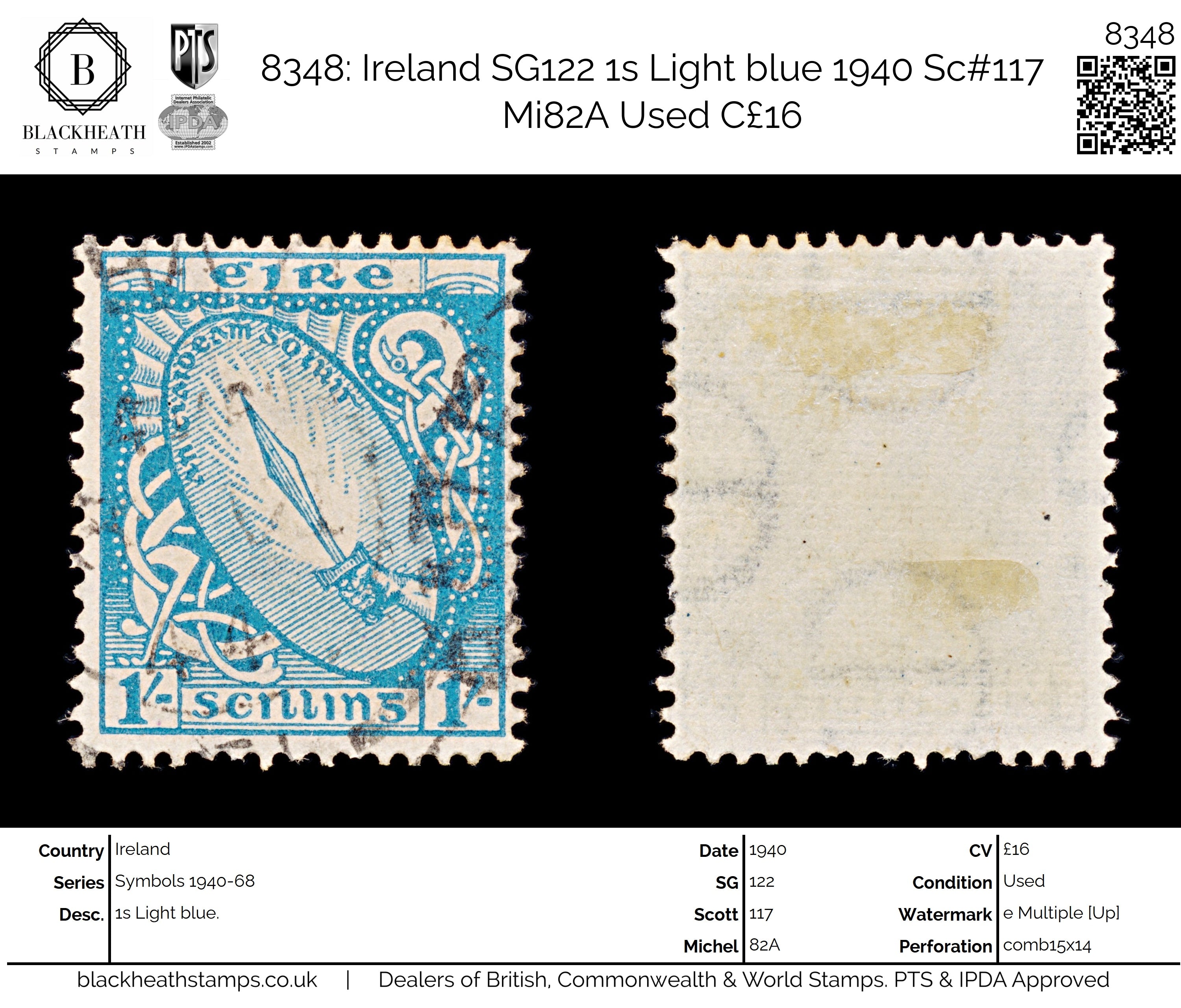 8348: Ireland SG122 1s Light blue 1940 Sc#117 Mi82A Uséd C£16