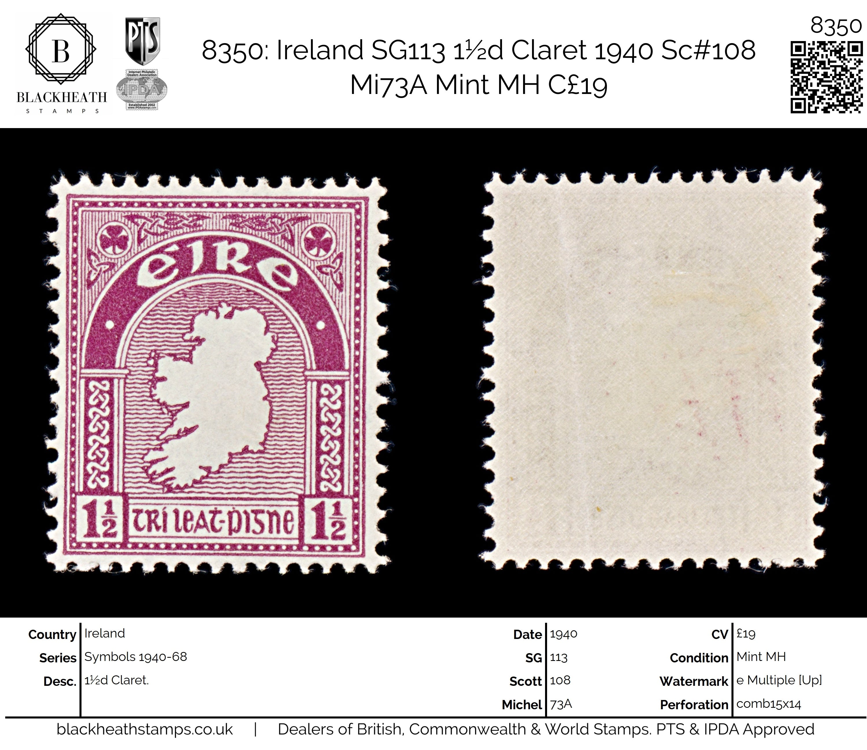8350: Ireland SG113 1½d Claret 1940 Sc#108 Mi73A Mint MH C£19