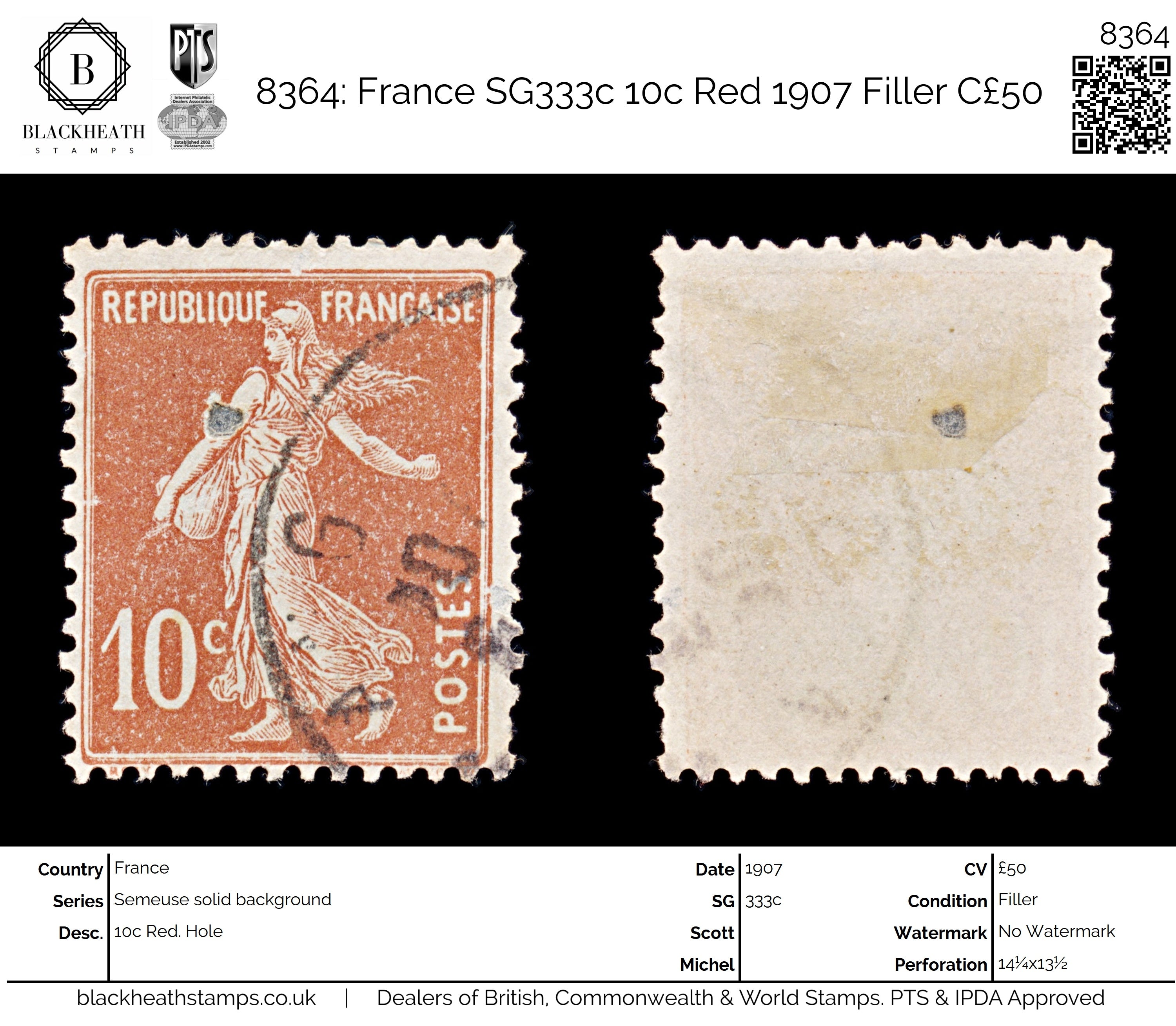 8364: France SG333c 10c Red 1907 Filler C£50: Hole