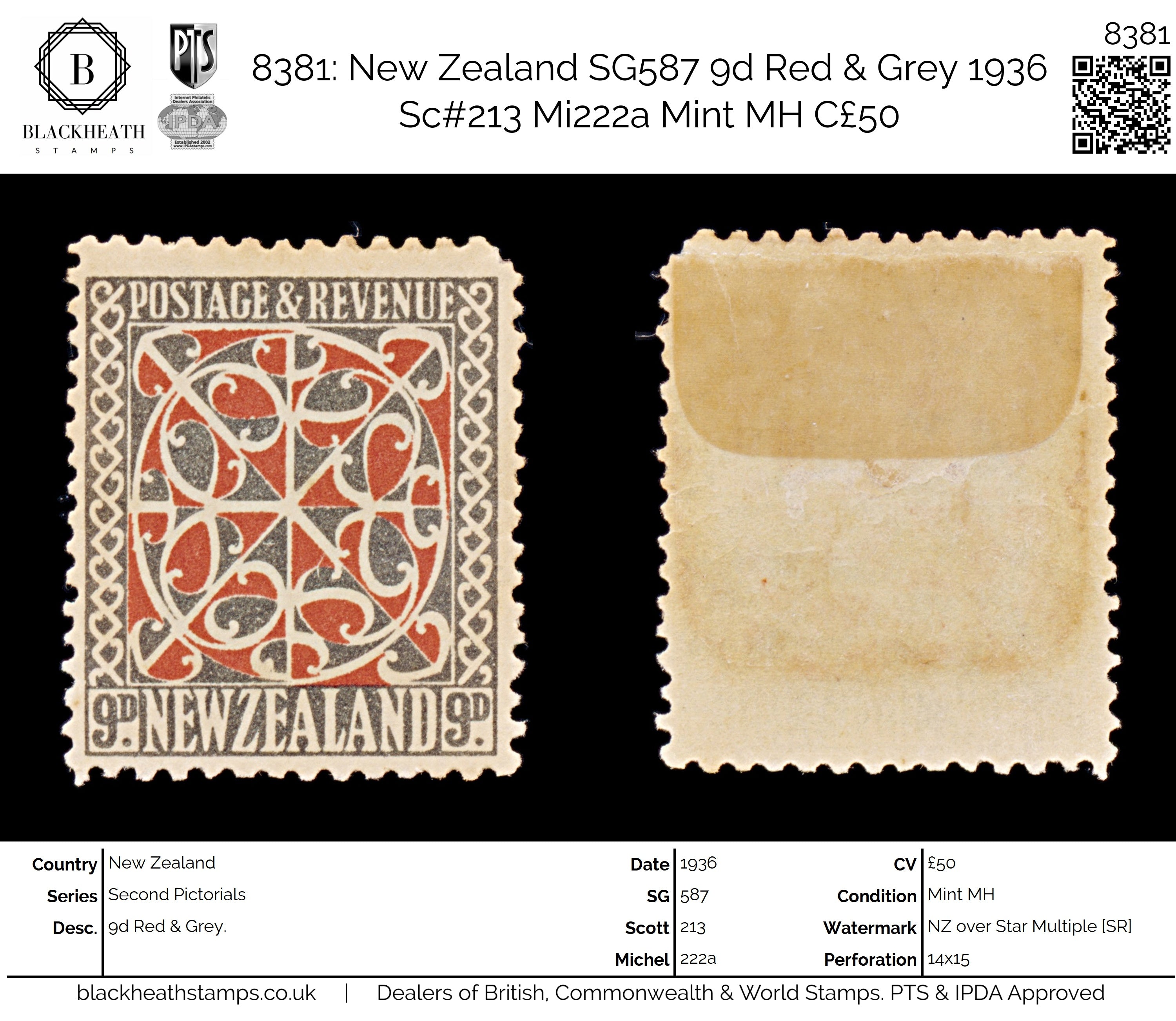8381: New Zealand SG587 9d Red & Grey 1936 Sc#213 Mi222a Mint MH C£50