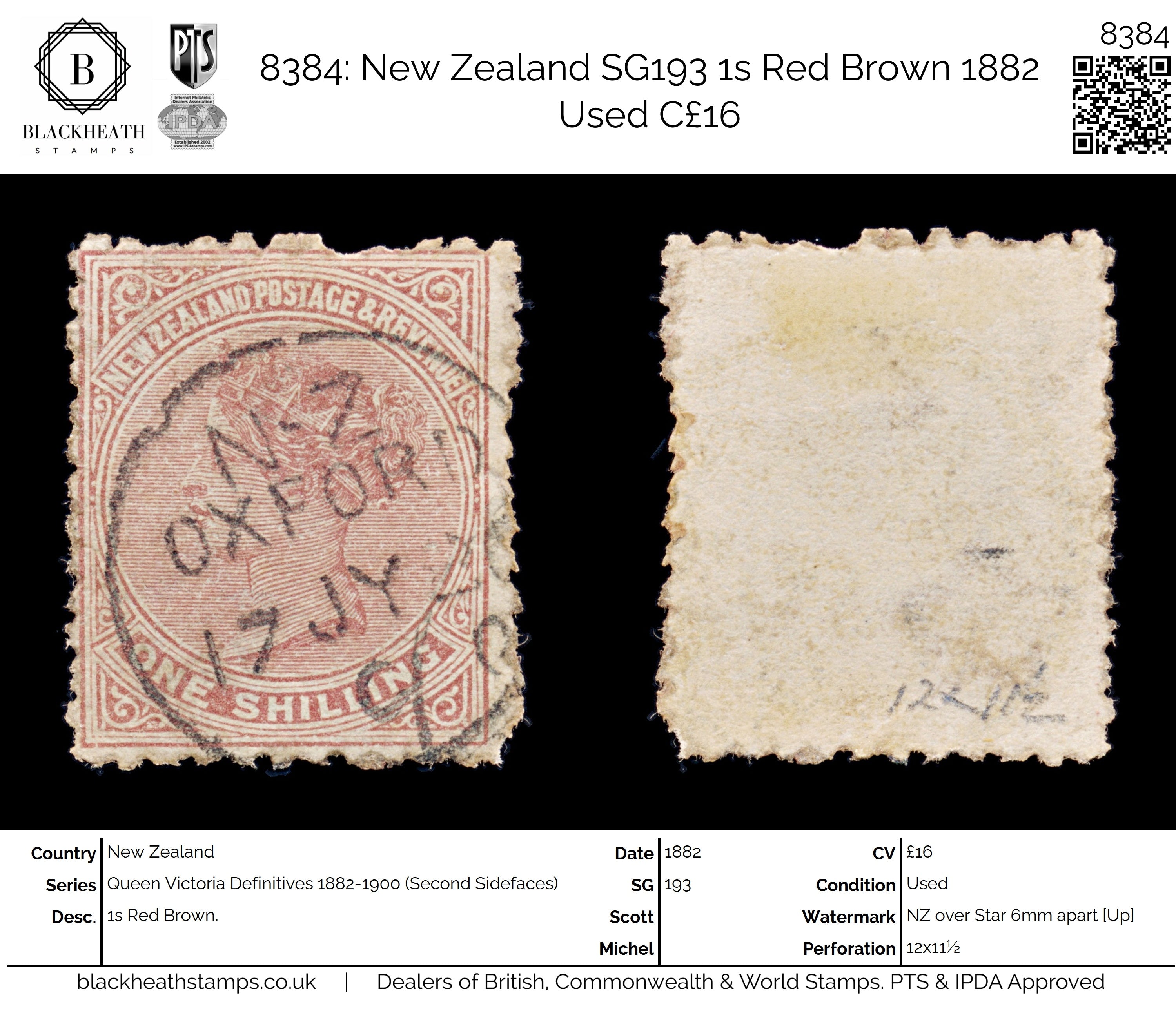 8384: New Zealand SG193 1s Red Brown 1882 Used C£16