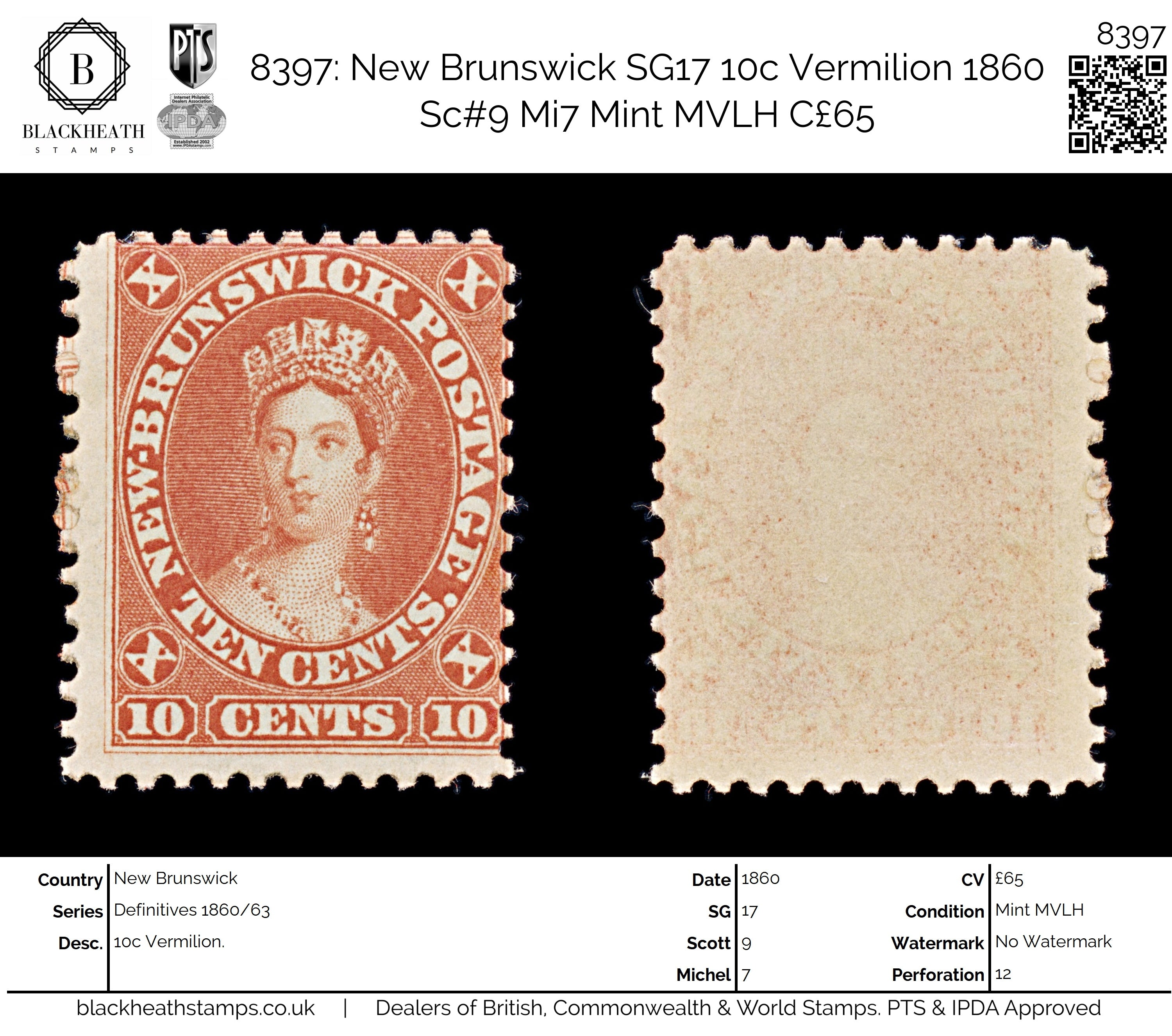 8397: New Brunswick SG17 10c Vermilion 1860 Sc#9 Mi7 Mint MVLH C£65