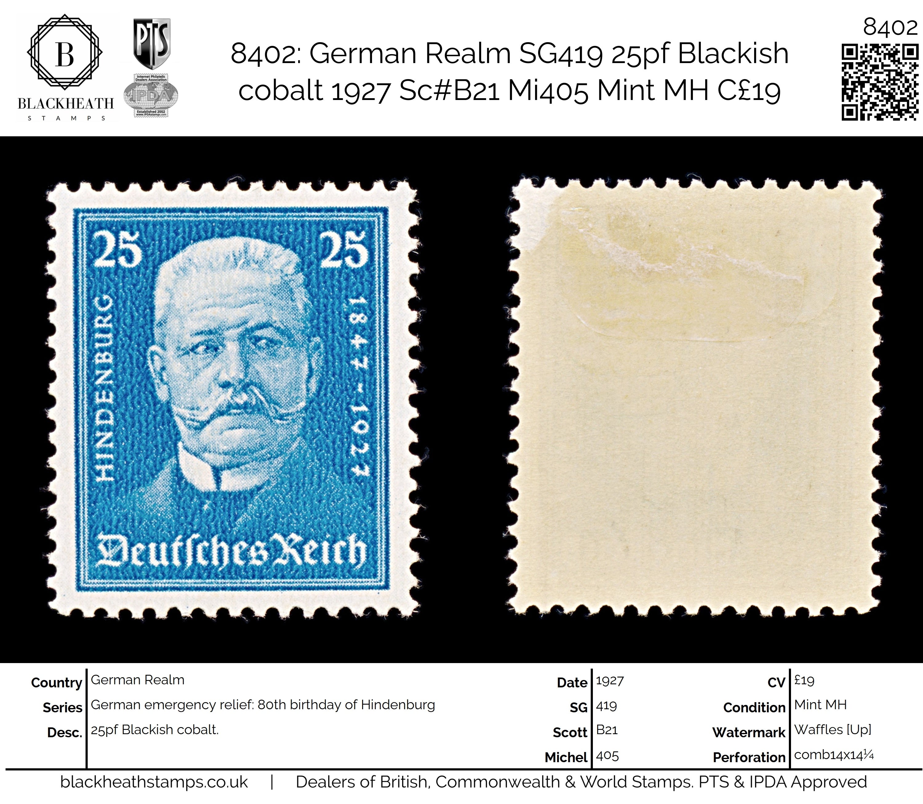 8402: German Realm SG419 25pf Blackish cobalt 1927 Sc#B21 Mi405 Mint MH C£19