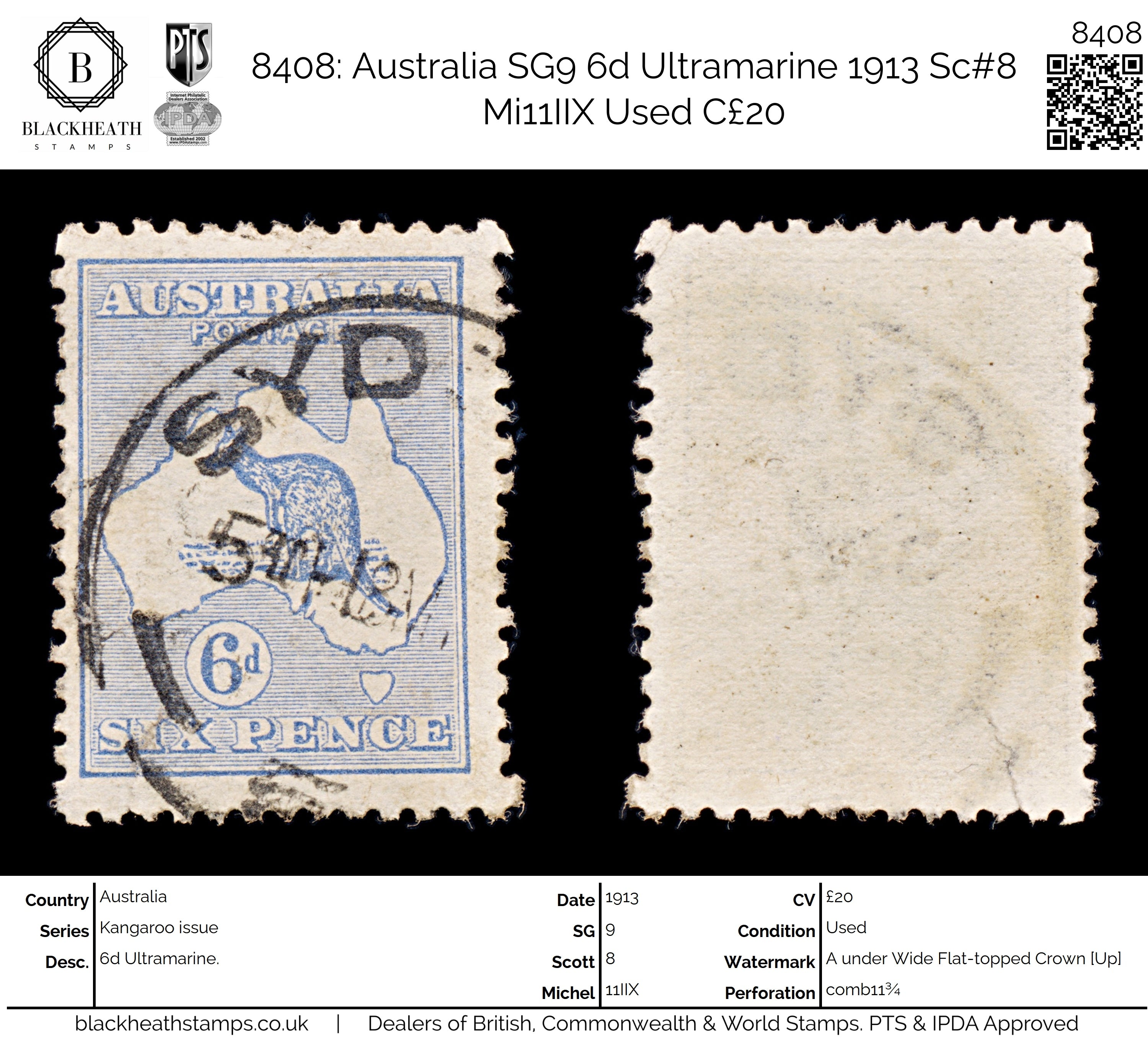 8408: Australia SG9 6d Ultramarine 1913 Sc#8 Mi11IIX Uséd C£20
