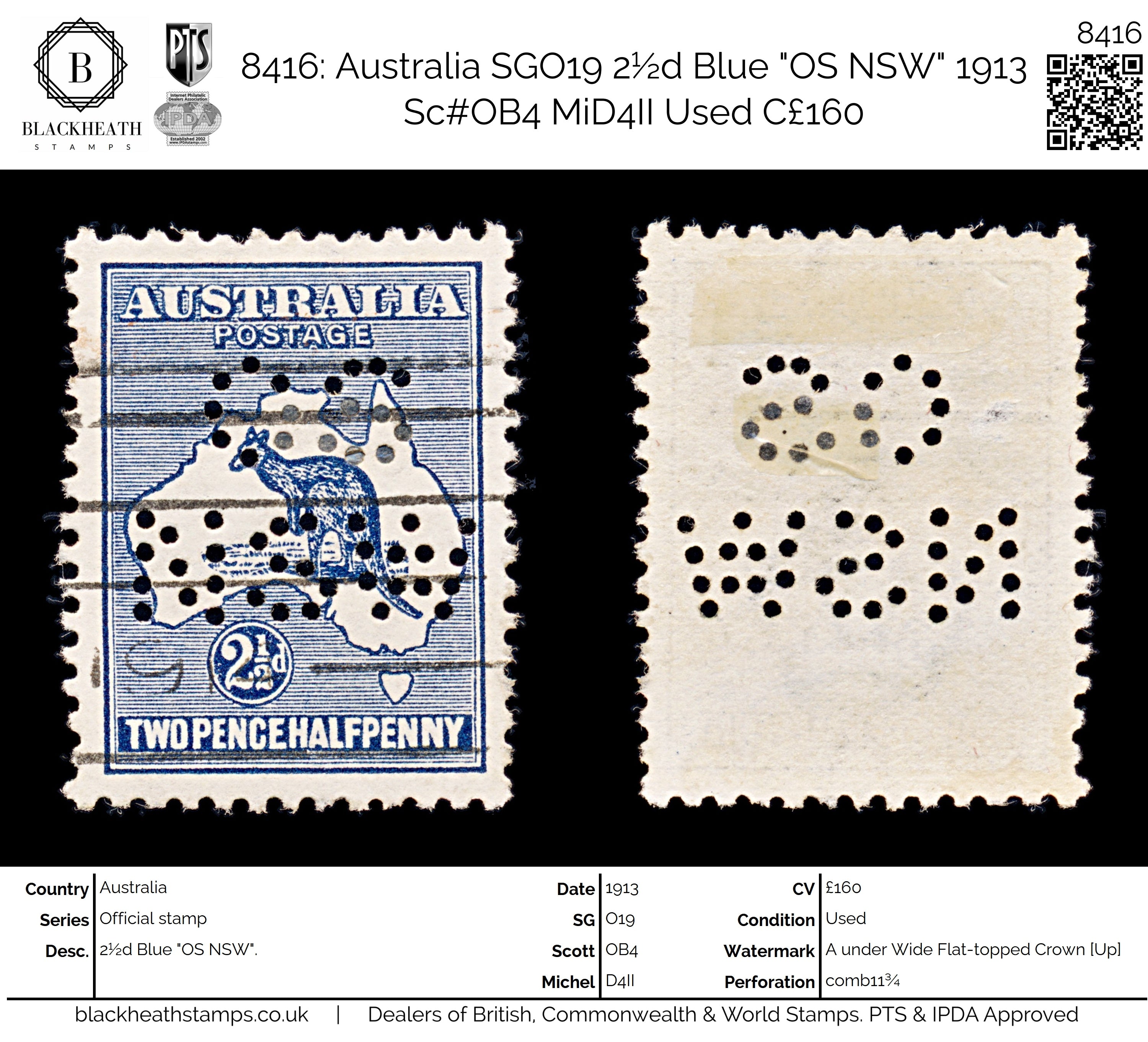 8416: Australia SGO19 2½d Blue "OS NSW" 1913 Sc#OB4 MiD4II Uséd C£160