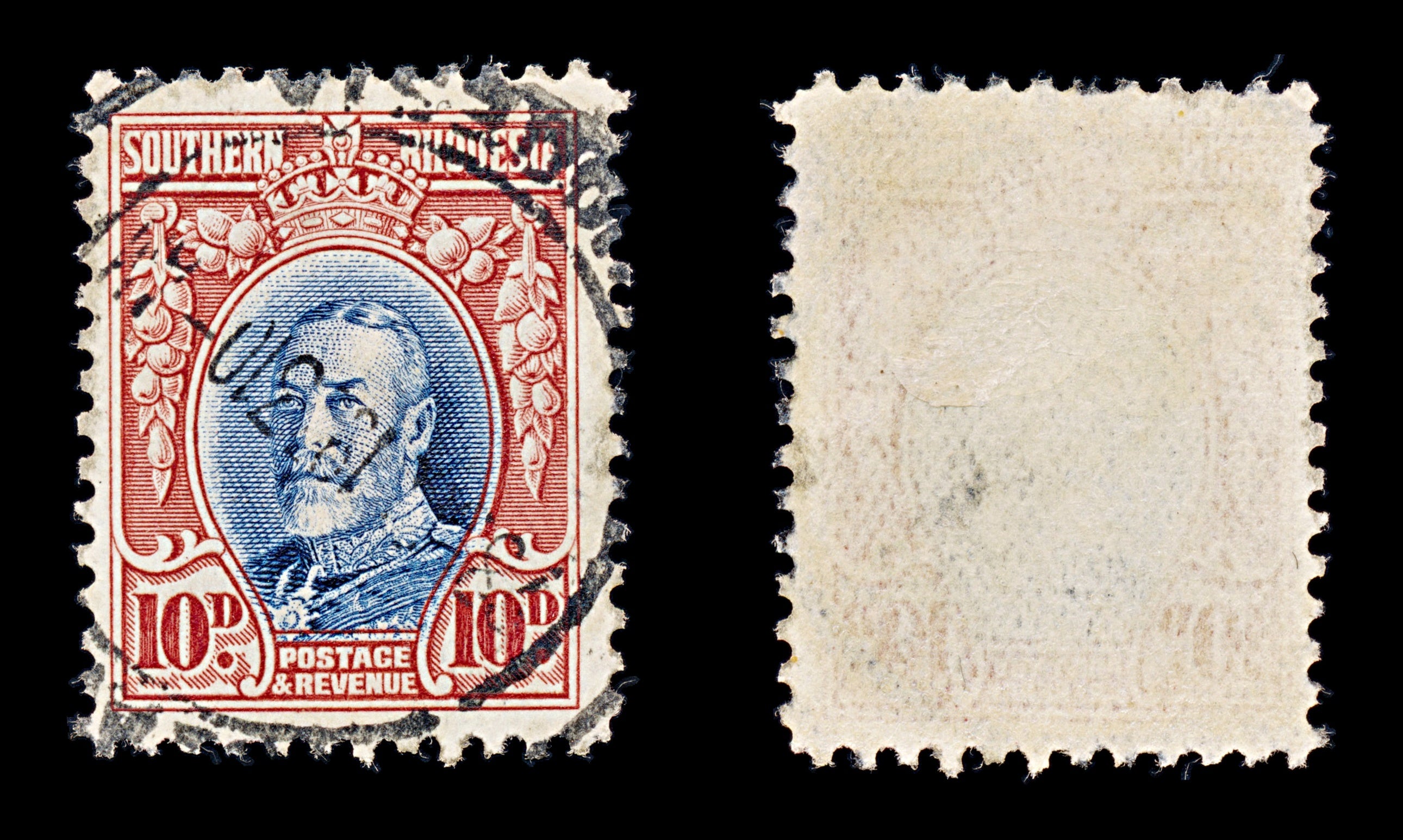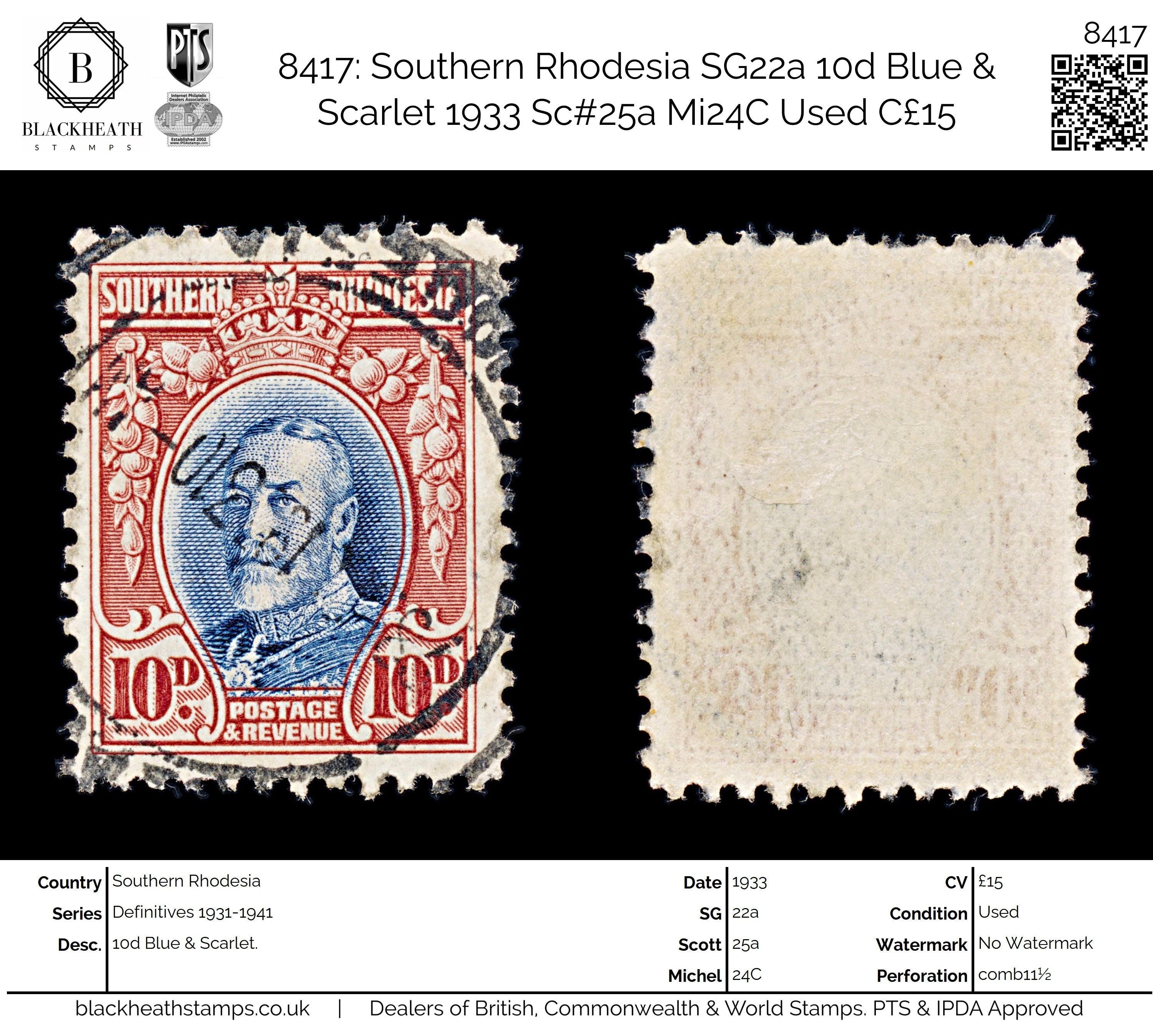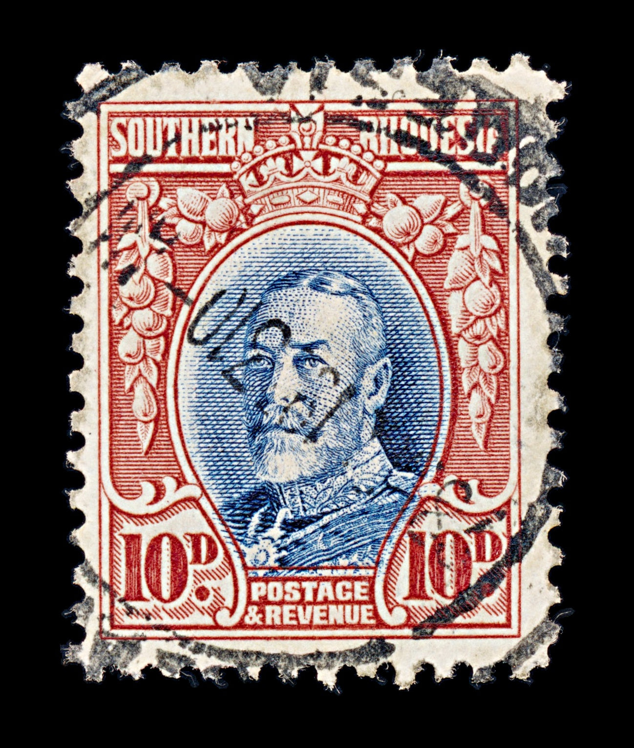 8417: Southern Rhodesia SG22a 10d Blue & Scarlet 1933 Sc#25a Mi24C Uséd C£15