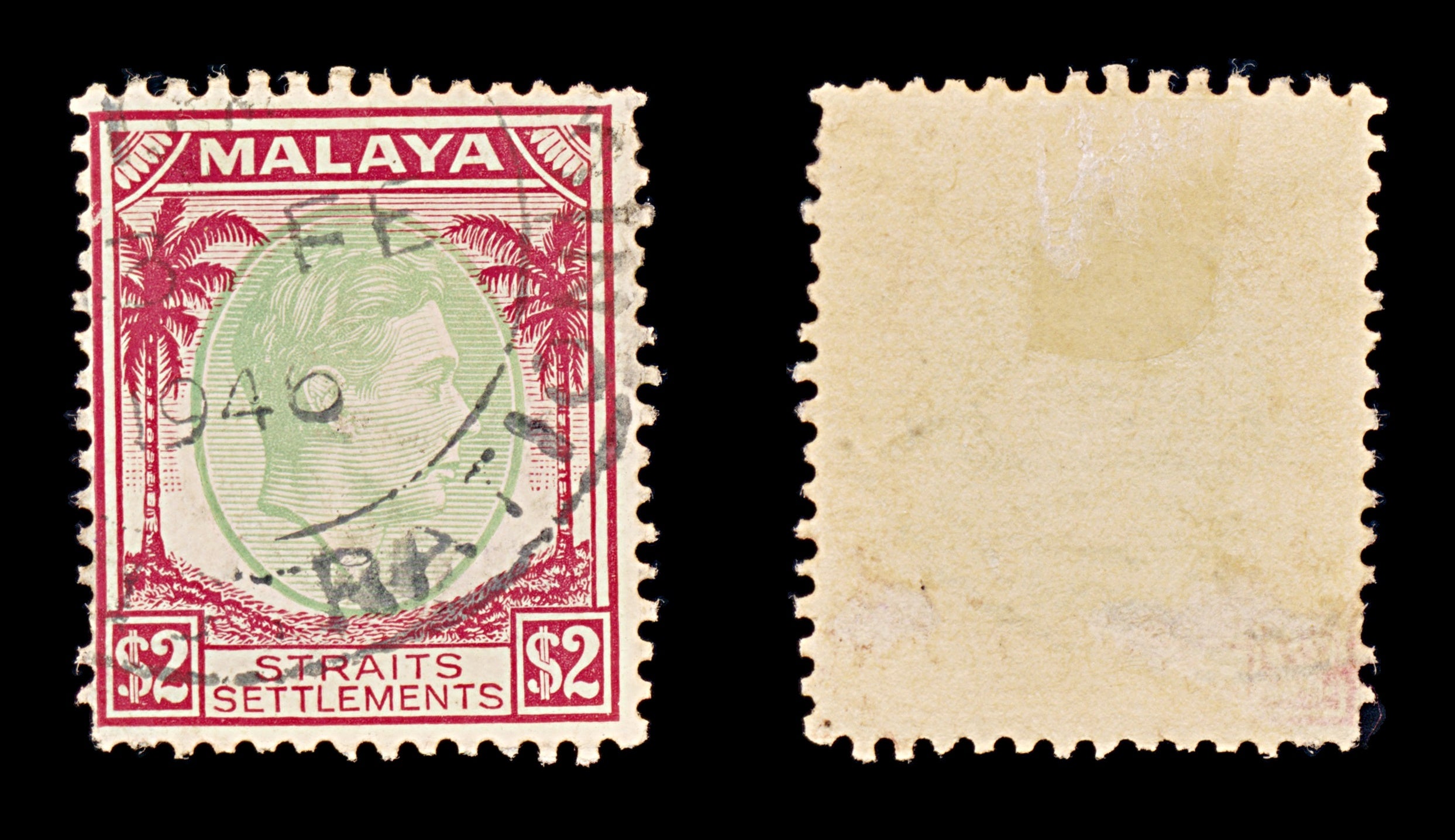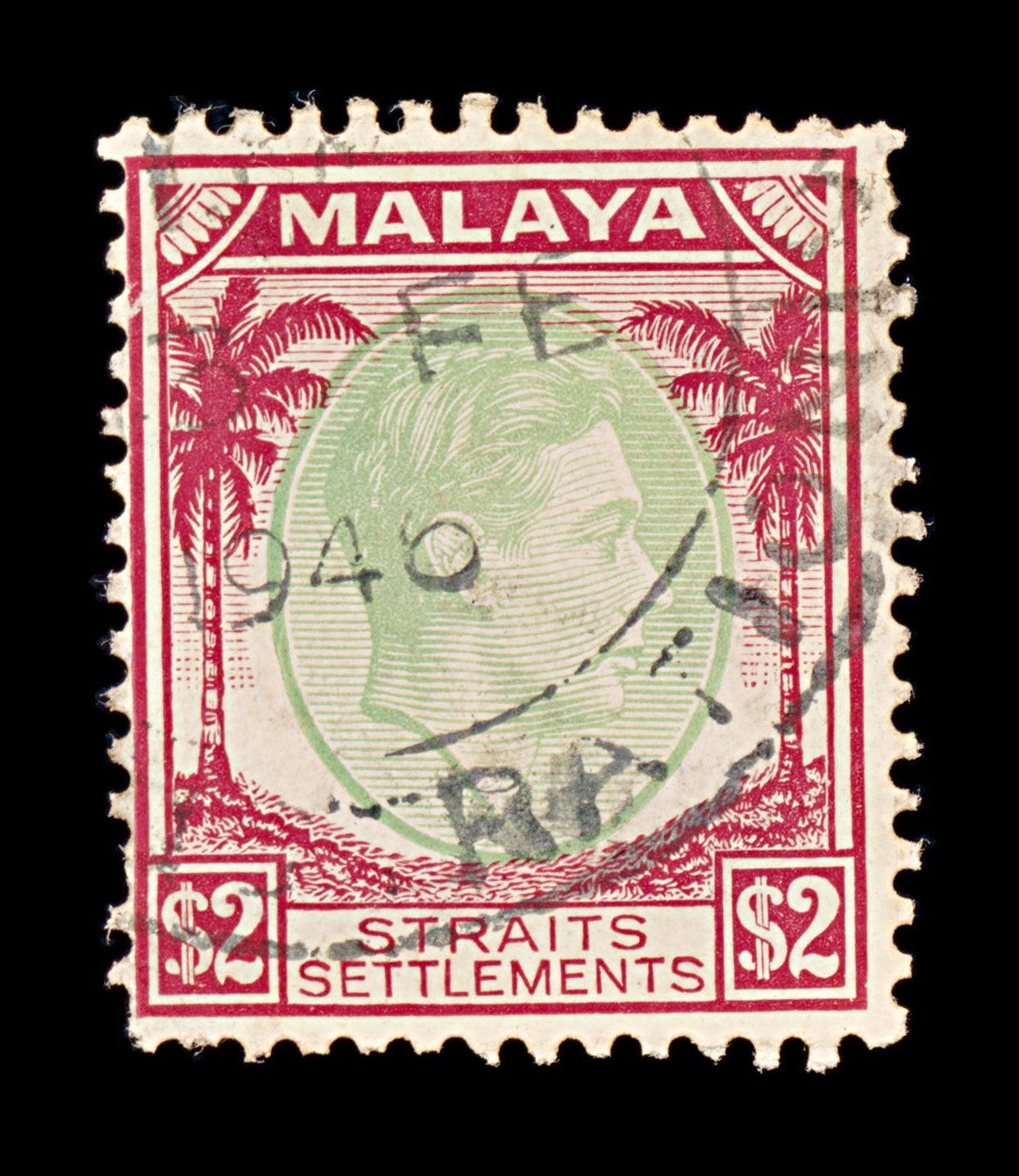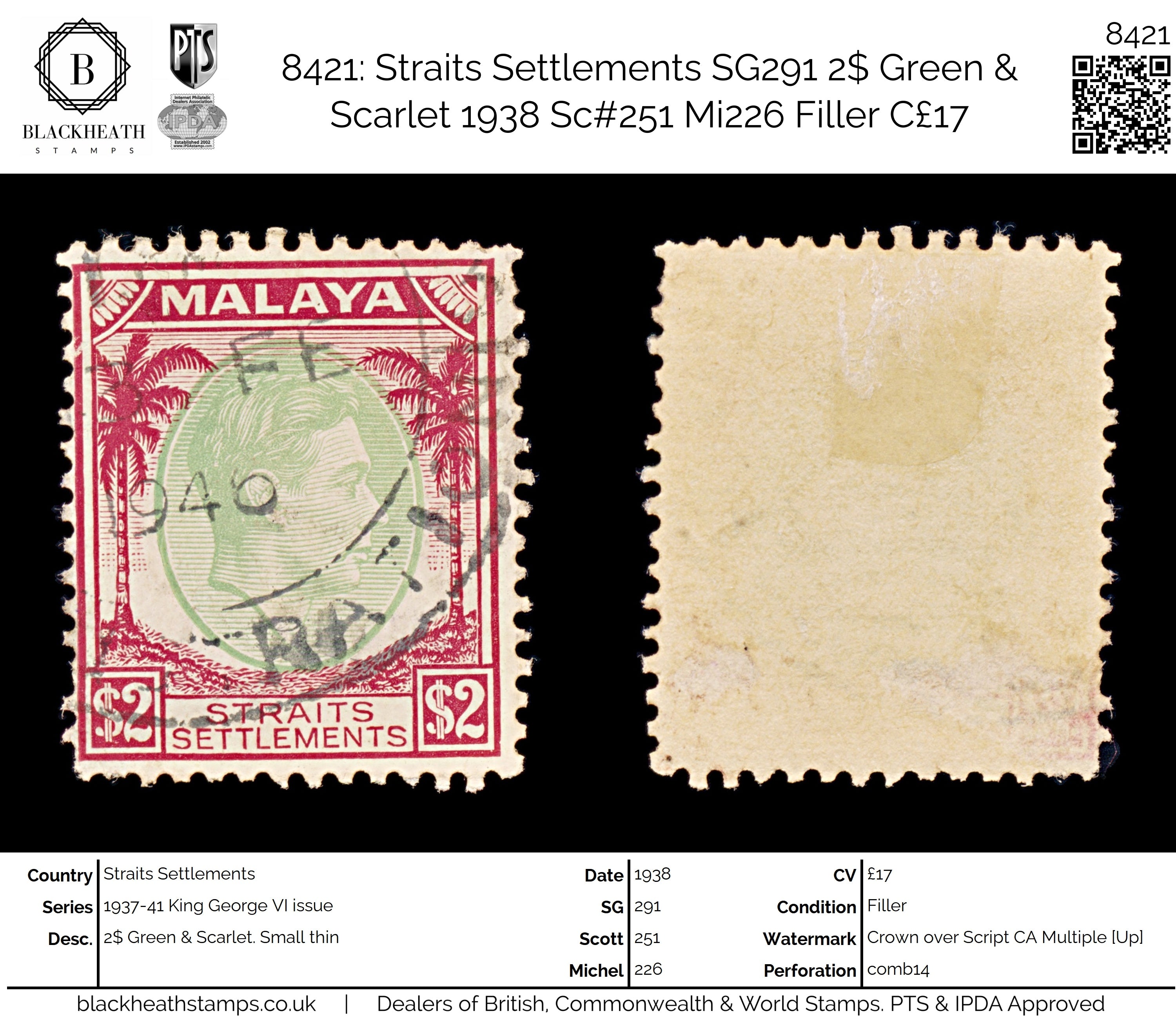 8421: Straits Settlements SG291 2$ Green & Scarlet 1938 Sc#251 Mi226 Filler C£17