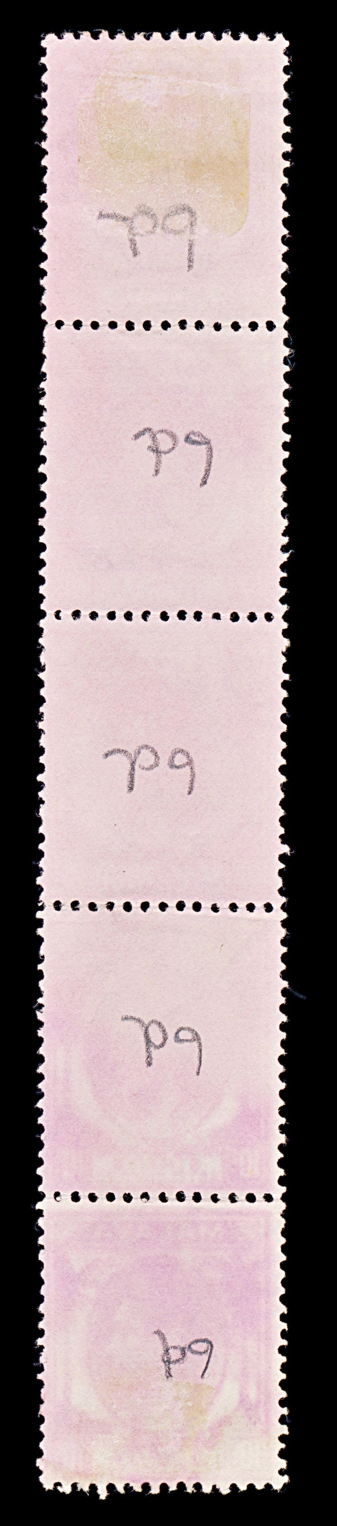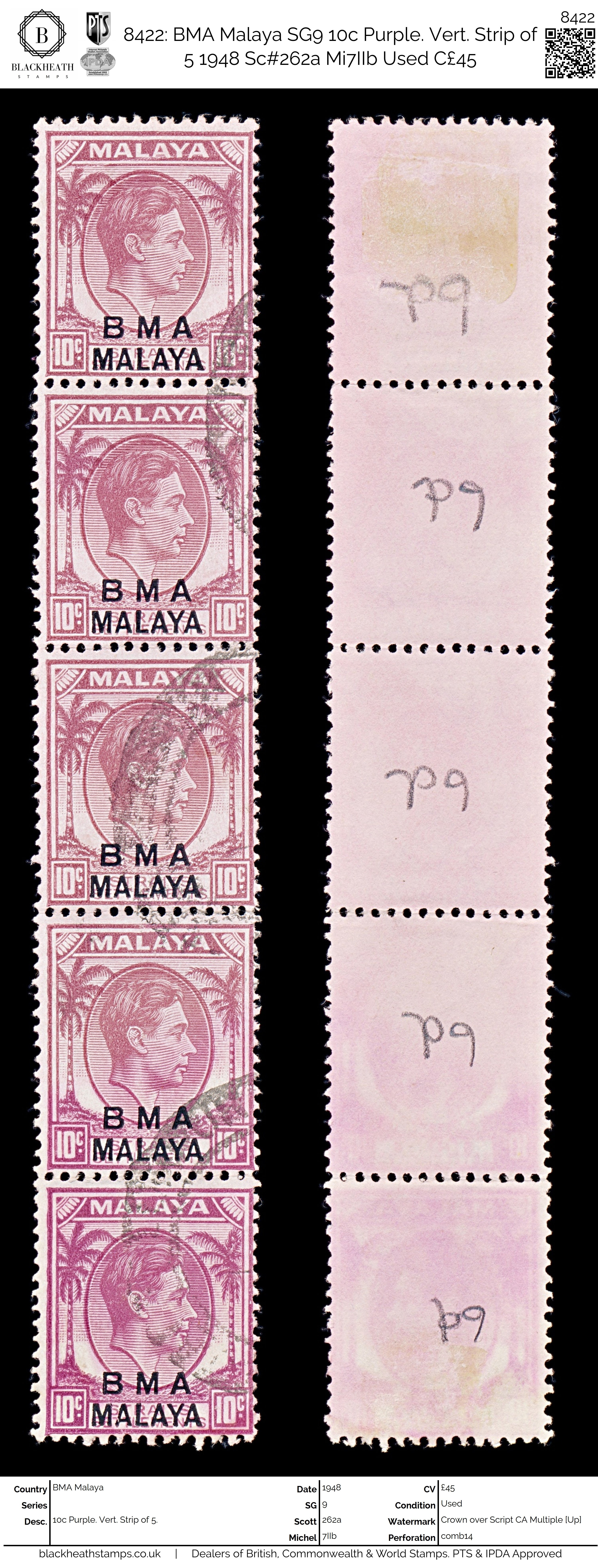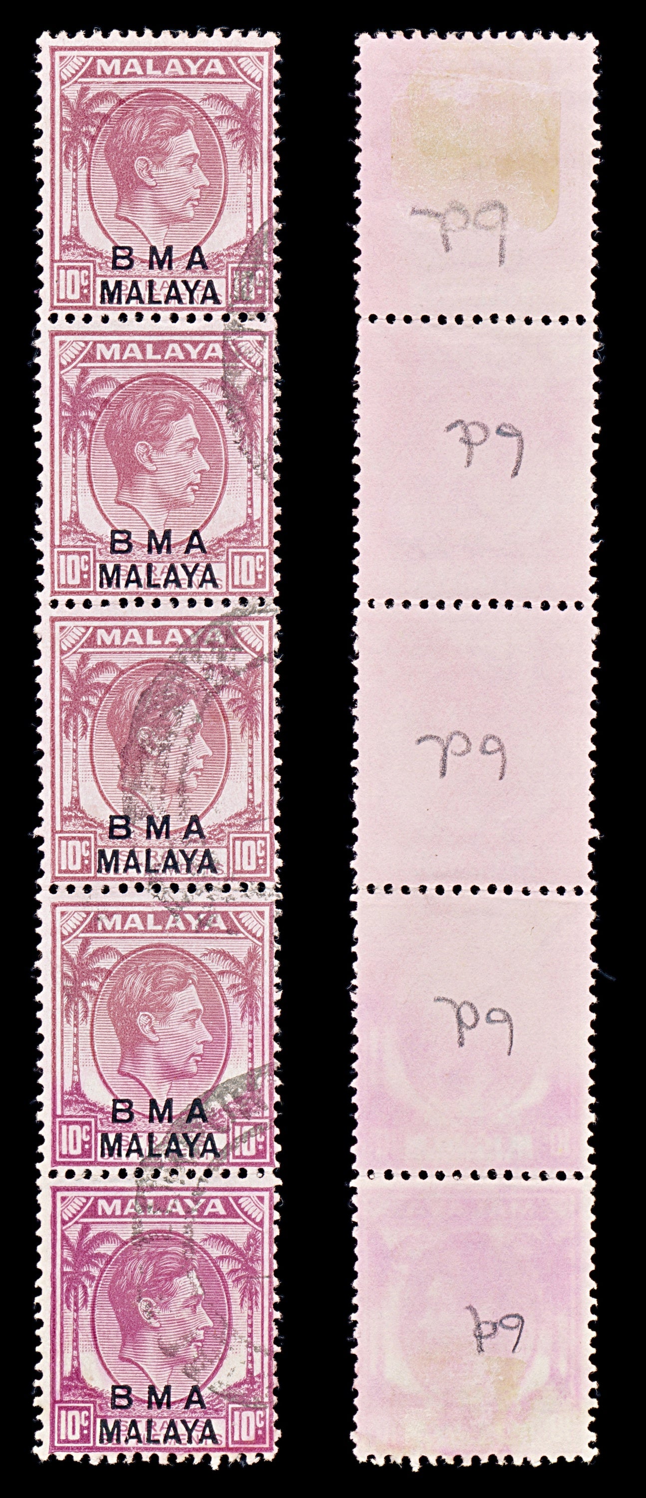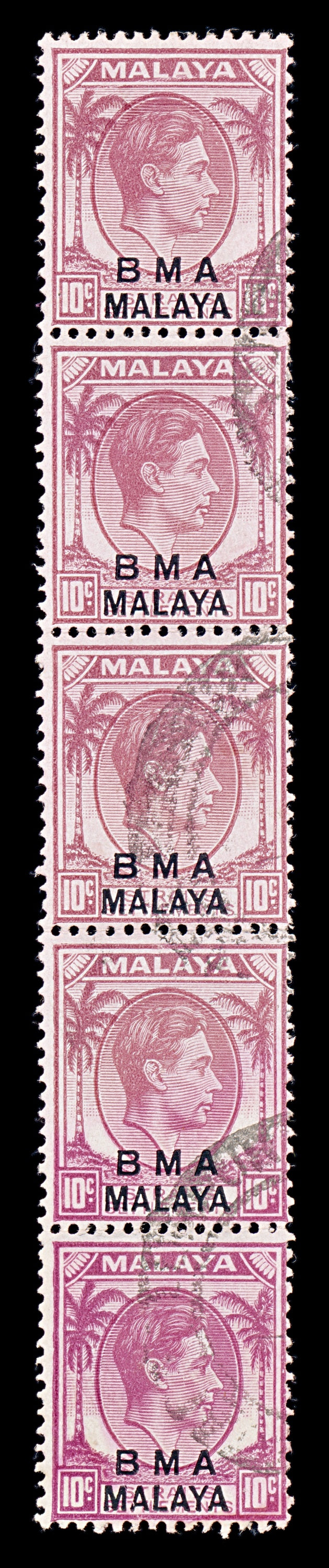 8422: BMA Malaya SG9 10c Purple. Vert. Strip of 5 1948 Sc#262a Mi7IIb Uséd C£45