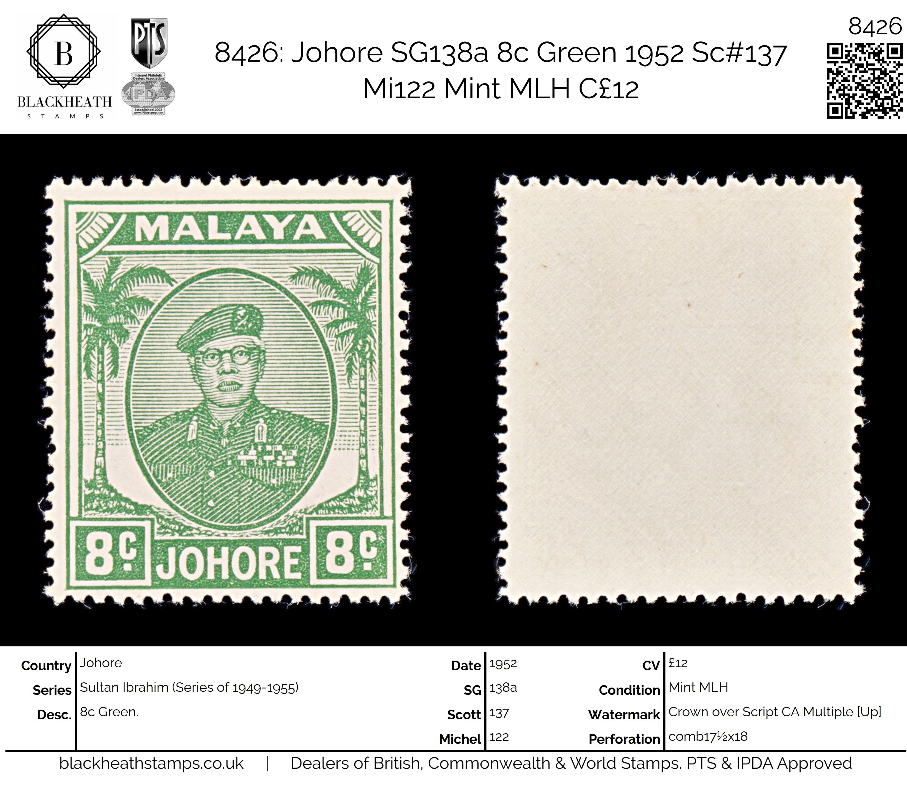 8426: Johore SG138a 8c Green 1952 Sc#137 Mi122 Mint MLH C£12