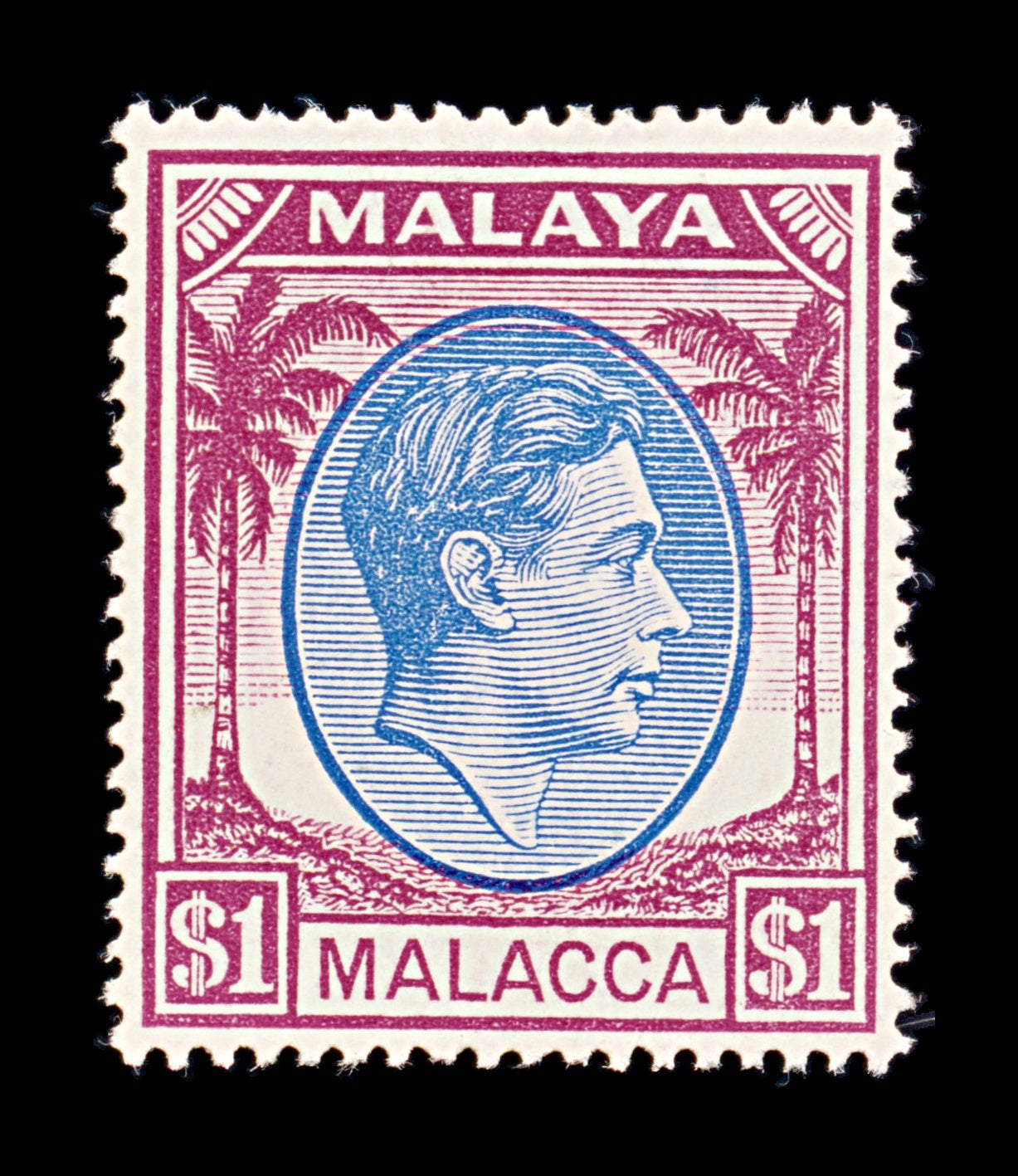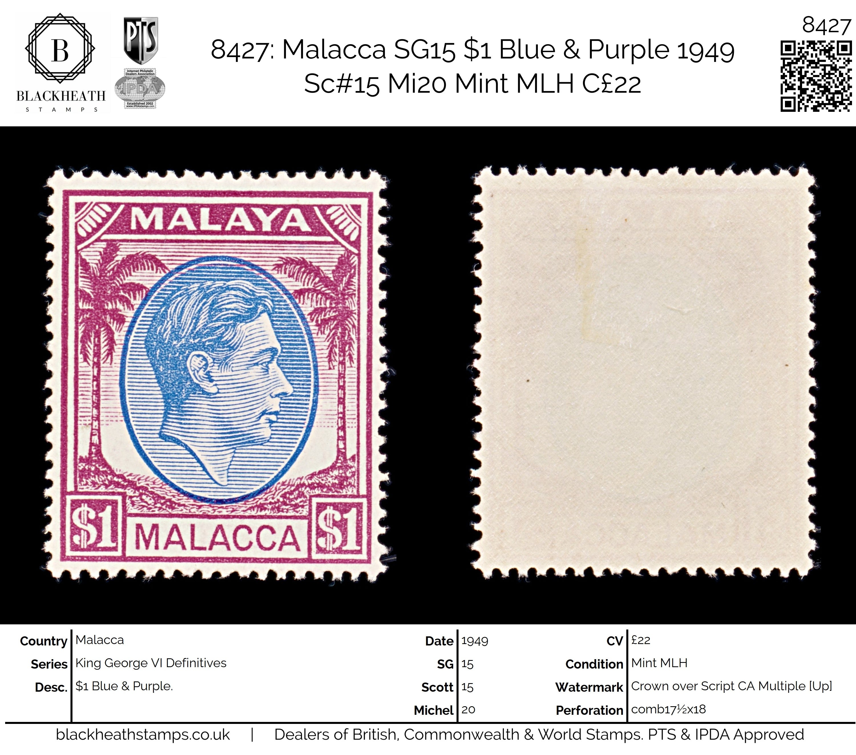 8427: Malacca SG15 $1 Blue & Purple 1949 Sc#15 Mi20 Mint MLH C£22