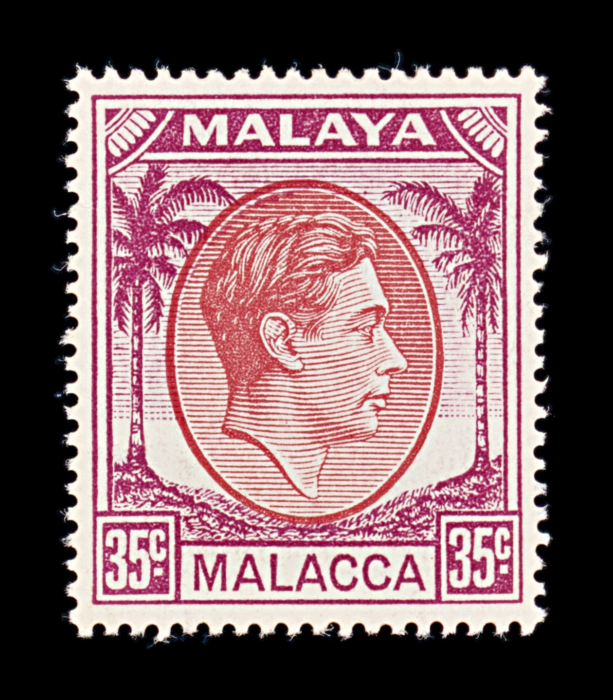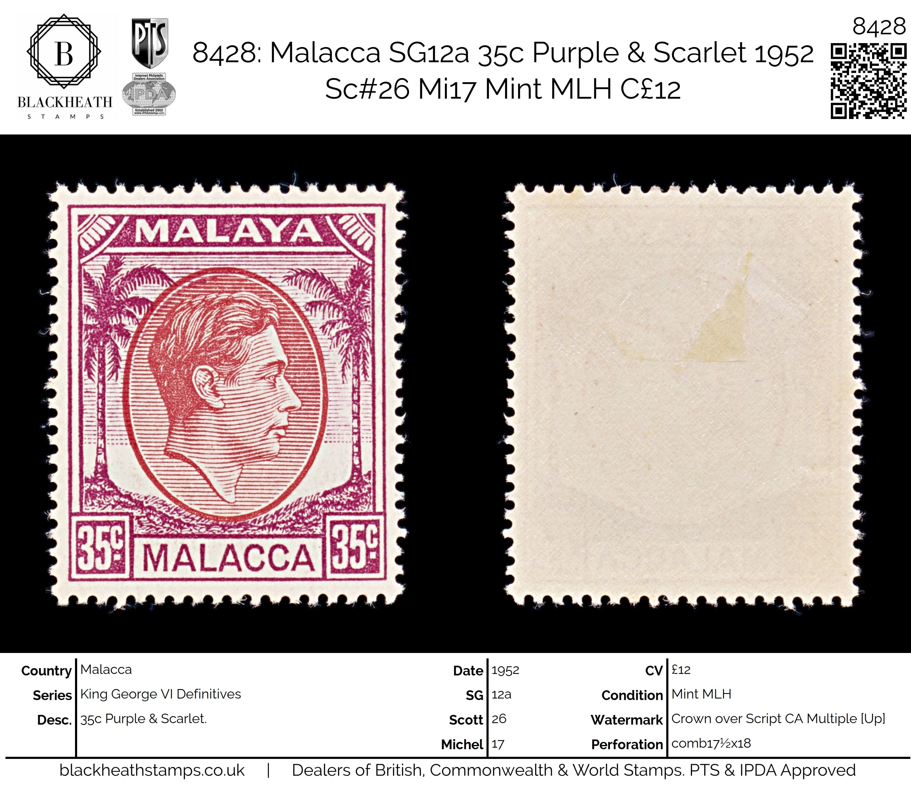 8428: Malacca SG12a 35c Purple & Scarlet 1952 Sc#26 Mi17 Mint MLH C£12