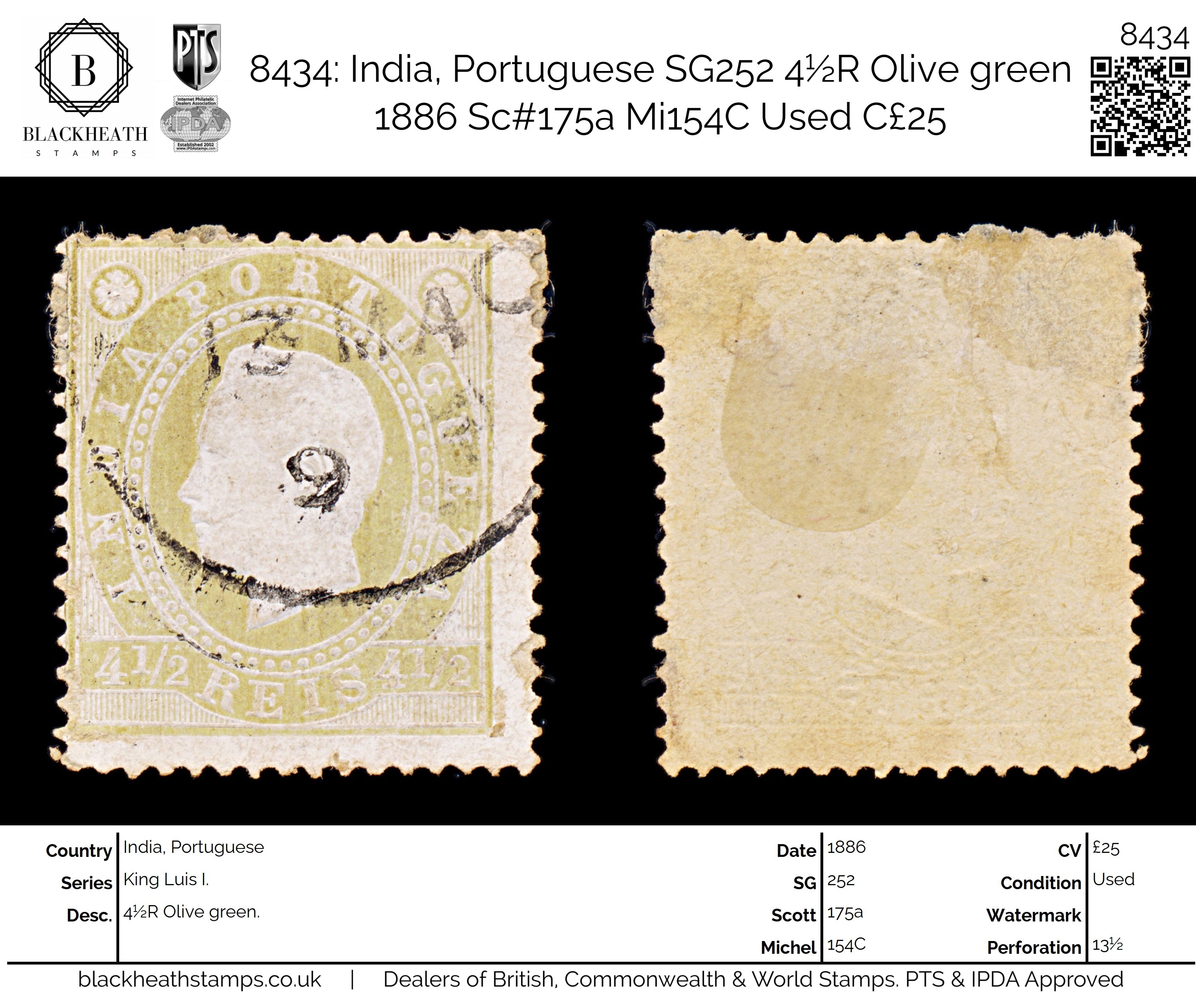 8434: India, Portuguese SG252 4½R Olive green 1886 Sc#175a Mi154C Uséd C£25