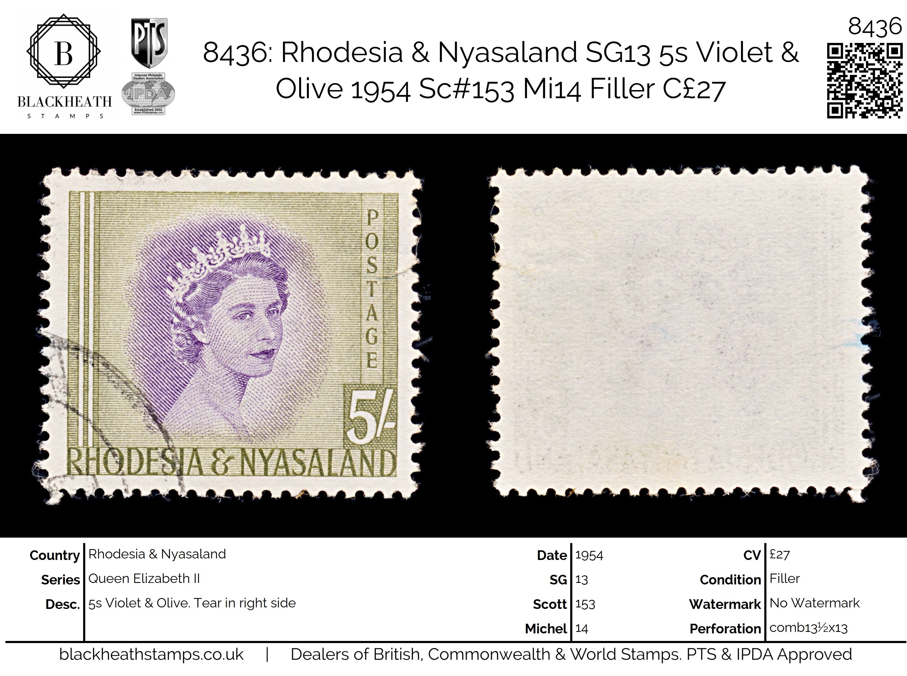 8436: Rhodesia & Nyasaland SG13 5s Violet & Olive 1954 Sc#153 Mi14 Filler C£27: Tear in right side