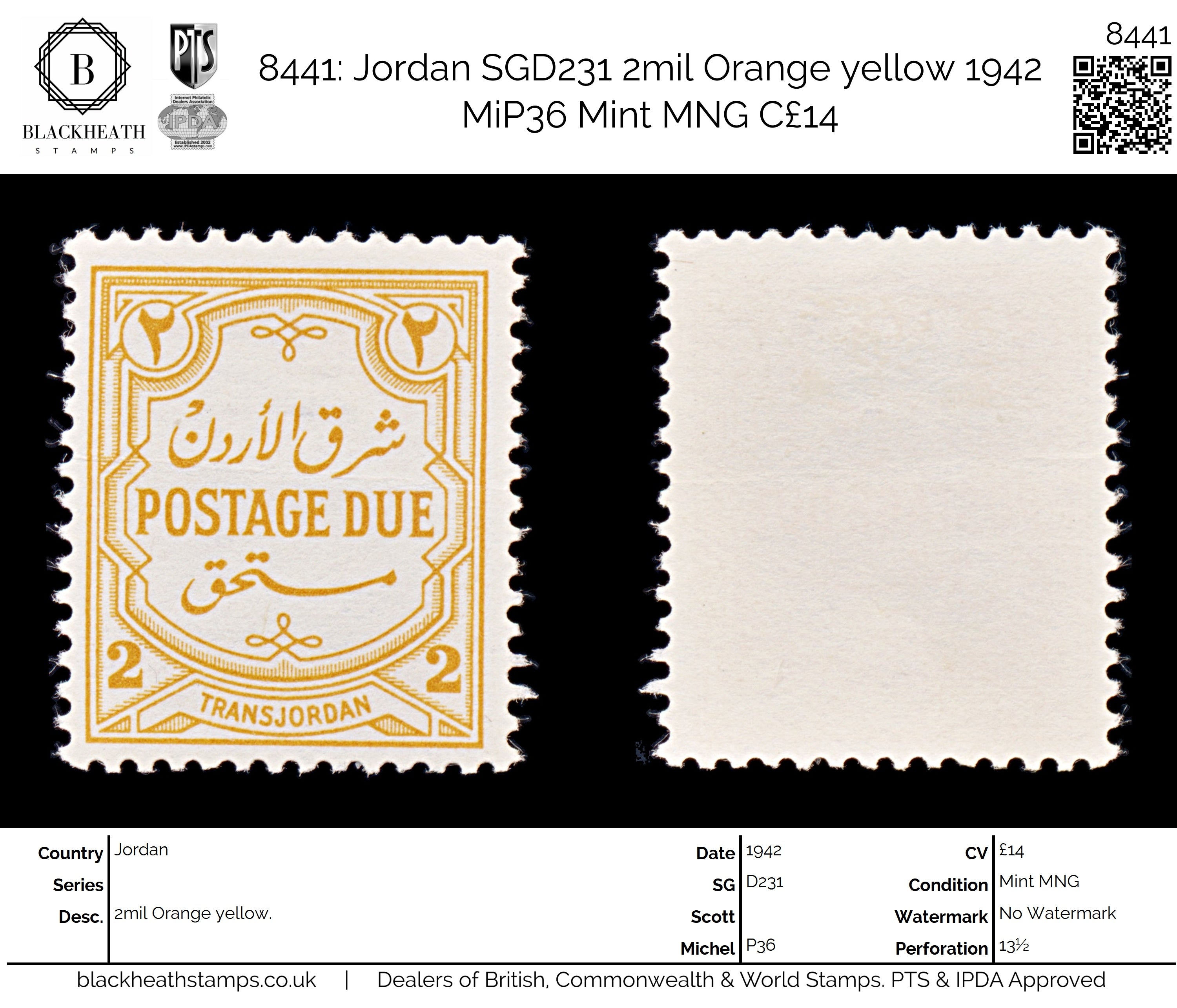 8441: Jordan SGD231 2mil Orange yellow 1942 MiP36 Mint MNG C£14