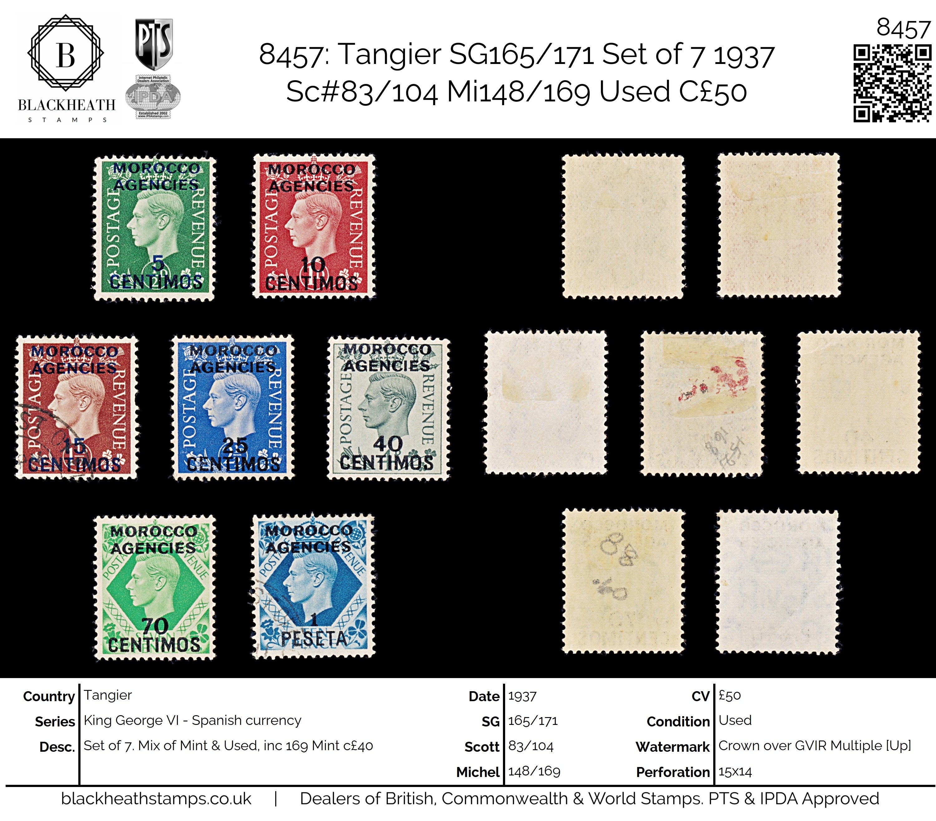 8457: Tangier SG165/171 Set of 7 1937 Sc#83/104 Mi148/169 Uséd C£50: Mix of Mint & Uséd, inc 169 Mint c£40