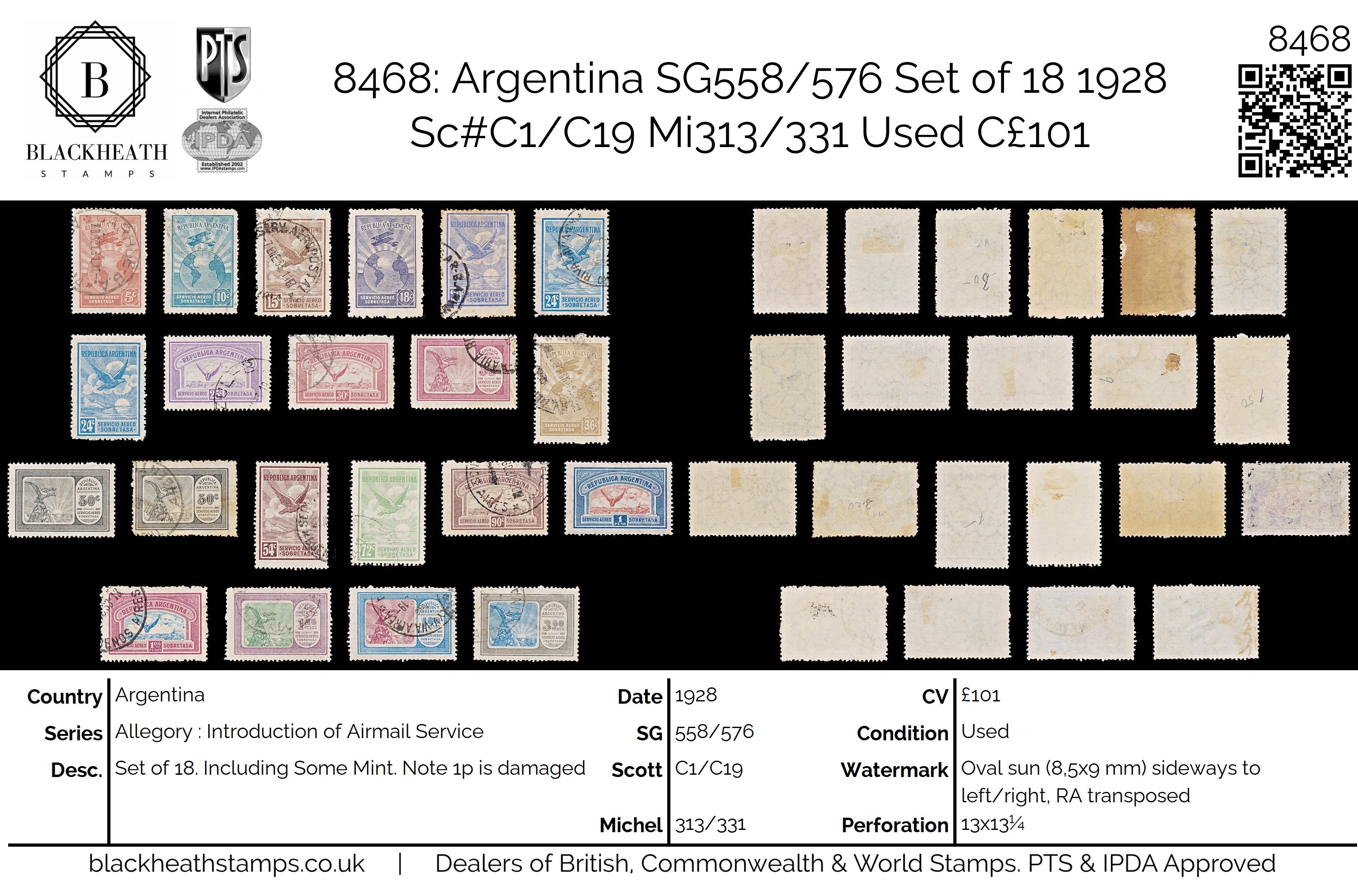 8468: Argentina SG558/576 Set of 18 1928 Sc#C1/C19 Mi313/331 Used C£101
