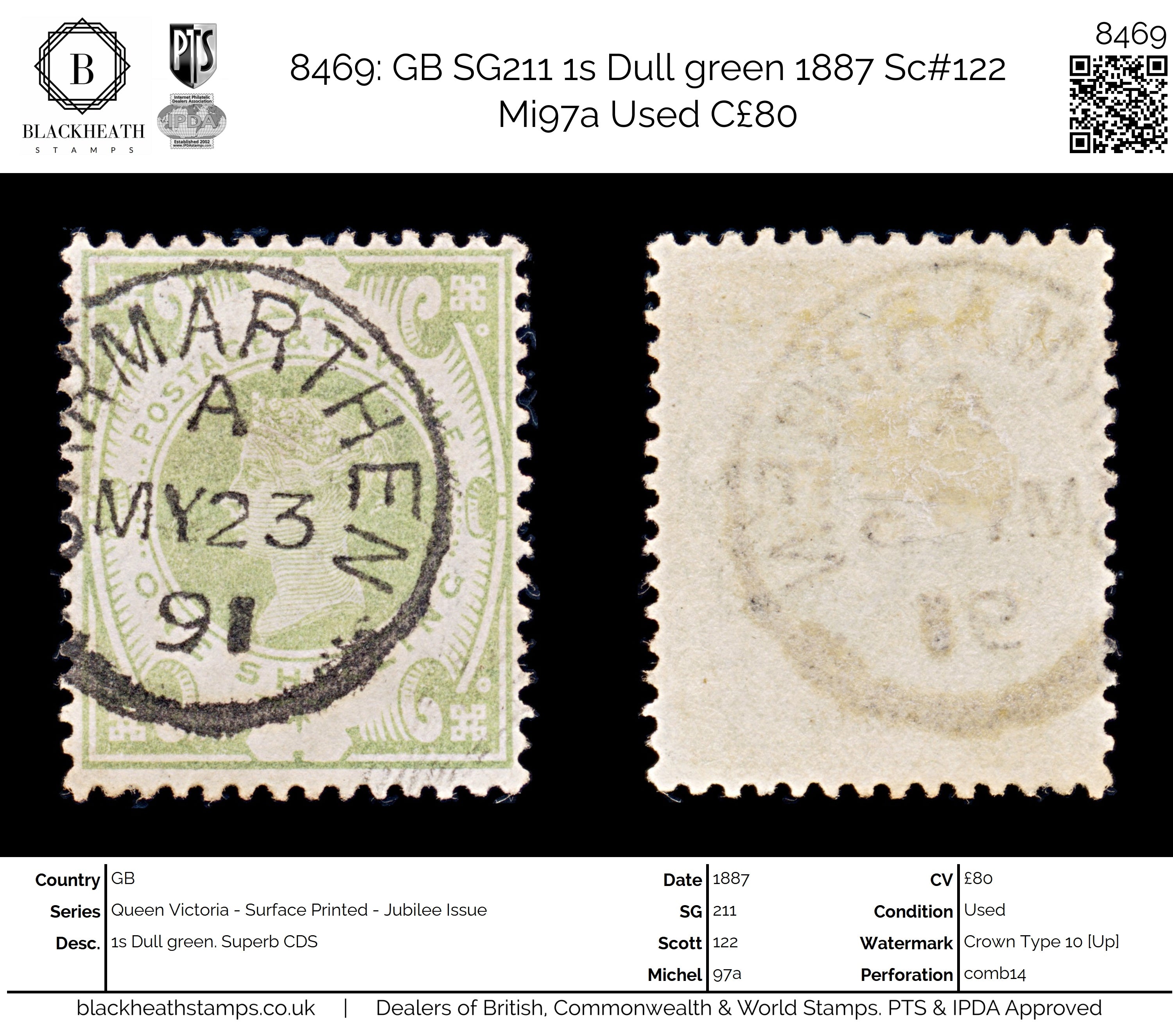 8469: GB SG211 1s Dull green 1887 Sc#122 Mi97a Uséd C£80: Superb CDS