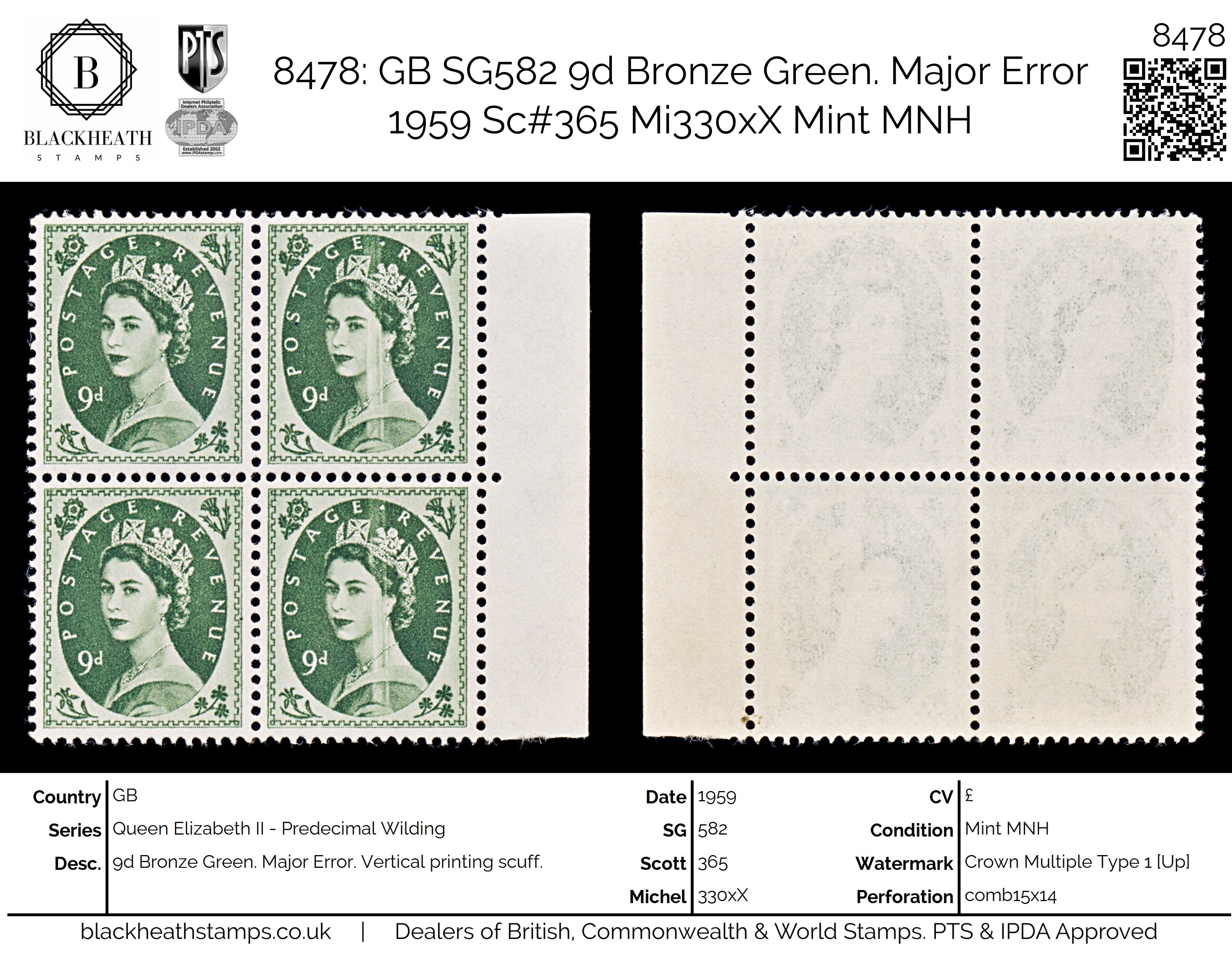 8478: GB SG582 9d Bronze Green. Major Error 1959 Sc#365 Mi330xX Mint MNH: Vertical printing scuff.