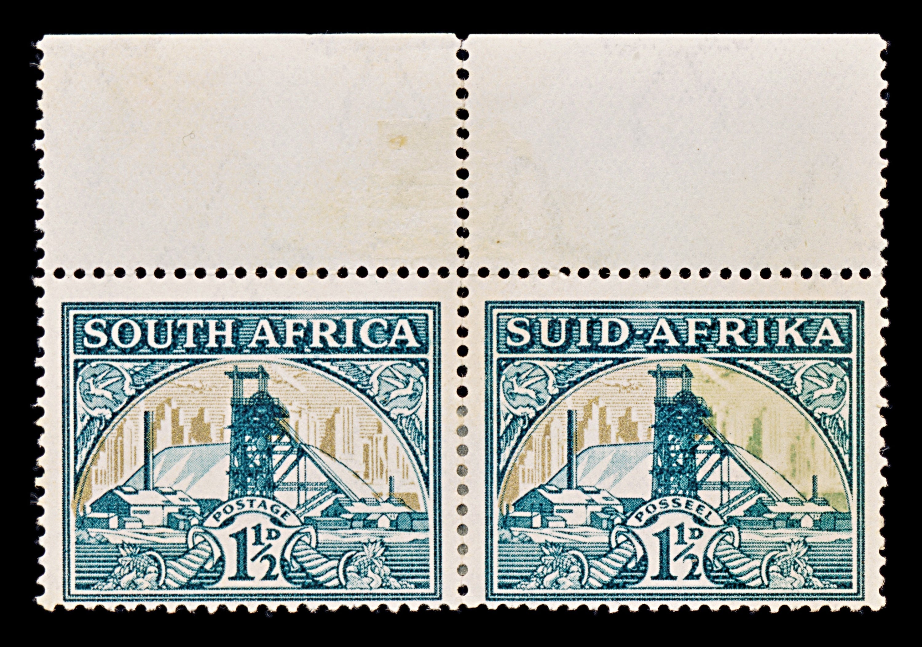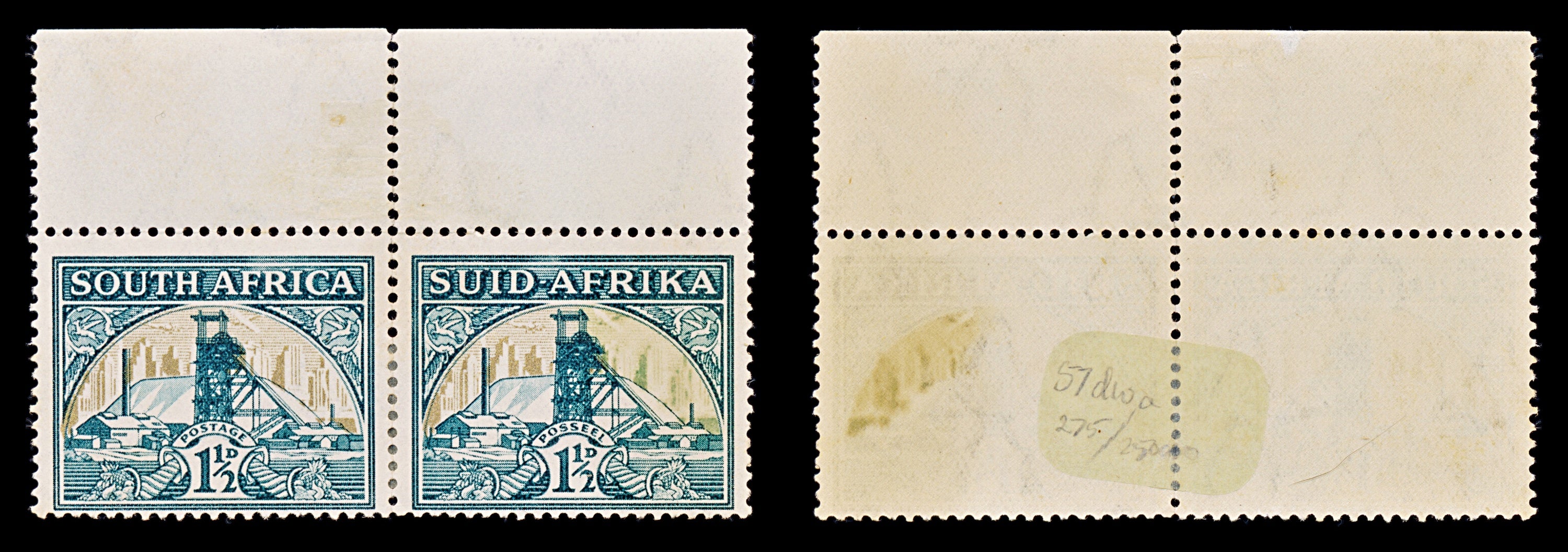 8483: South Africa SG57 1½d. Missing Gold. Wmk Inv 1936 Sc#51 Mi79-80 Mint MH C£275: Inverted Watermark. Gold shading partially missing. Possibly SG57dwa c£25,000