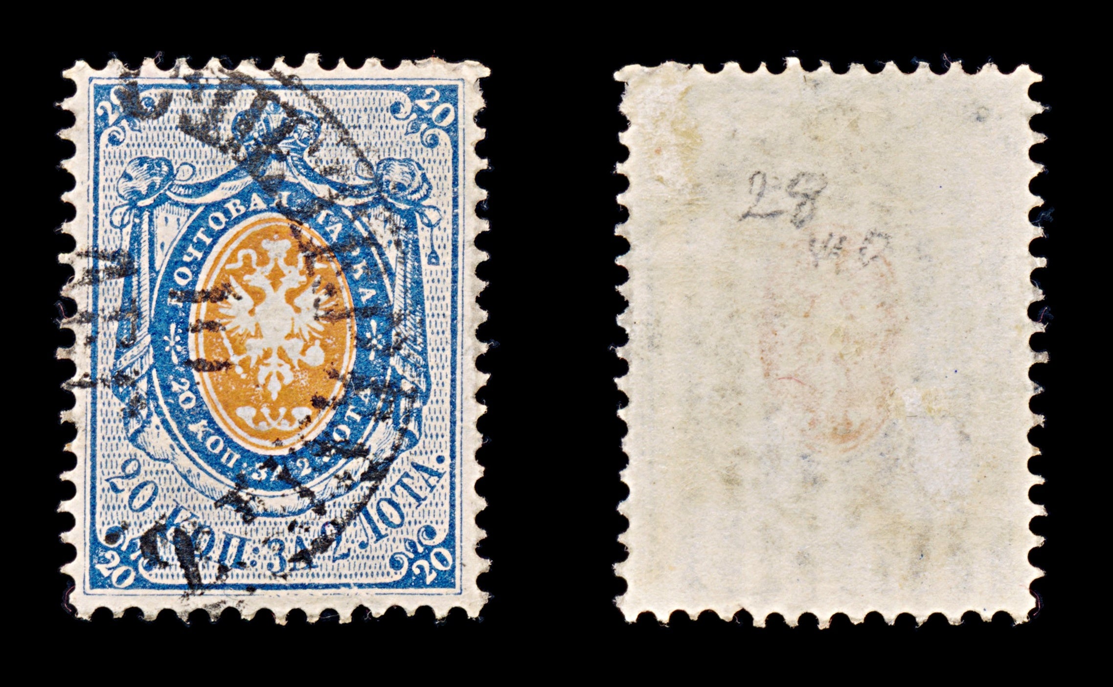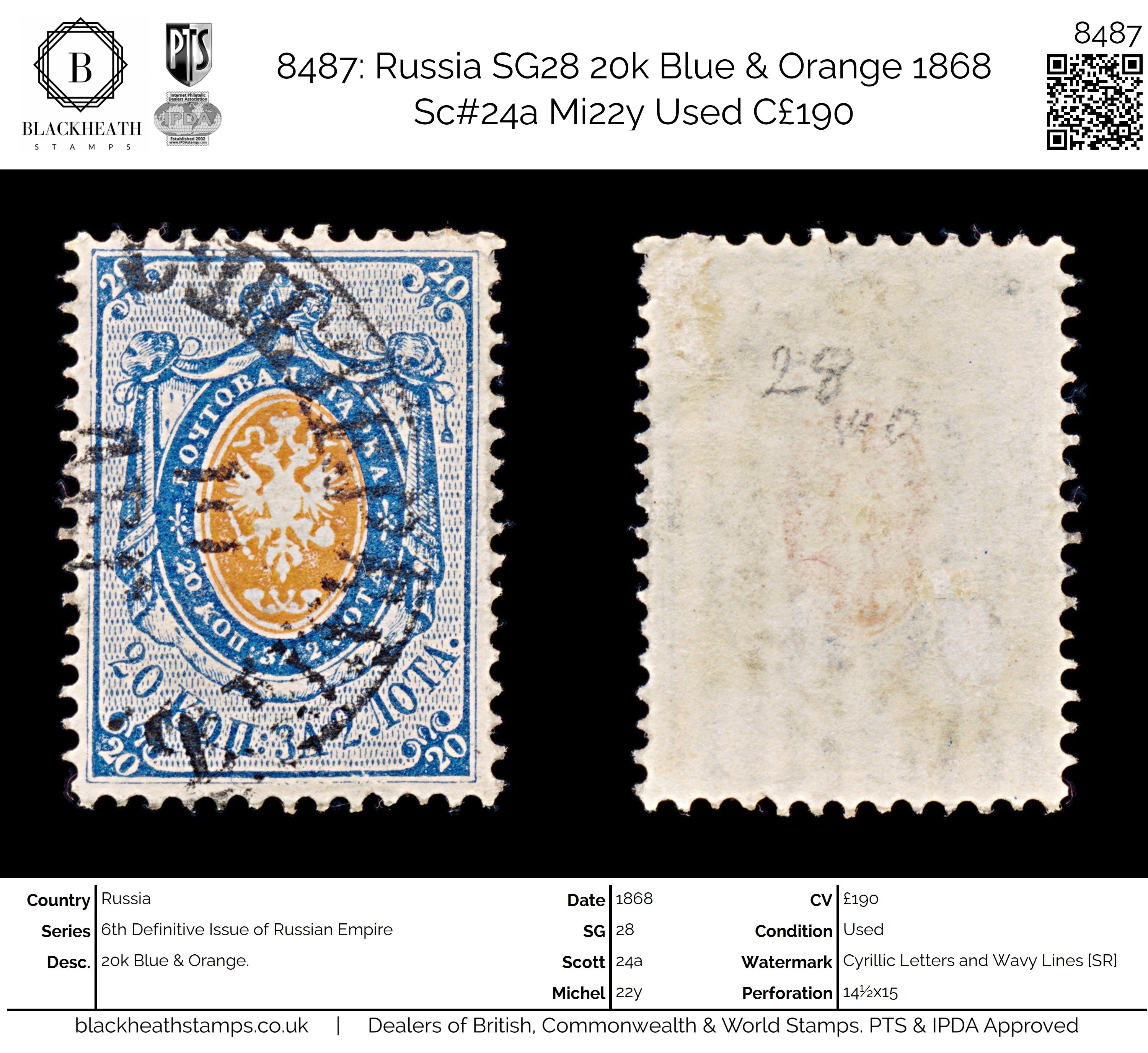 8487: Russia SG28 20k Blue & Orange 1868 Sc#24a Mi22y Uséd C£190