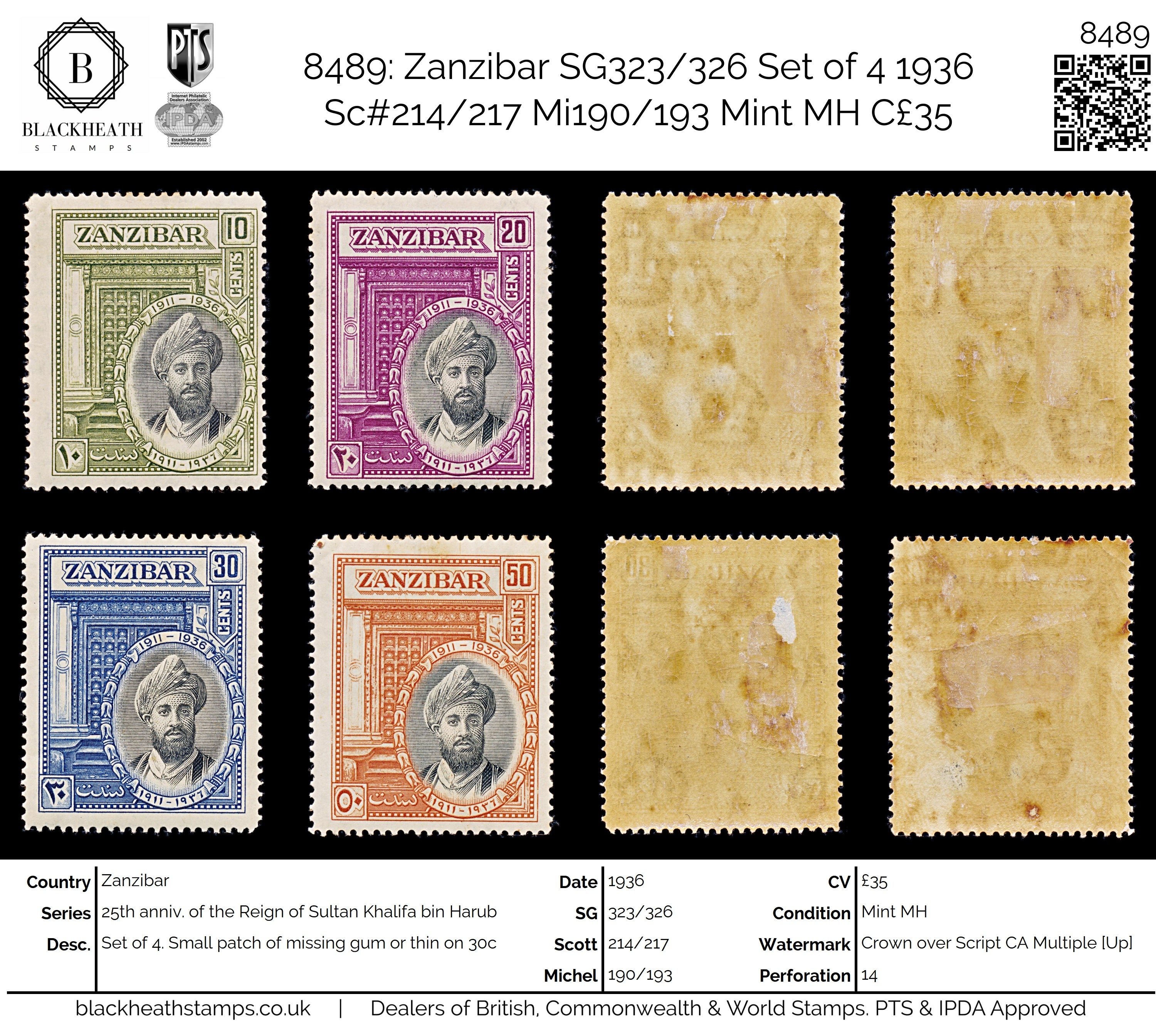 8489: Zanzibar SG323/326 Set of 4 1936 Sc#214/217 Mi190/193 Mint MH C£35: Small patch of missing gum or thin on 30c