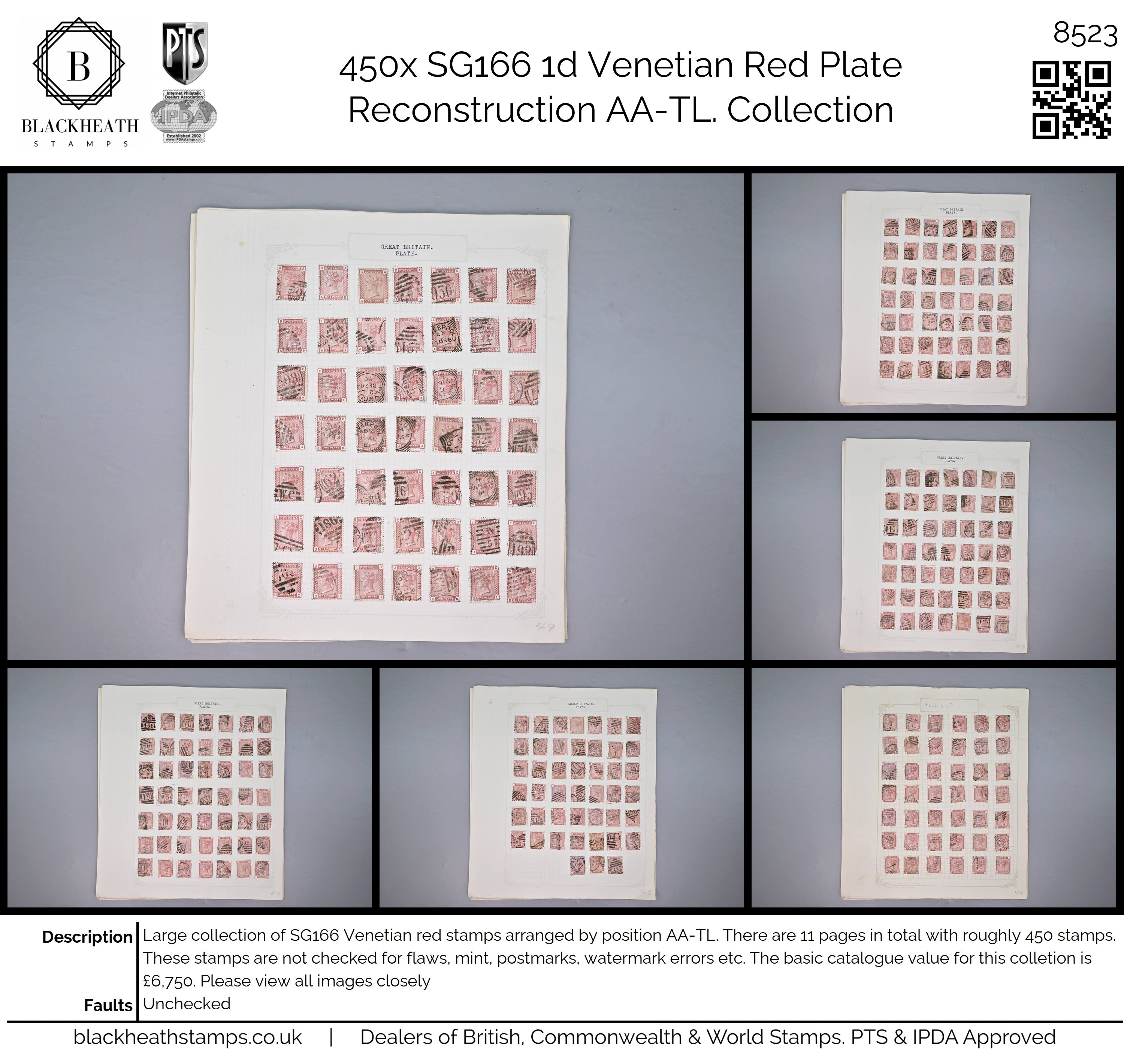Large collection of SG166 Venetian red stamps arranged by position AA-TL. There are 11 pages in total with roughly 450 stamps. These stamps are not checked for flaws, mint, postmarks, watermark errors etc. The basic catalogue value for this colletion is £6,750. Please view all images closely |