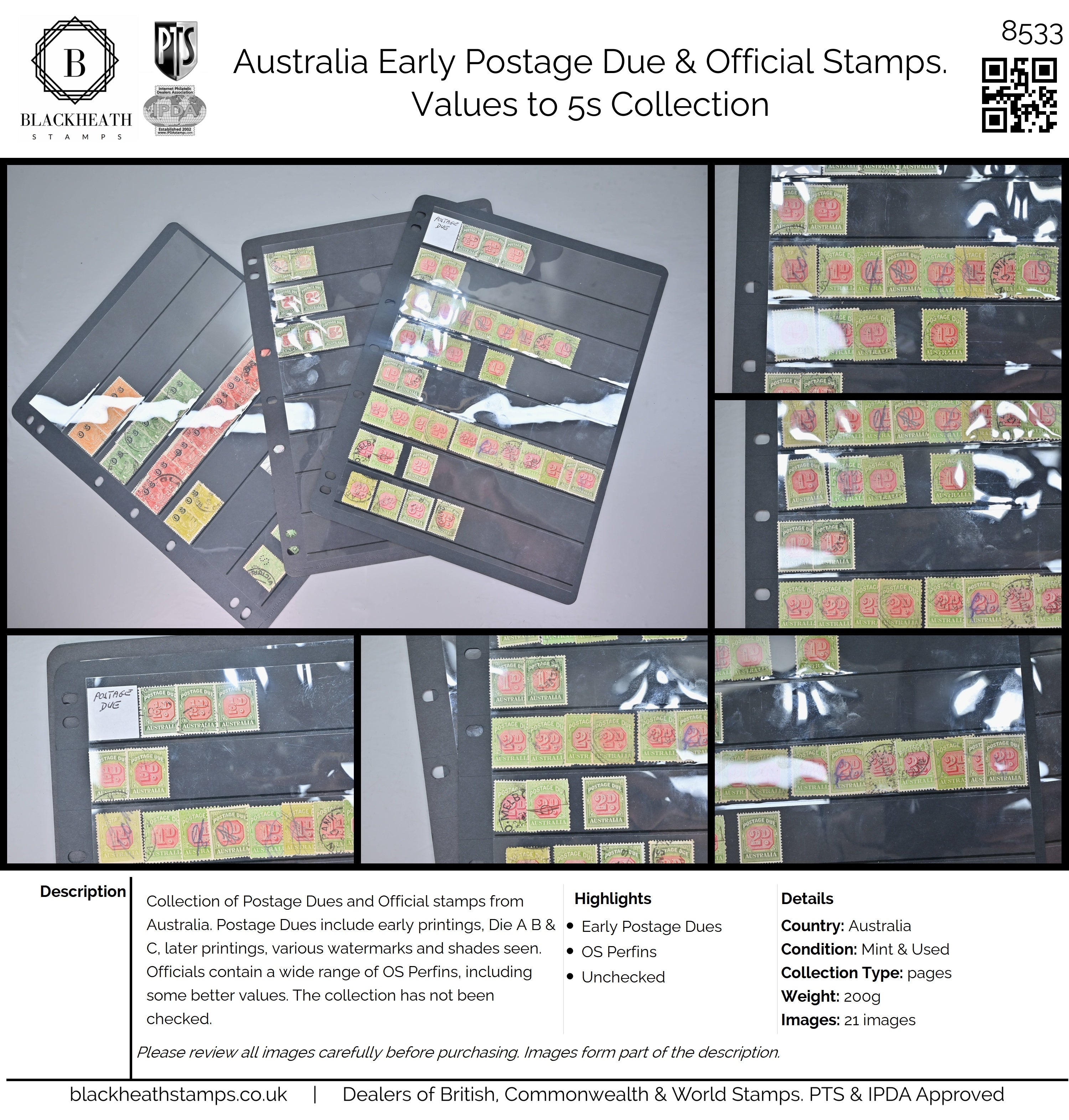 Collection of Postage Dues and Official stamps from Australia. Postage Dues include early printings, Die A B & C, later printings, various watermarks and shades seen. Officials contain a wide range of OS Perfins, including some better values. The collection has not been checked. |