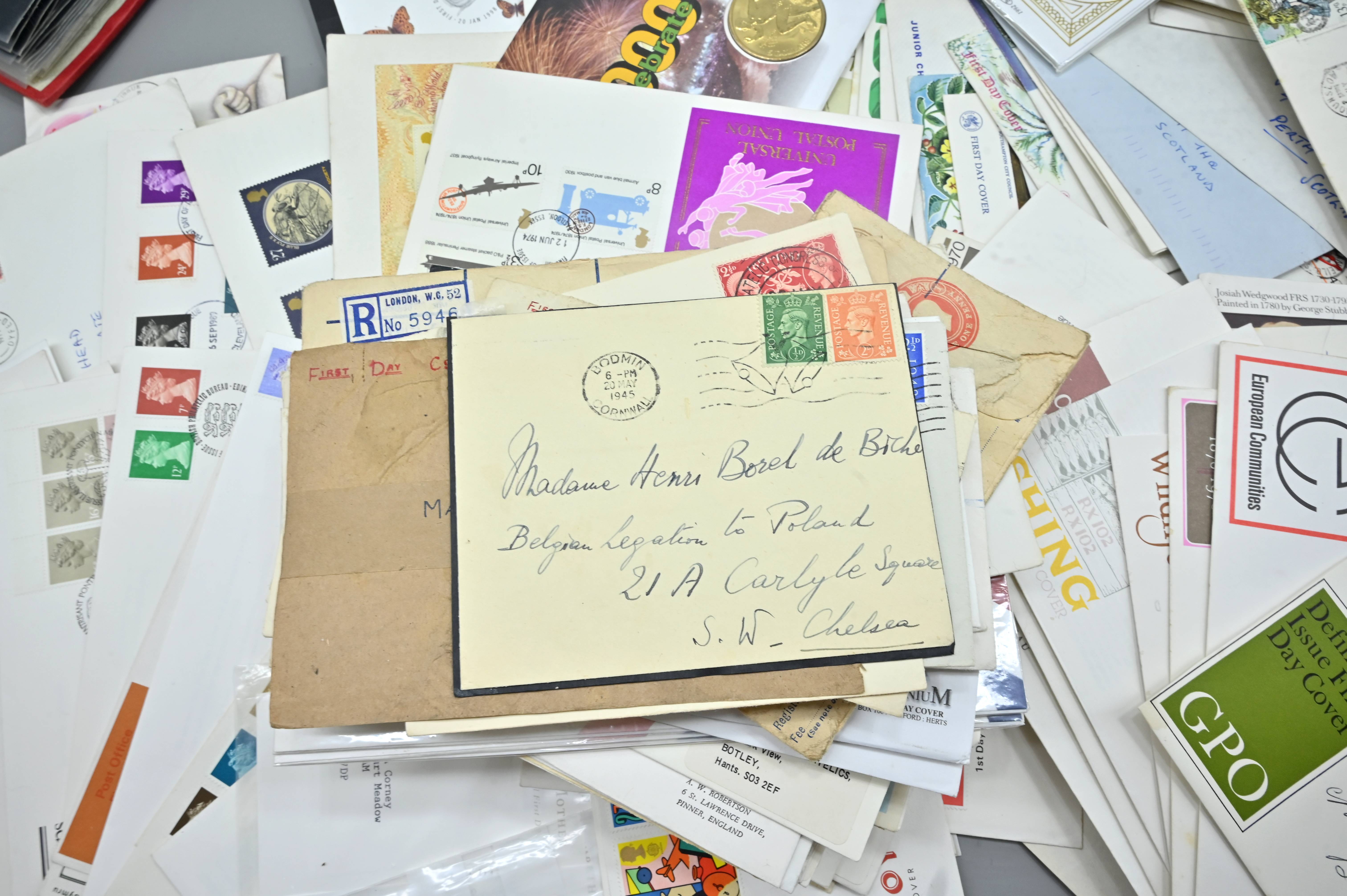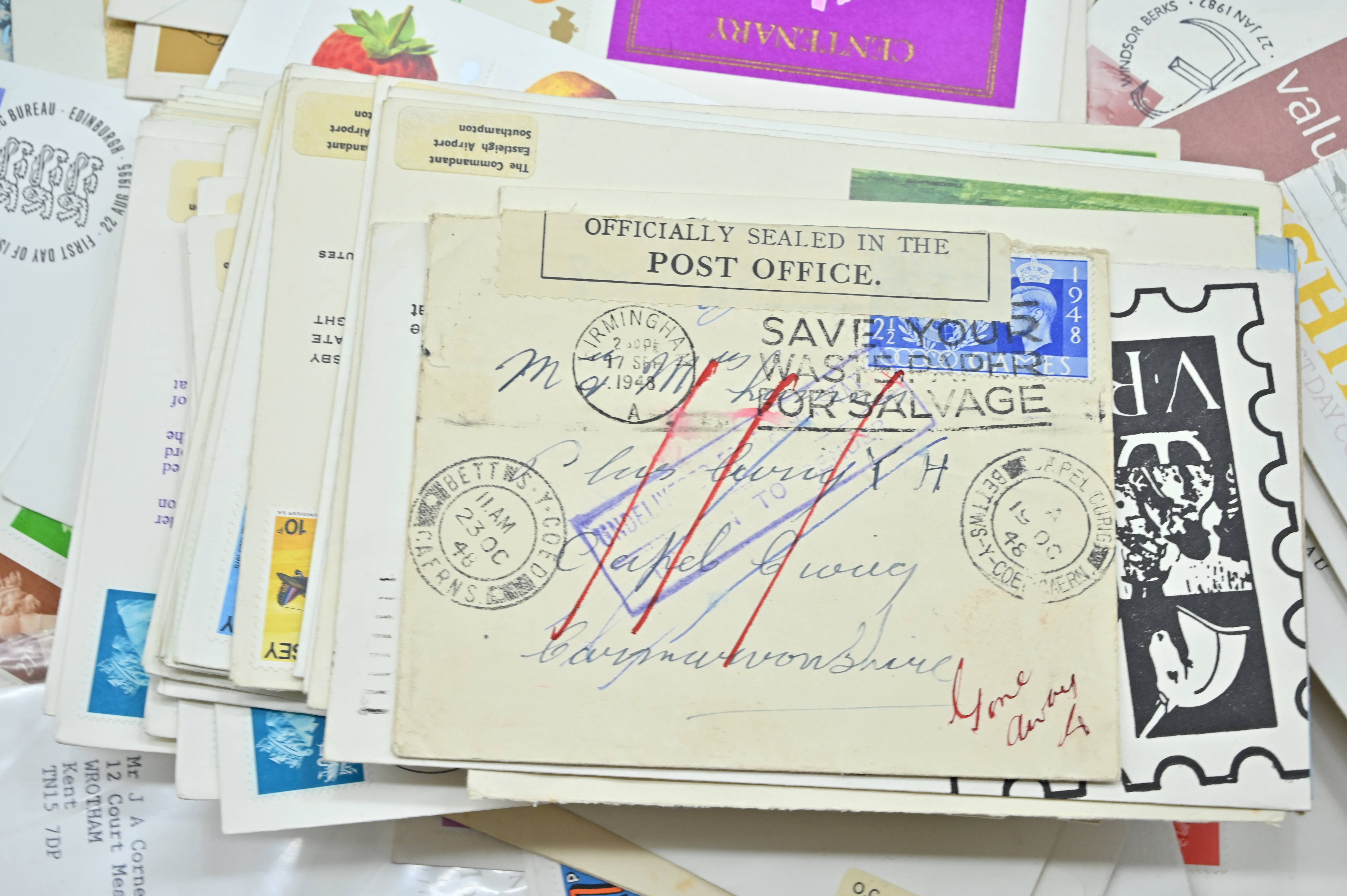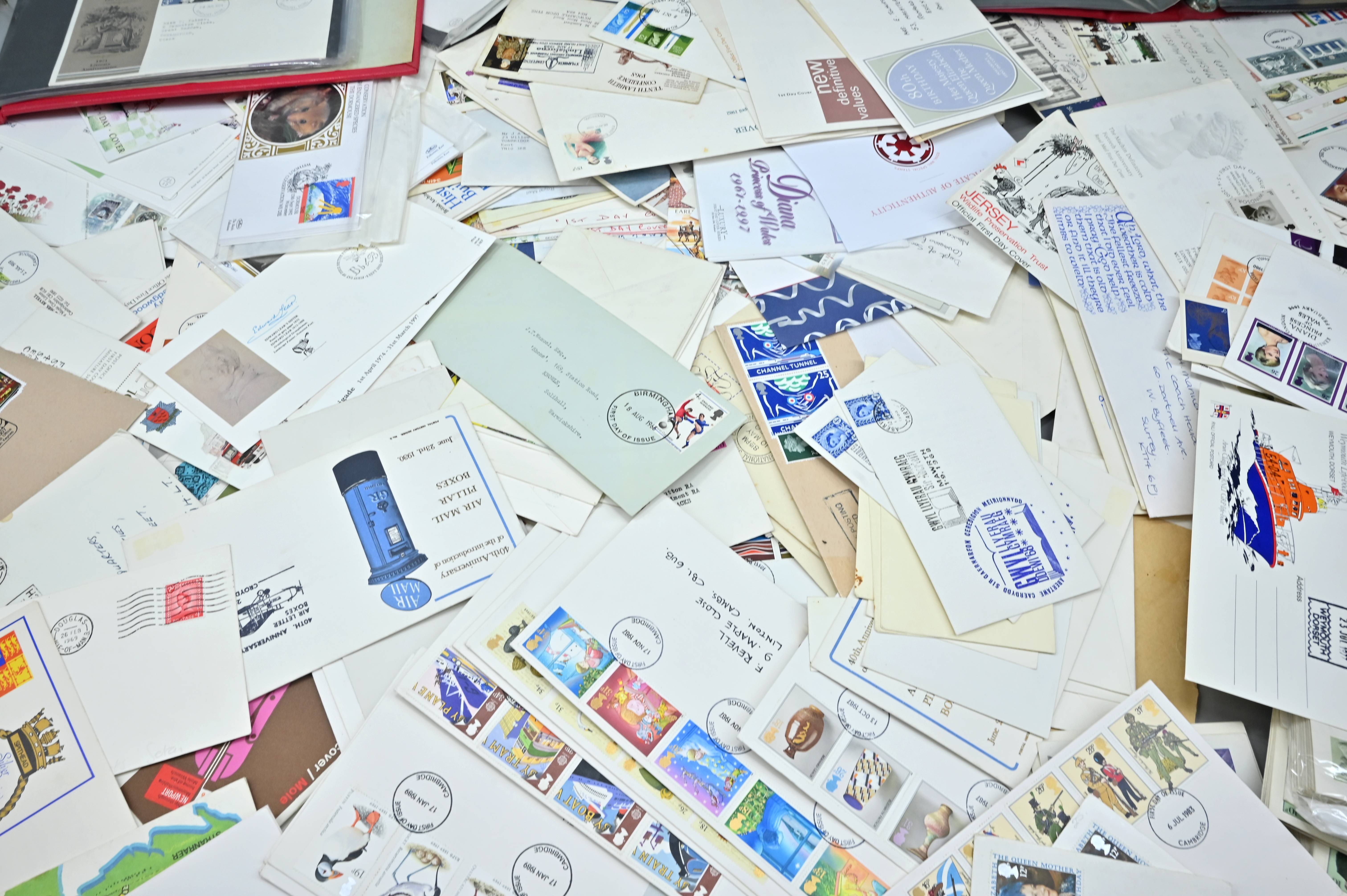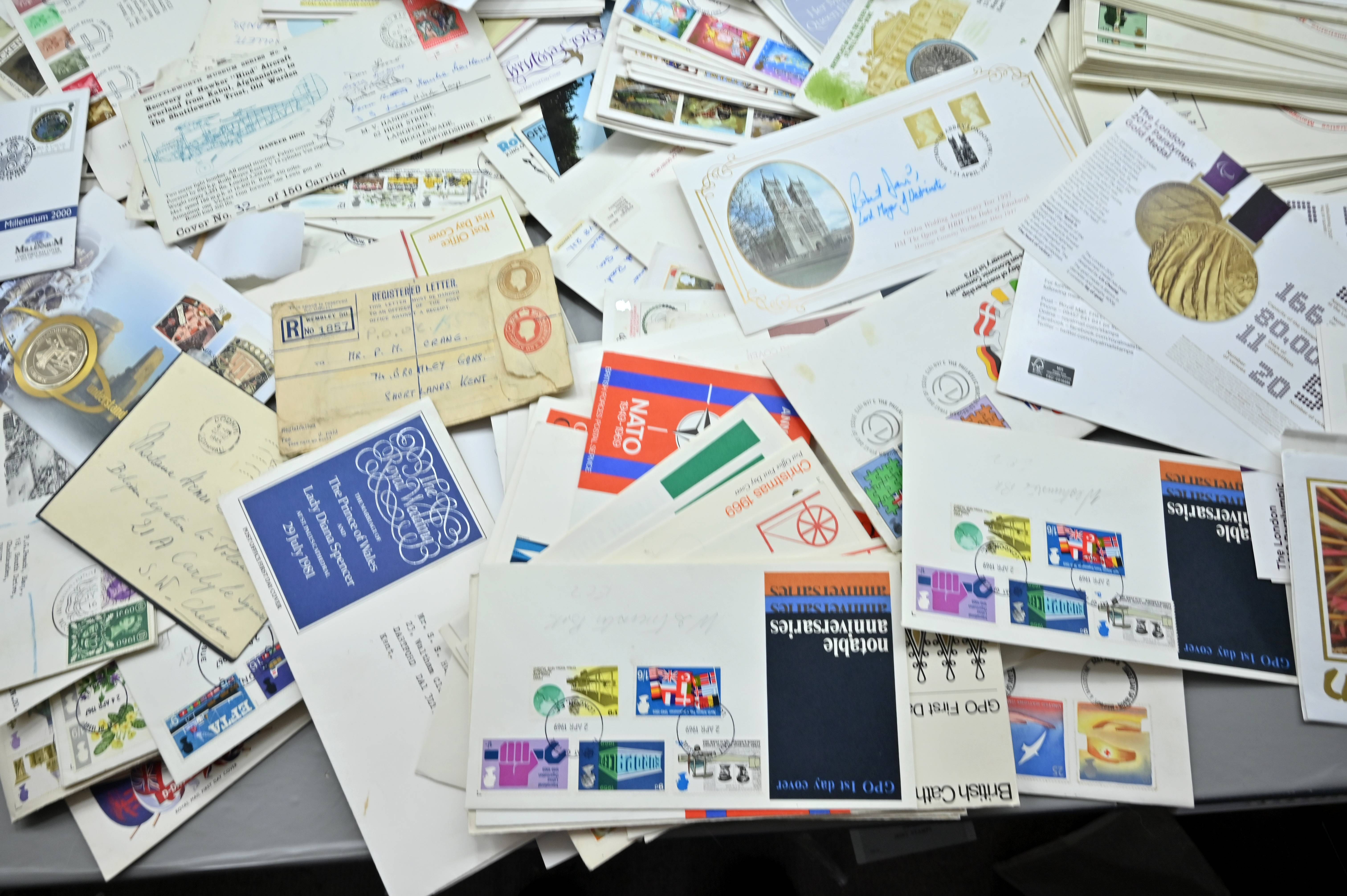 Description: Massive box filled with over 1000 covers, including FDC's of all eras, high value definitives, modern FDC's with values to £5, pre decimal covers with values up to 5 shillings, multi-reign covers, good selection of early KGVI covers, coin covers, many flight train and boat covers, including scarce signed WWII covers, many different types of illustrated covers. Some items priced individually. Only a few images of some covers at the top of the pile, many many many hidden gems, and perfect for someone either re-selling or serious cover collector.
