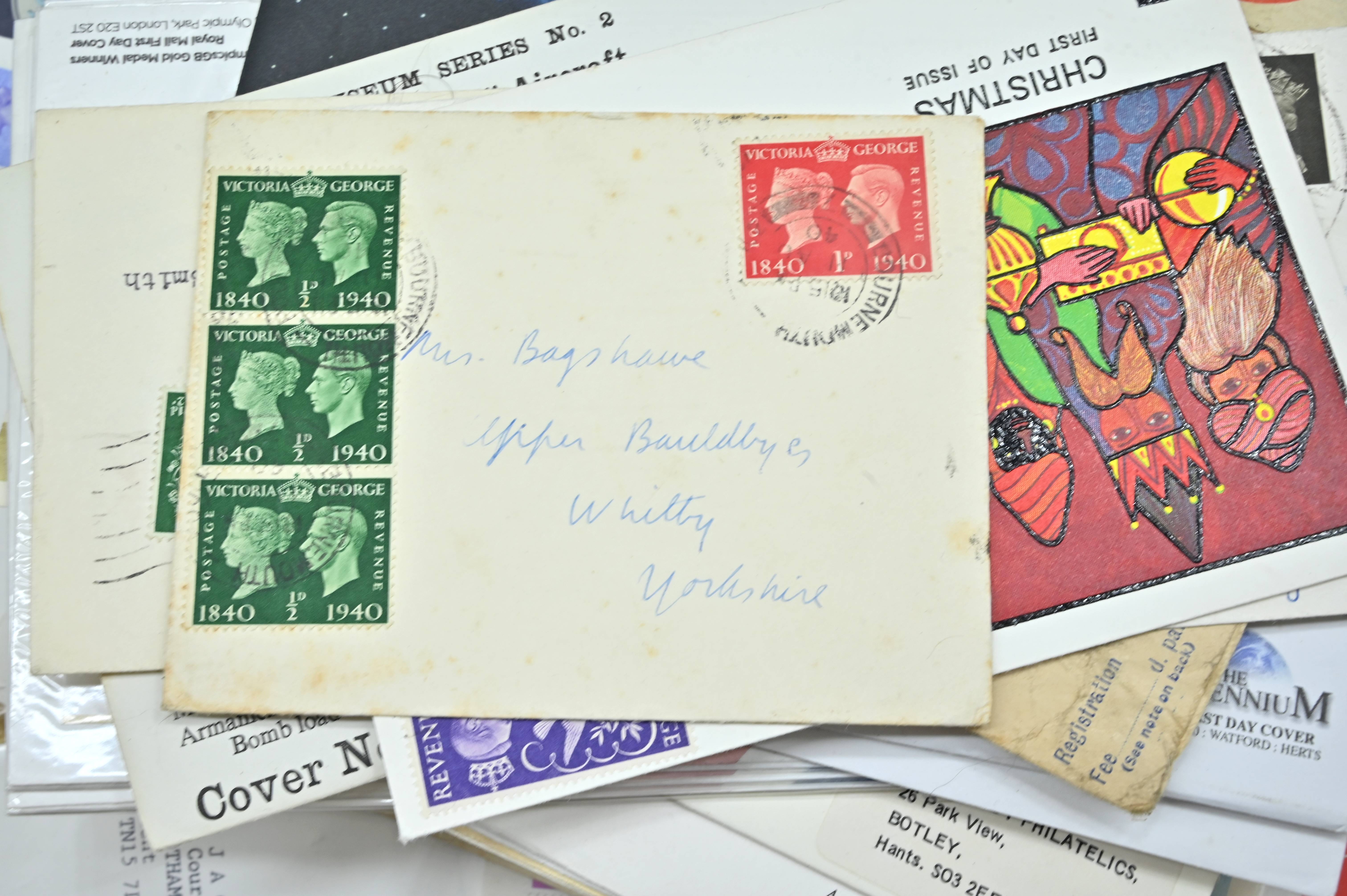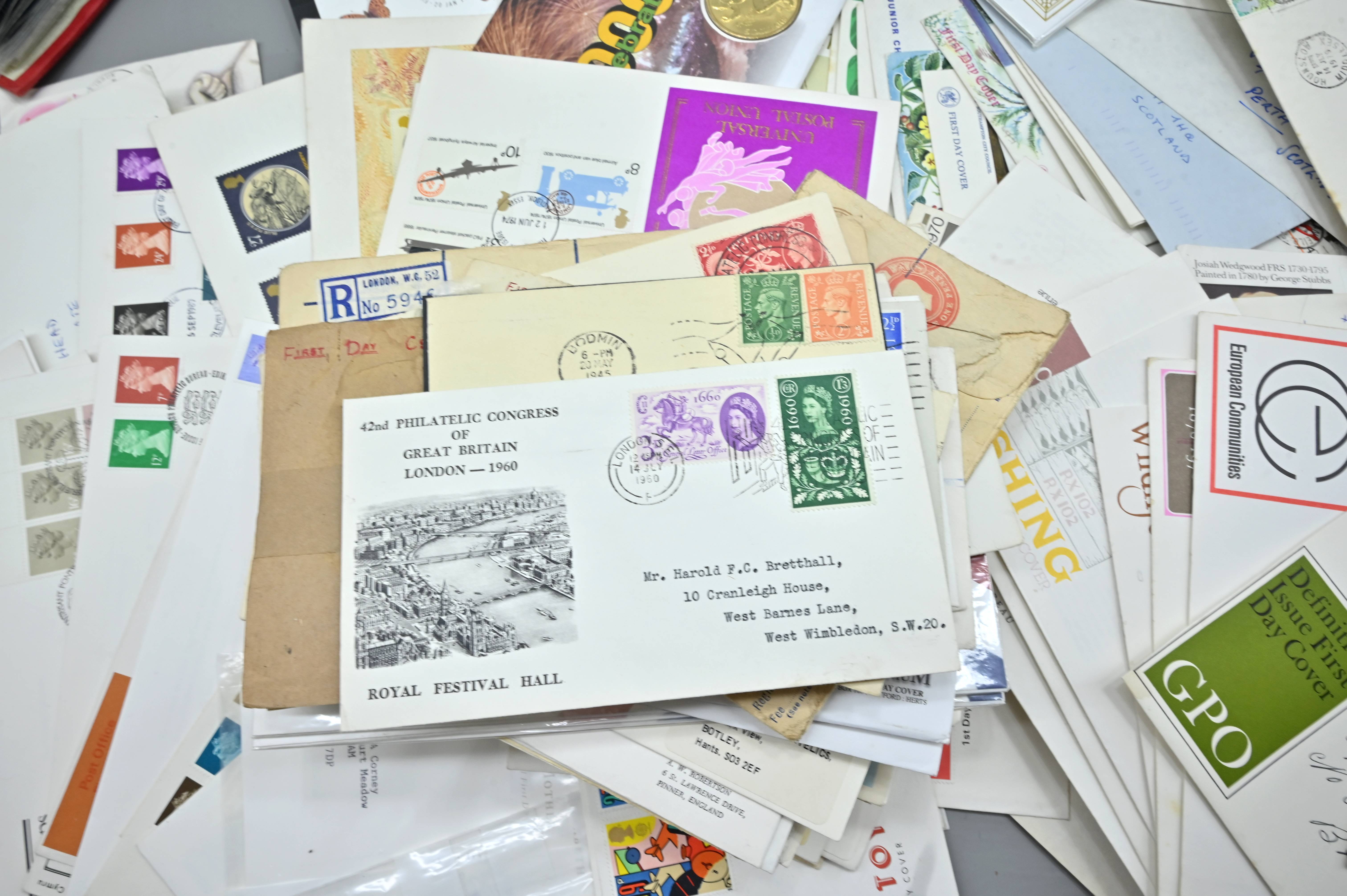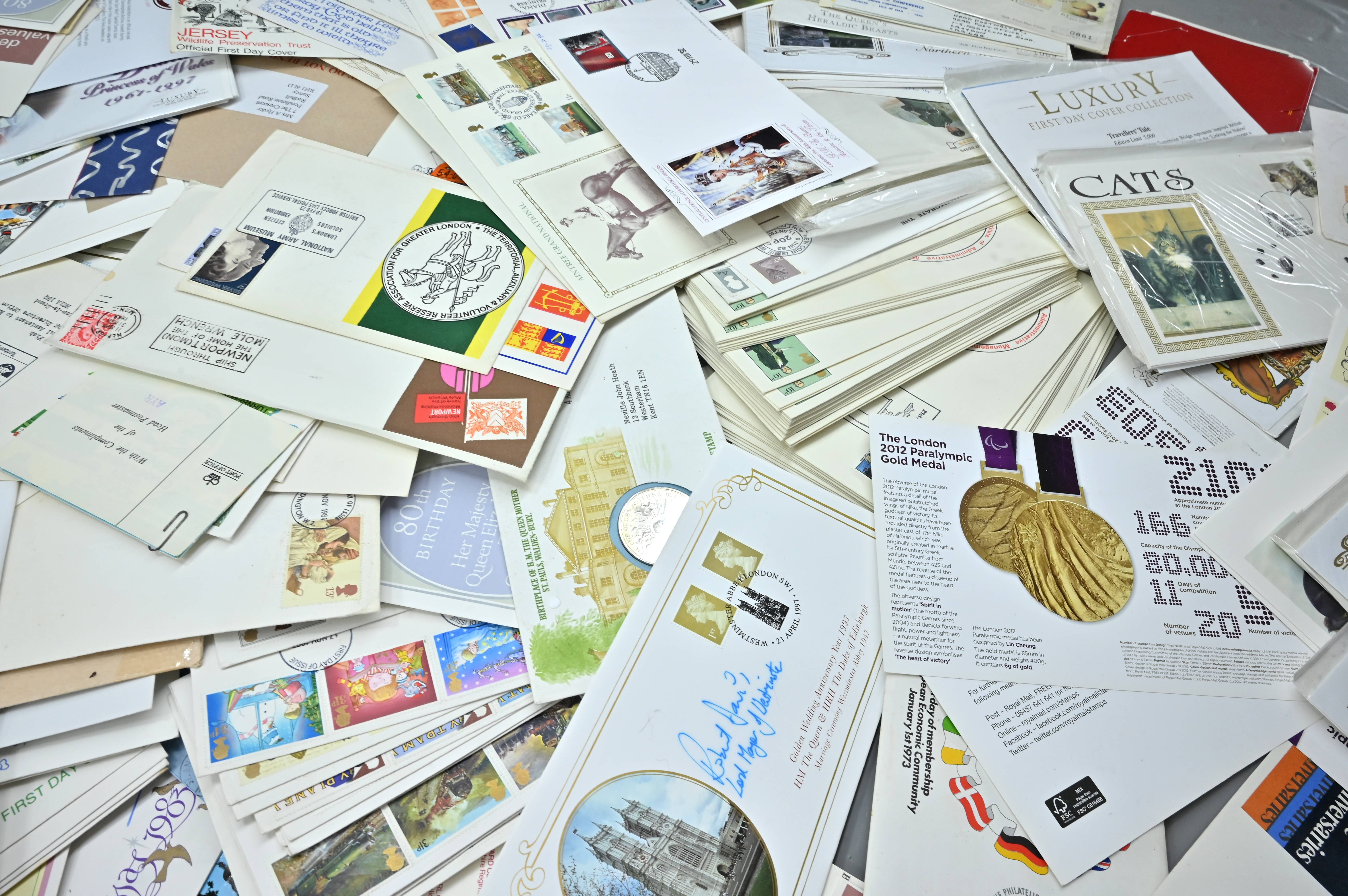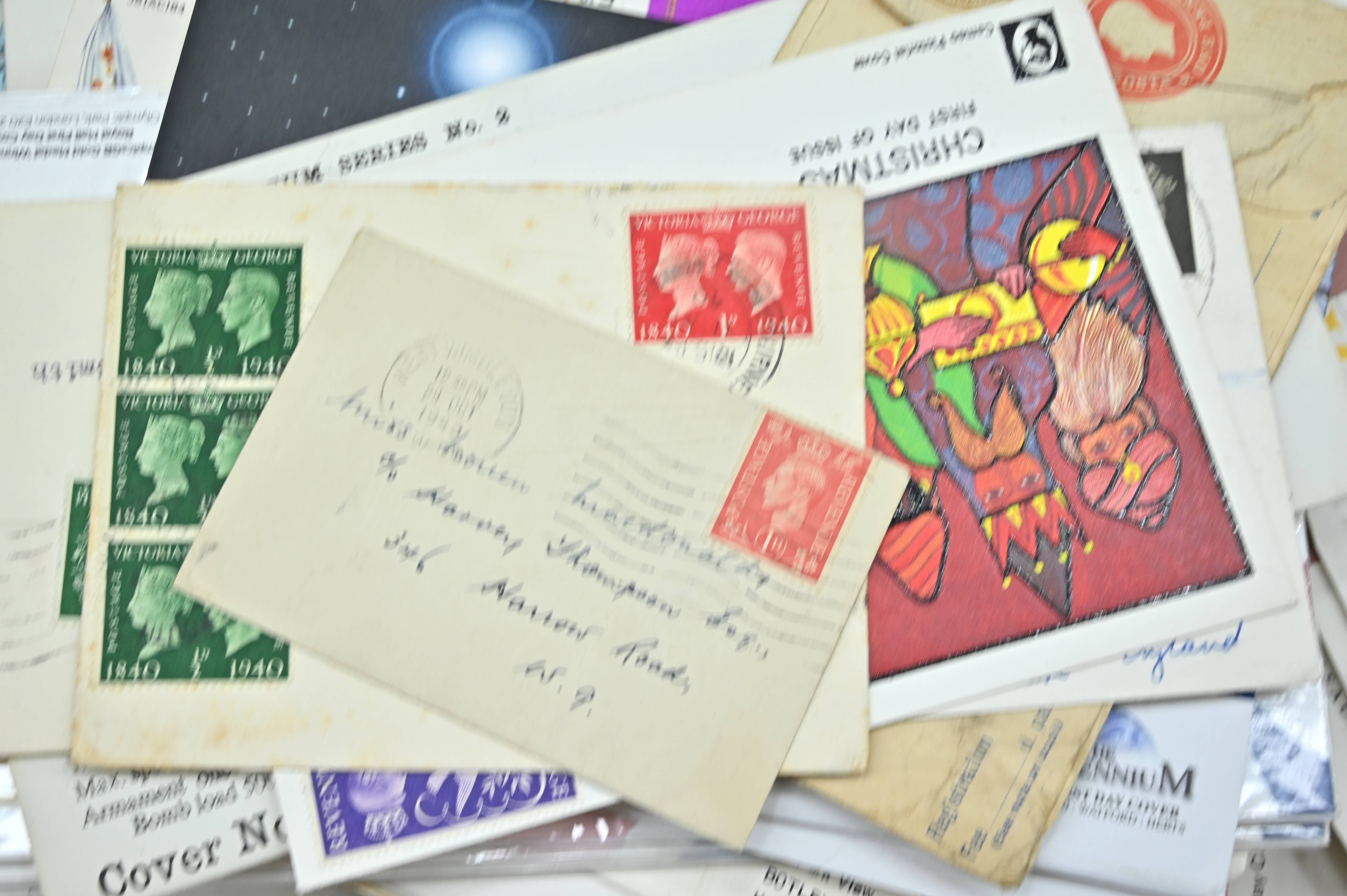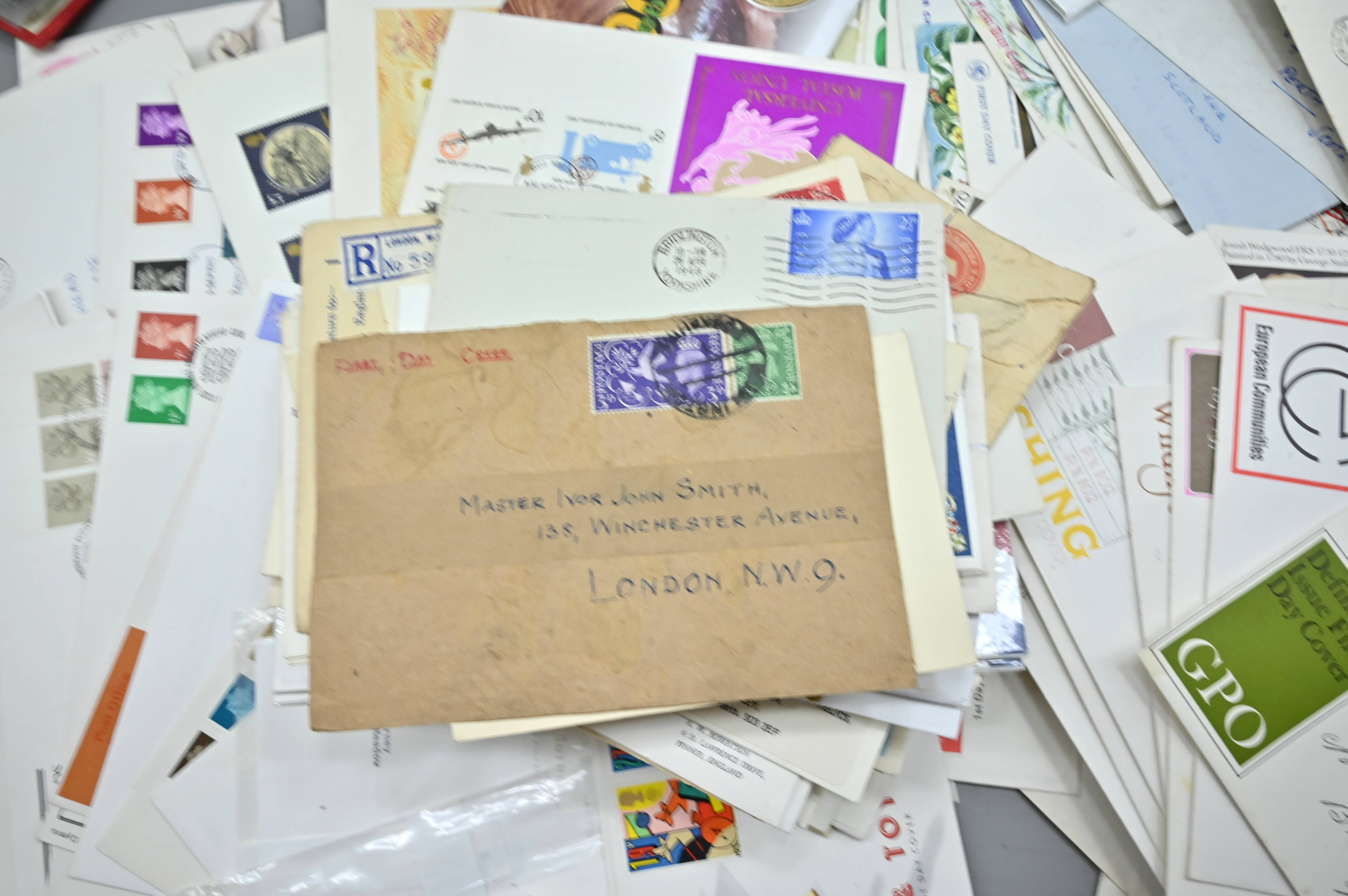 Description: Massive box filled with over 1000 covers, including FDC's of all eras, high value definitives, modern FDC's with values to £5, pre decimal covers with values up to 5 shillings, multi-reign covers, good selection of early KGVI covers, coin covers, many flight train and boat covers, including scarce signed WWII covers, many different types of illustrated covers. Some items priced individually. Only a few images of some covers at the top of the pile, many many many hidden gems, and perfect for someone either re-selling or serious cover collector.