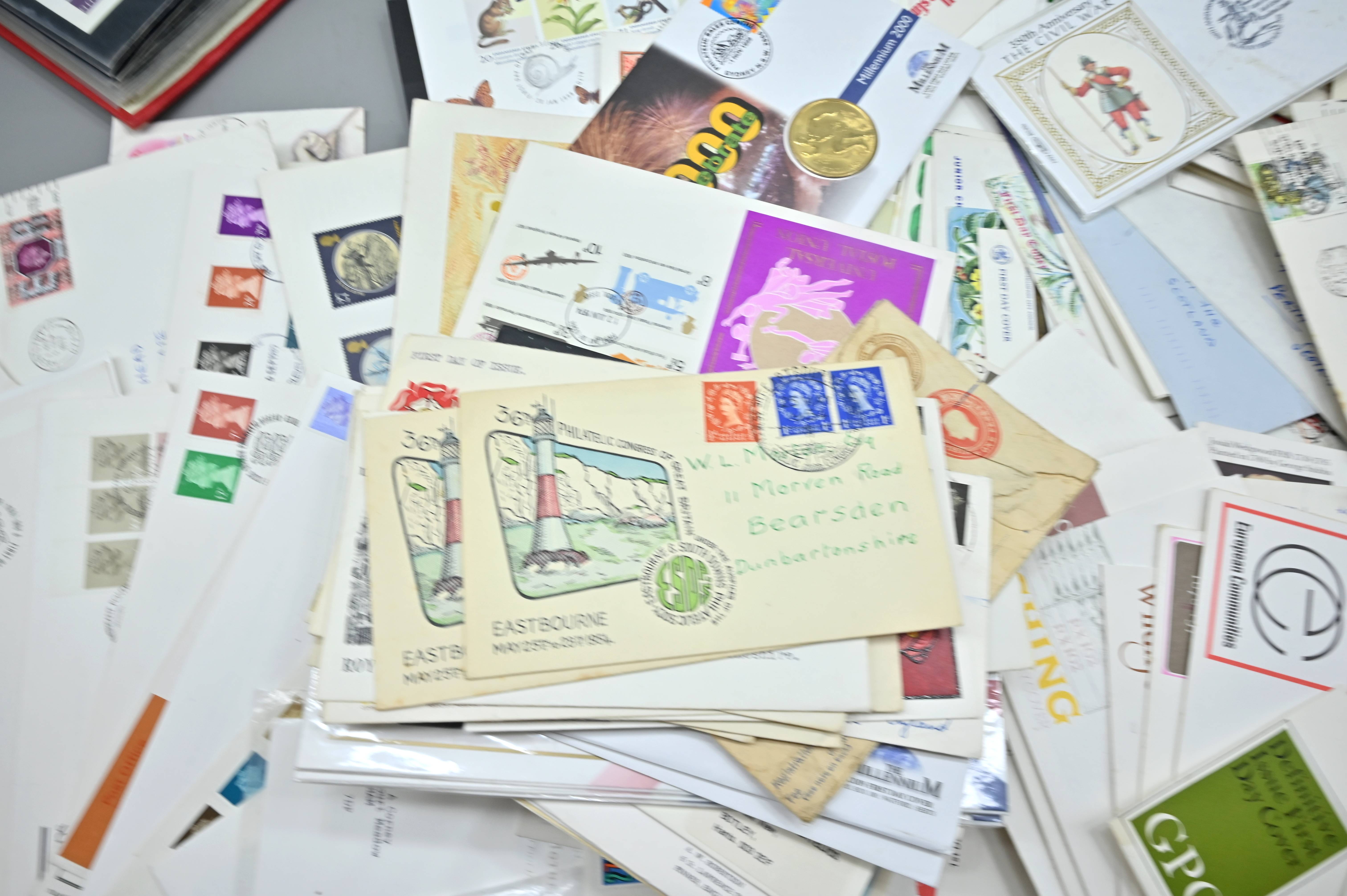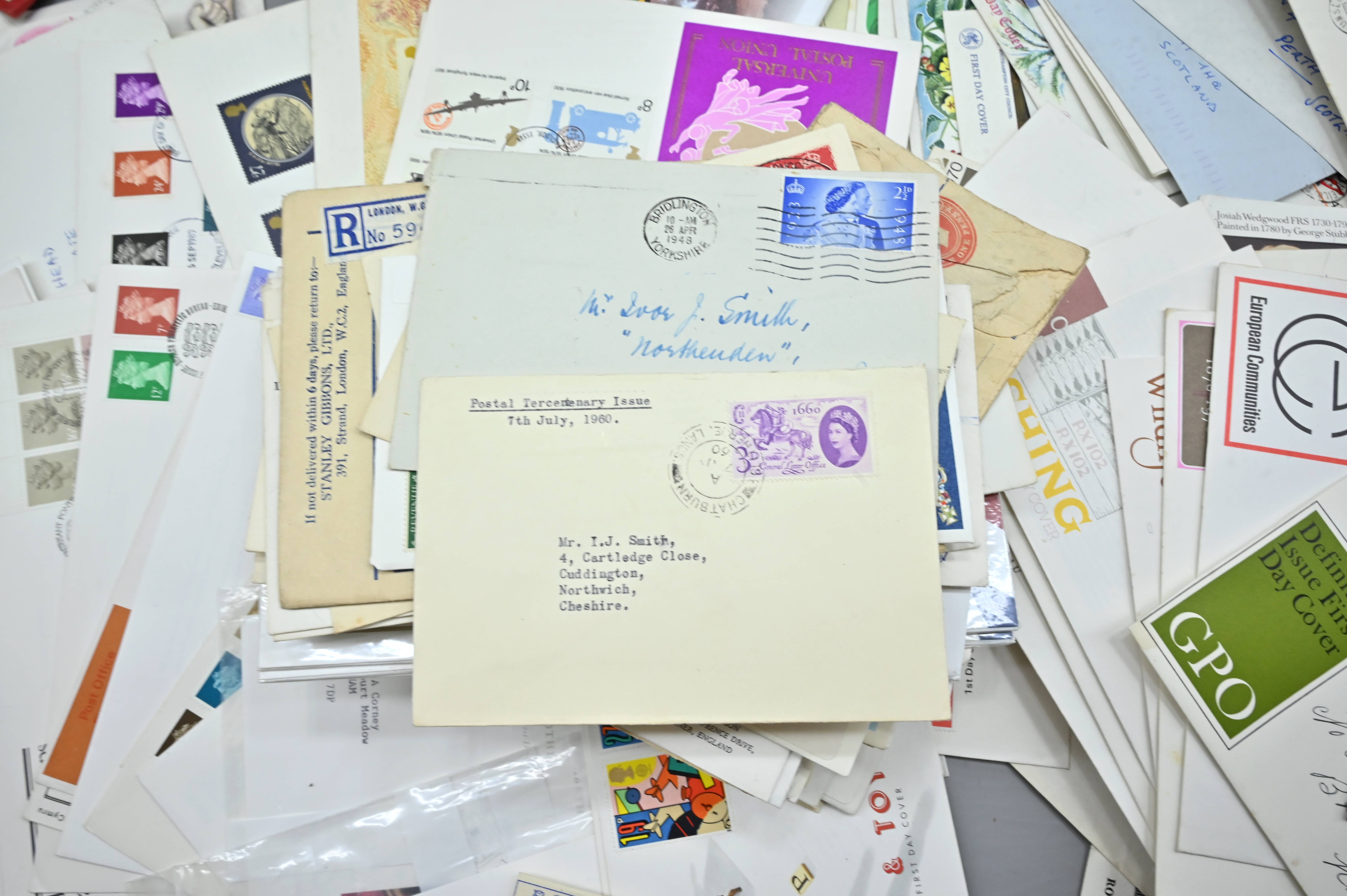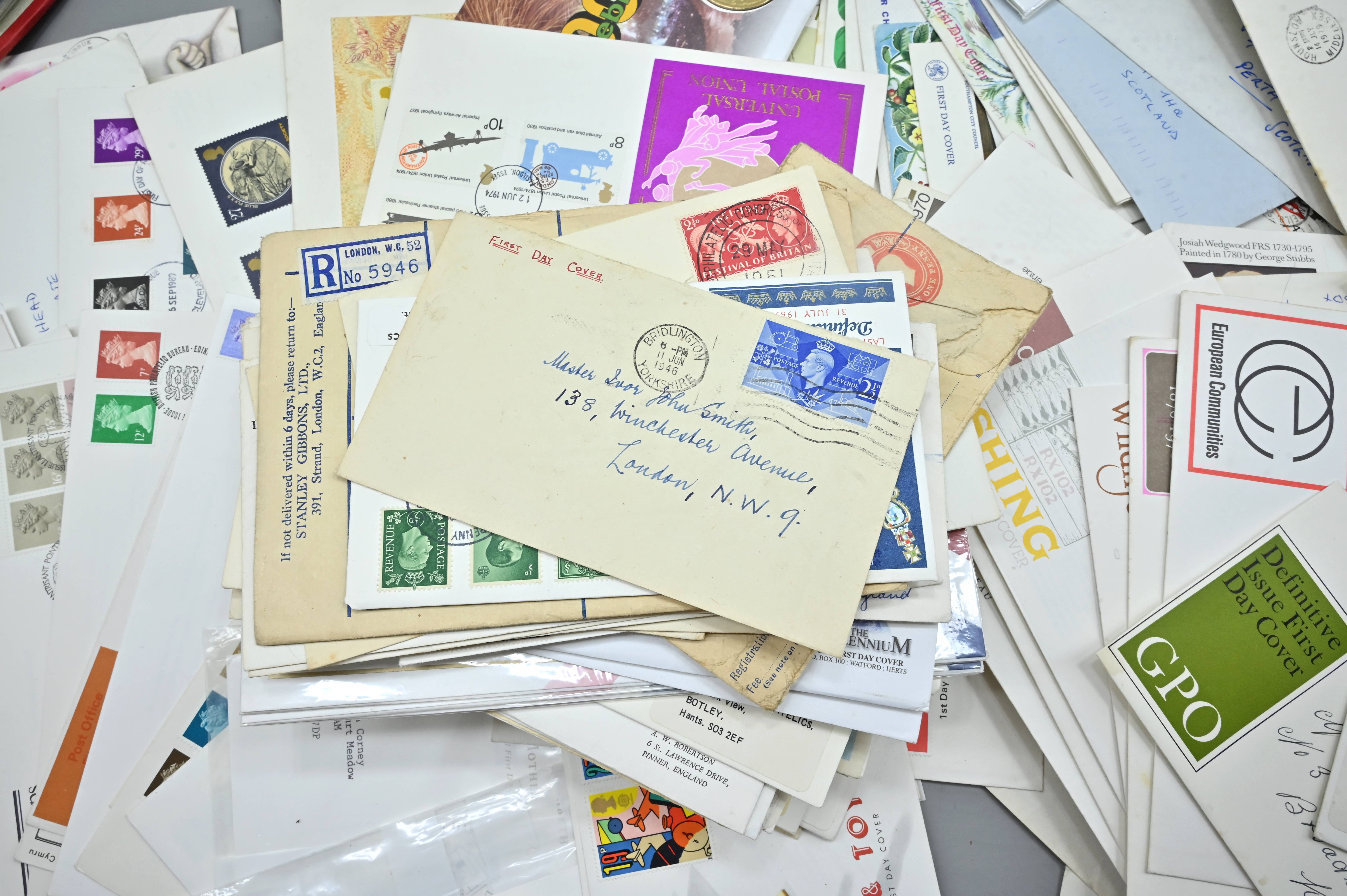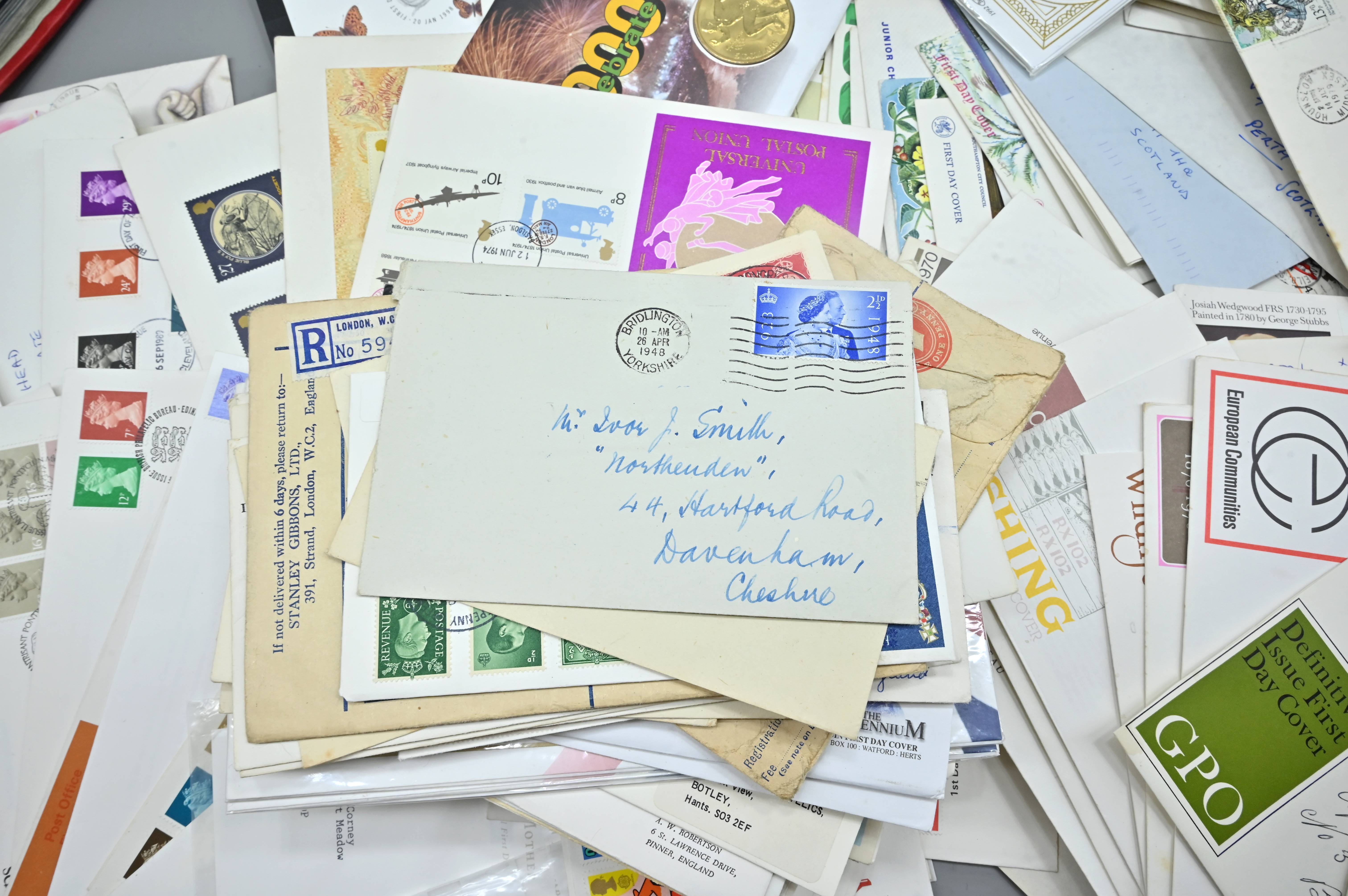Description: Massive box filled with over 1000 covers, including FDC's of all eras, high value definitives, modern FDC's with values to £5, pre decimal covers with values up to 5 shillings, multi-reign covers, good selection of early KGVI covers, coin covers, many flight train and boat covers, including scarce signed WWII covers, many different types of illustrated covers. Some items priced individually. Only a few images of some covers at the top of the pile, many many many hidden gems, and perfect for someone either re-selling or serious cover collector.