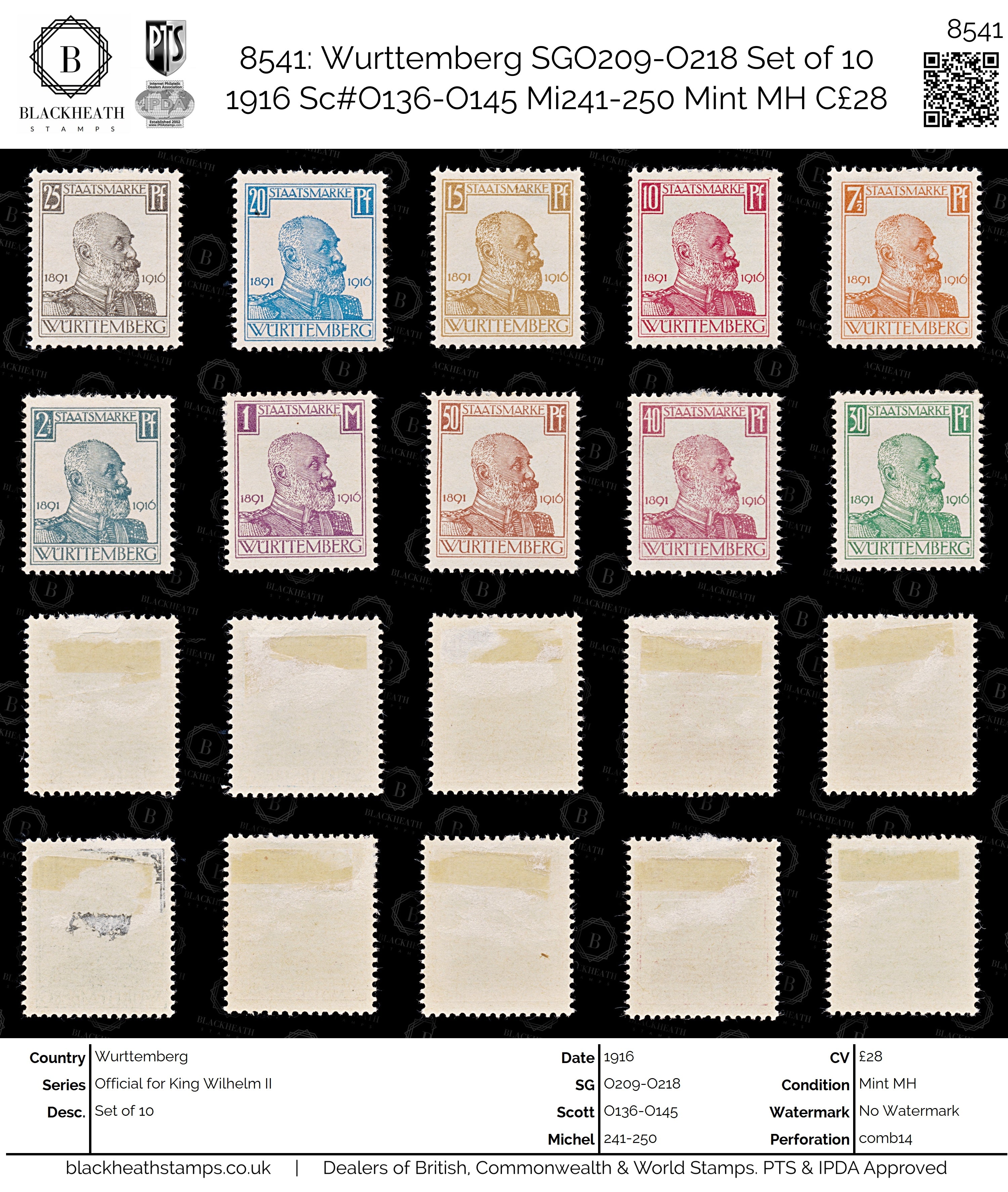 8541: Wurttemberg SGO209-O218 Set of 10 1916 Sc#O136-O145 Mi241-250 Mint MH C£28