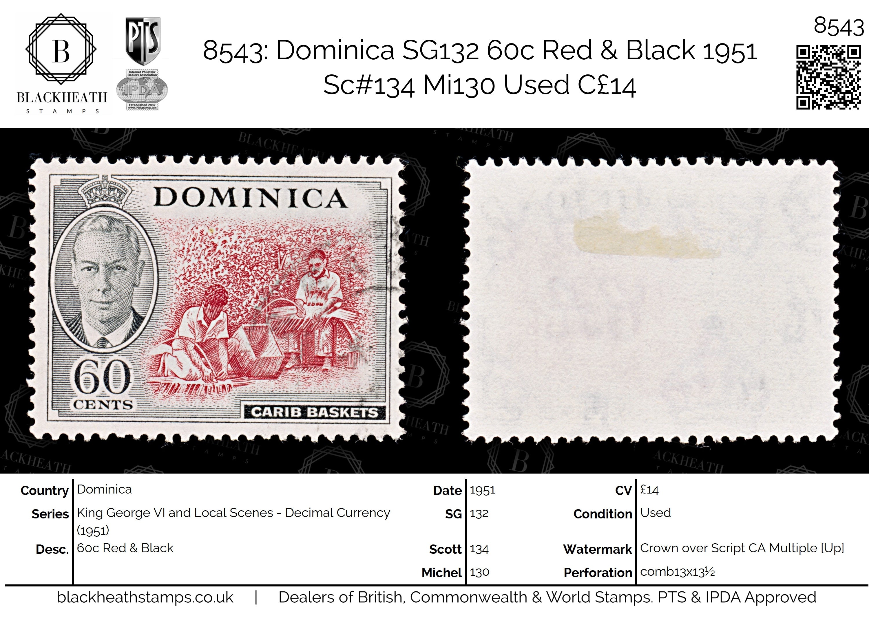 8543: Dominica SG132 60c Red & Black 1951 Sc#134 Mi130 Used C£14