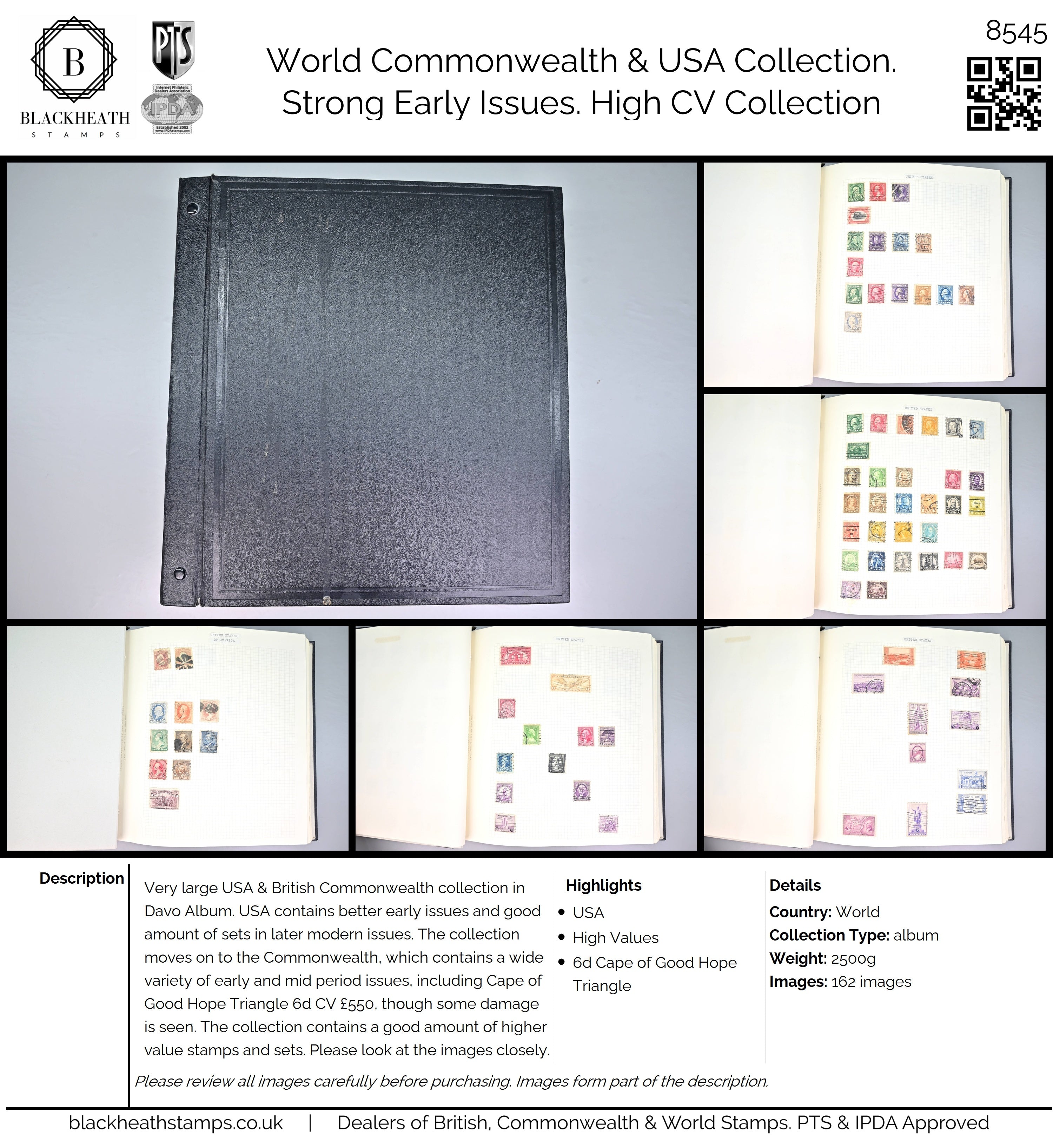 Description: Very large USA & British Commonwealth collection in Davo Album. USA contains better early issues and good amount of sets in later modern issues. The collection moves on to the Commonwealth, which contains a wide variety of early and mid period issues, including Cape of Good Hope Triangle 6d CV £550, though some damage is seen. The collection contains a good amount of higher value stamps and sets. Please look at the images closely.