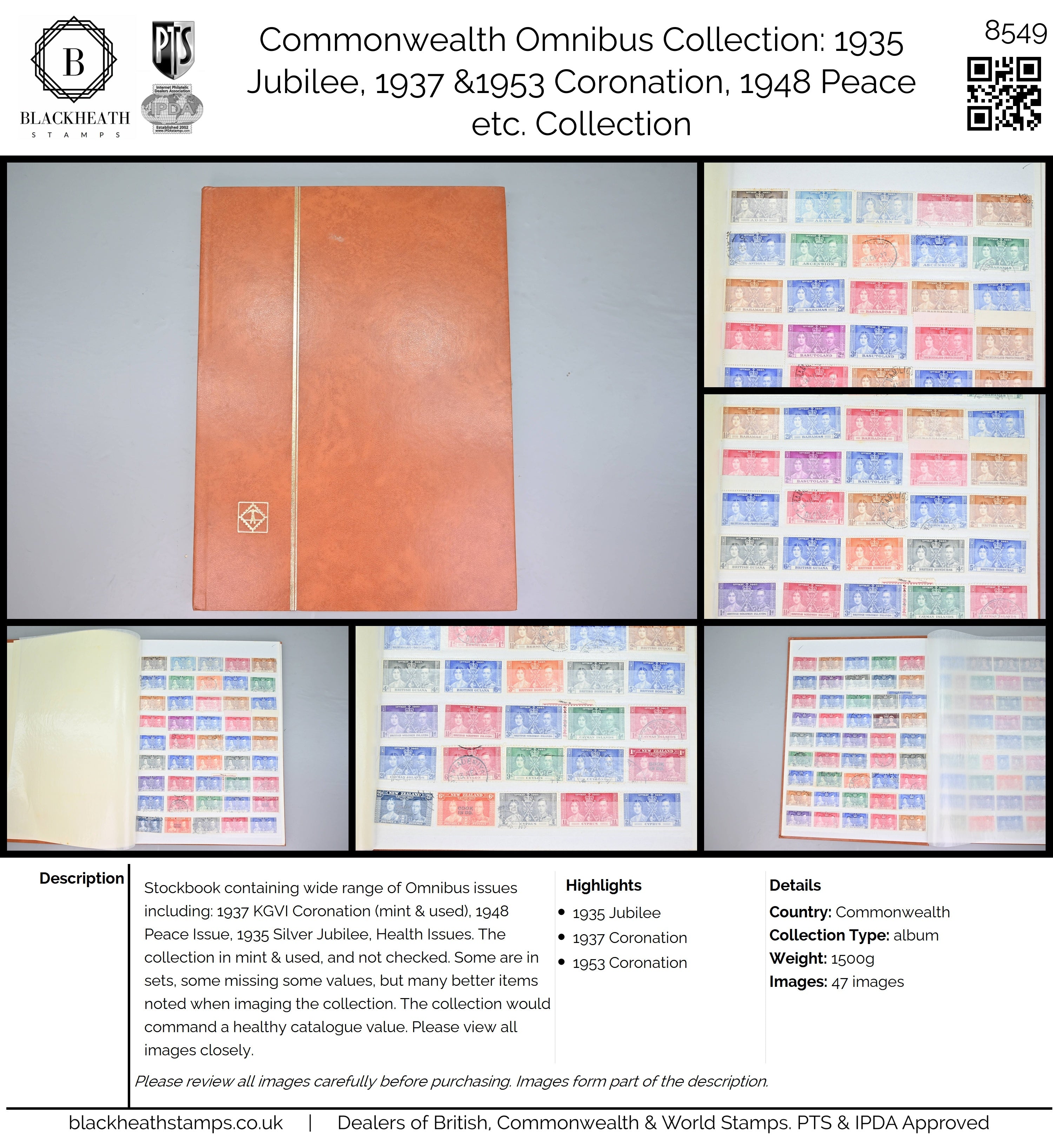 Stockbook containing wide range of Omnibus issues including: 1937 KGVI Coronation (mint & uséd), 1948 Peace Issue, 1935 Silver Jubilee, Health Issues. The collection in mint & uséd, and not checked. Some are in sets, some missing some values, but many better items noted when imaging the collection. The collection would command a healthy catalogue value. Please view all images closely. |
