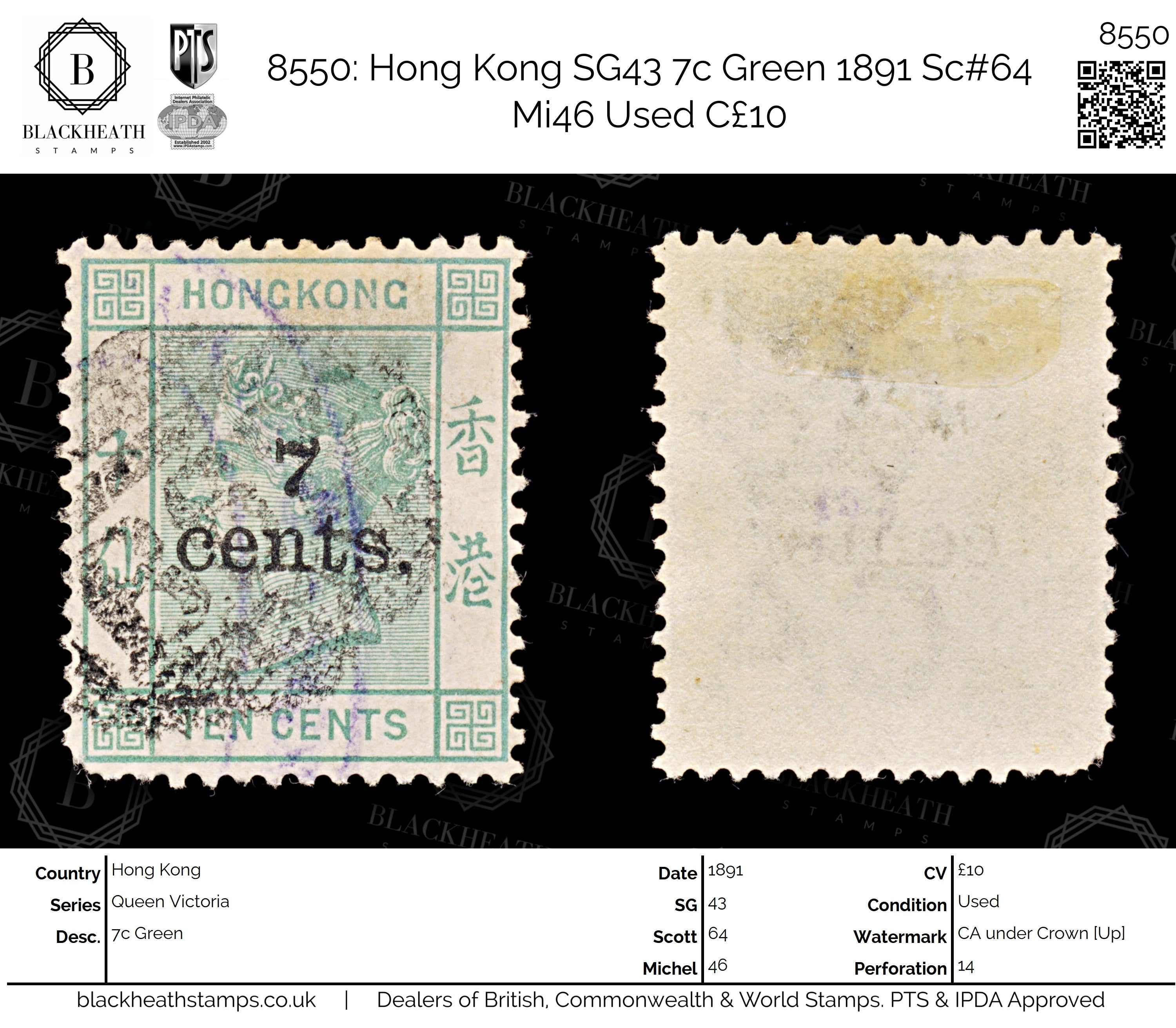 8550: Hong Kong SG43 7c Green 1891 Sc#64 Mi46 Uséd C£10