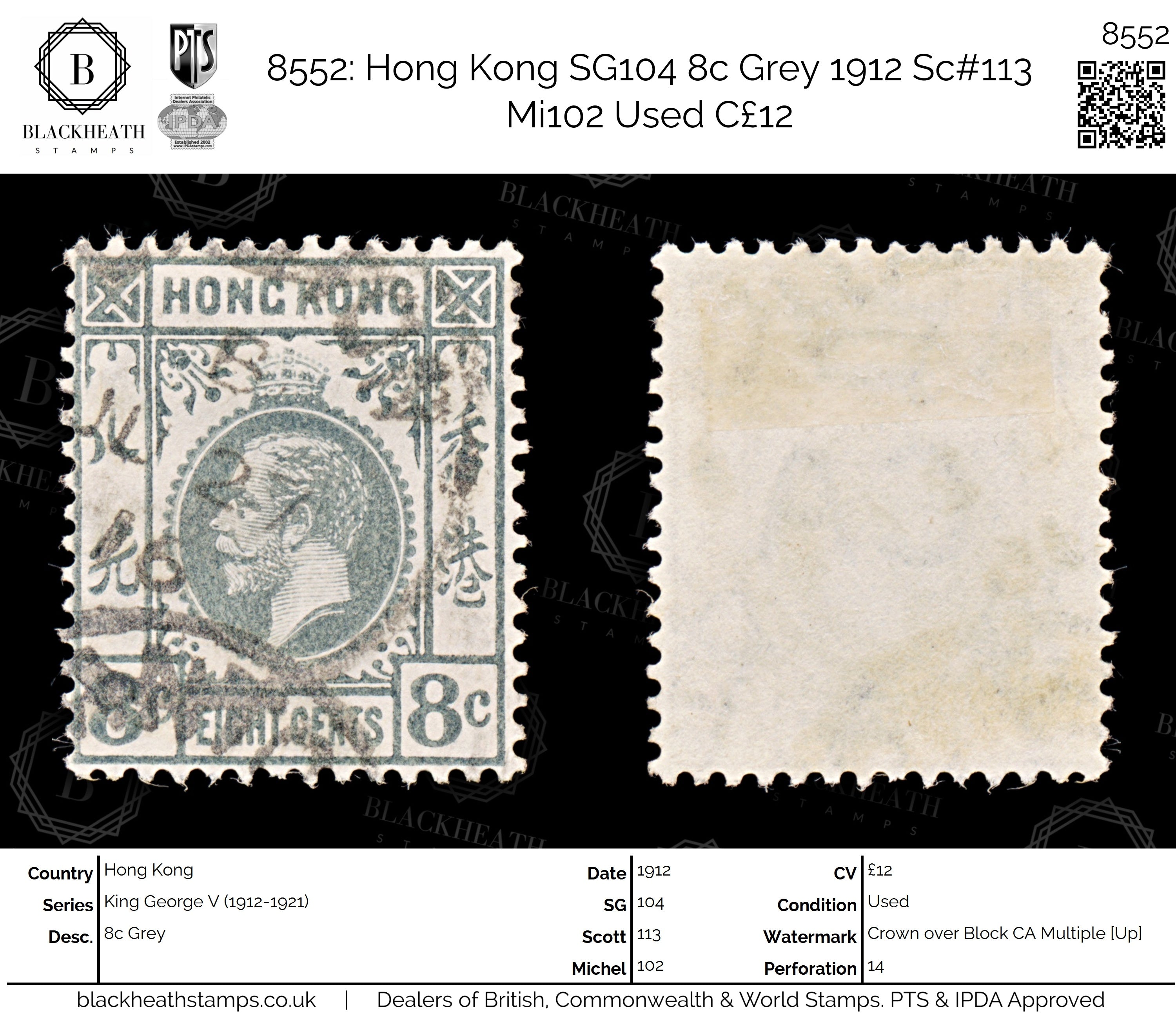 8552: Hong Kong SG104 8c Grey 1912 Sc#113 Mi102 Uséd C£12