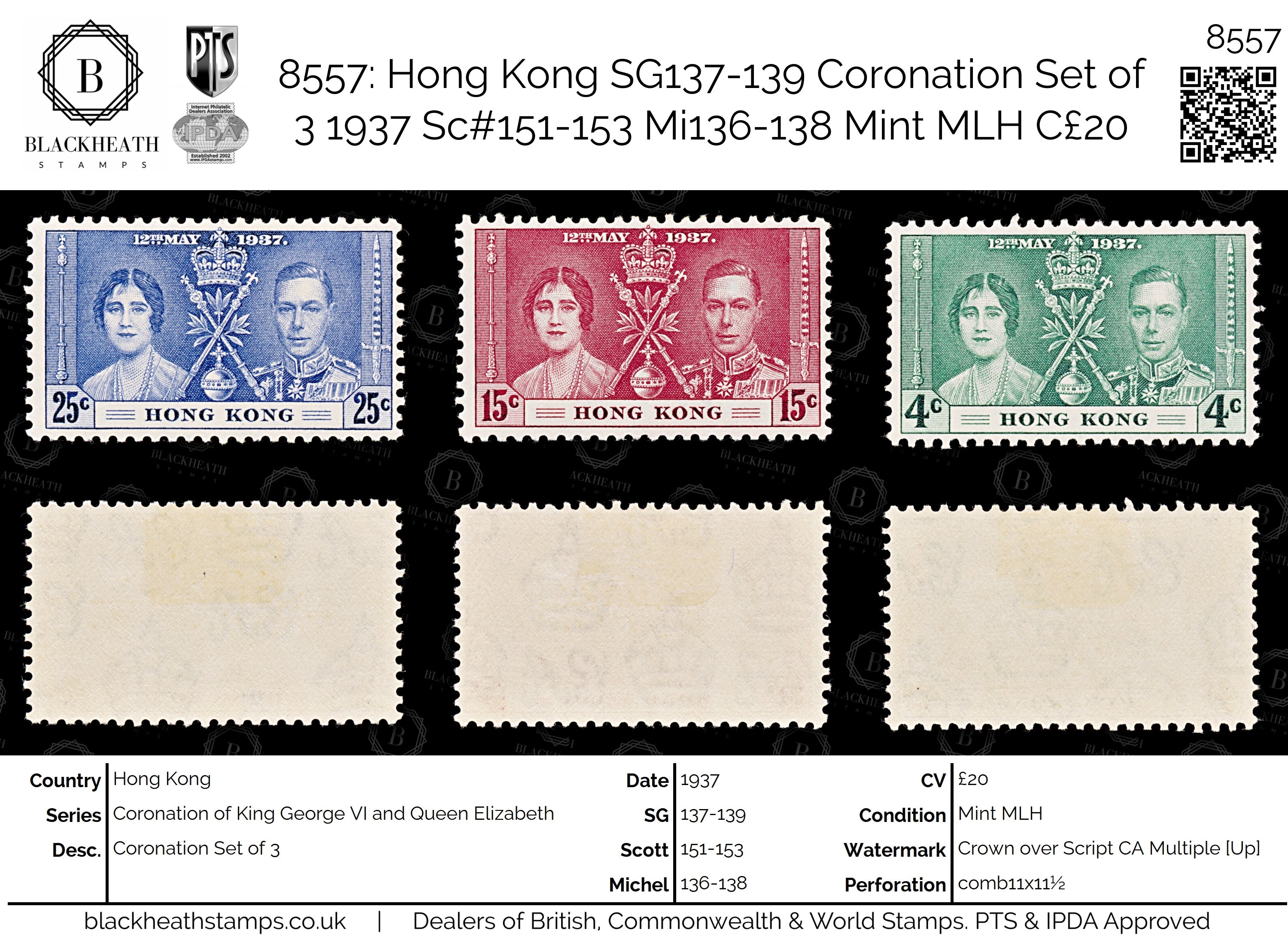 8557: Hong Kong SG137-139 Coronation Set of 3 1937 Sc#151-153 Mi136-138 Mint MLH C£20