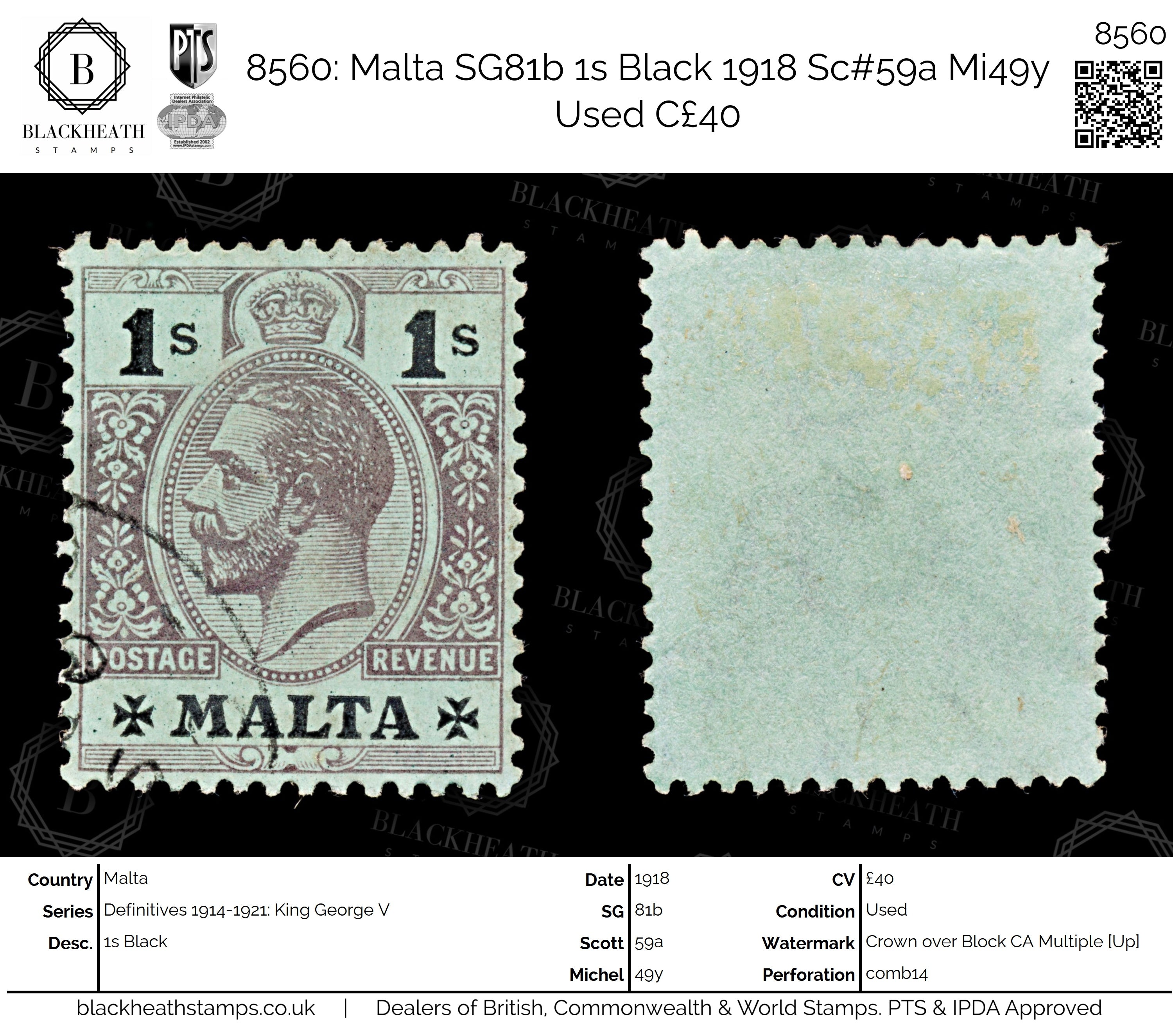 8560: Malta SG81b 1s Black 1918 Sc#59a Mi49y Uséd C£40