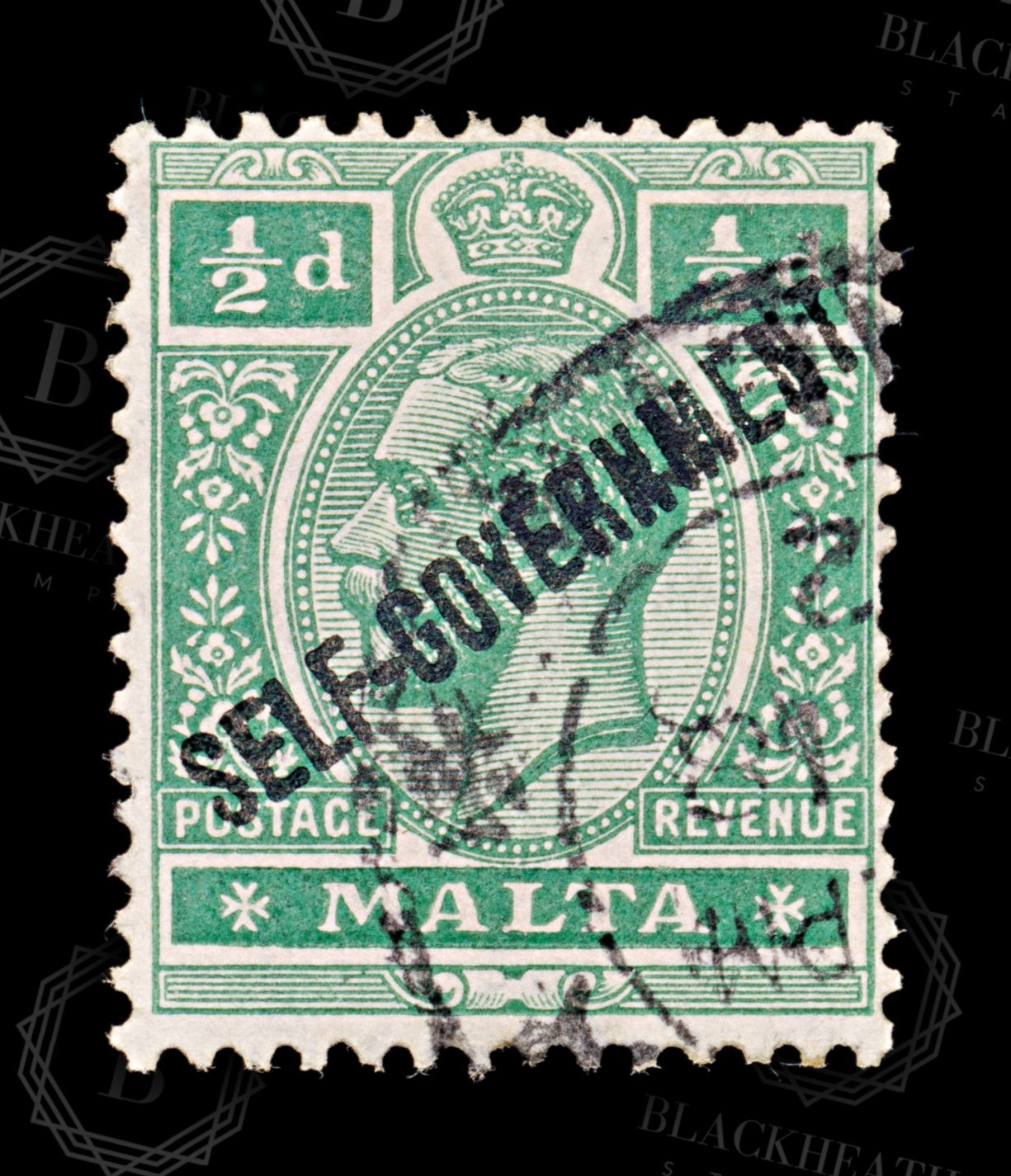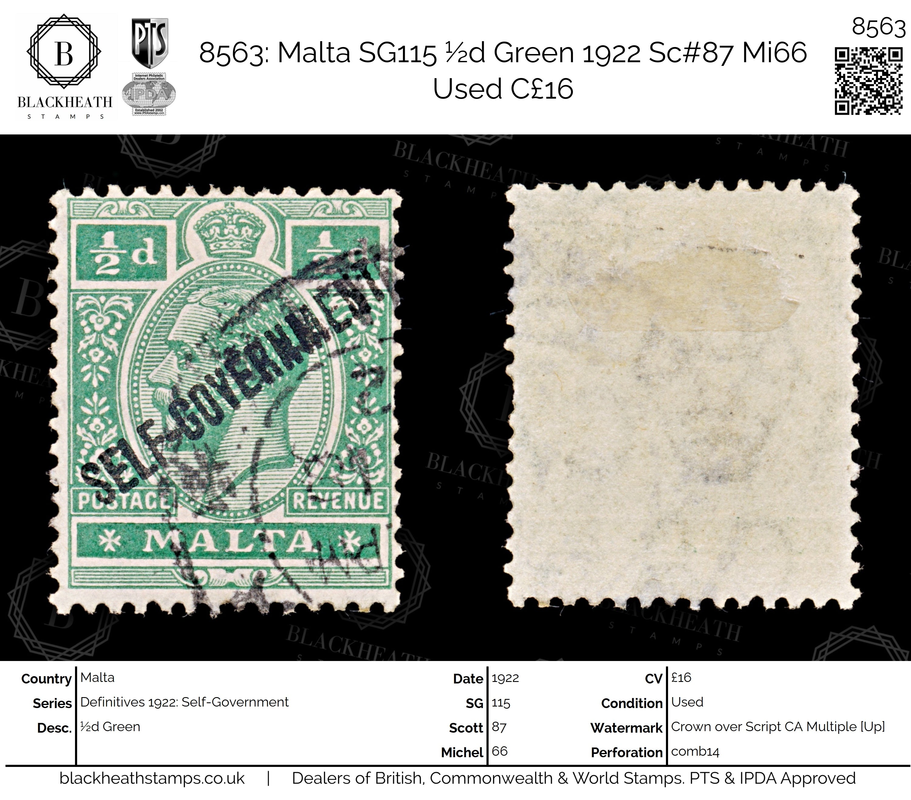 8563: Malta SG115 ½d Green 1922 Sc#87 Mi66 Uséd C£16