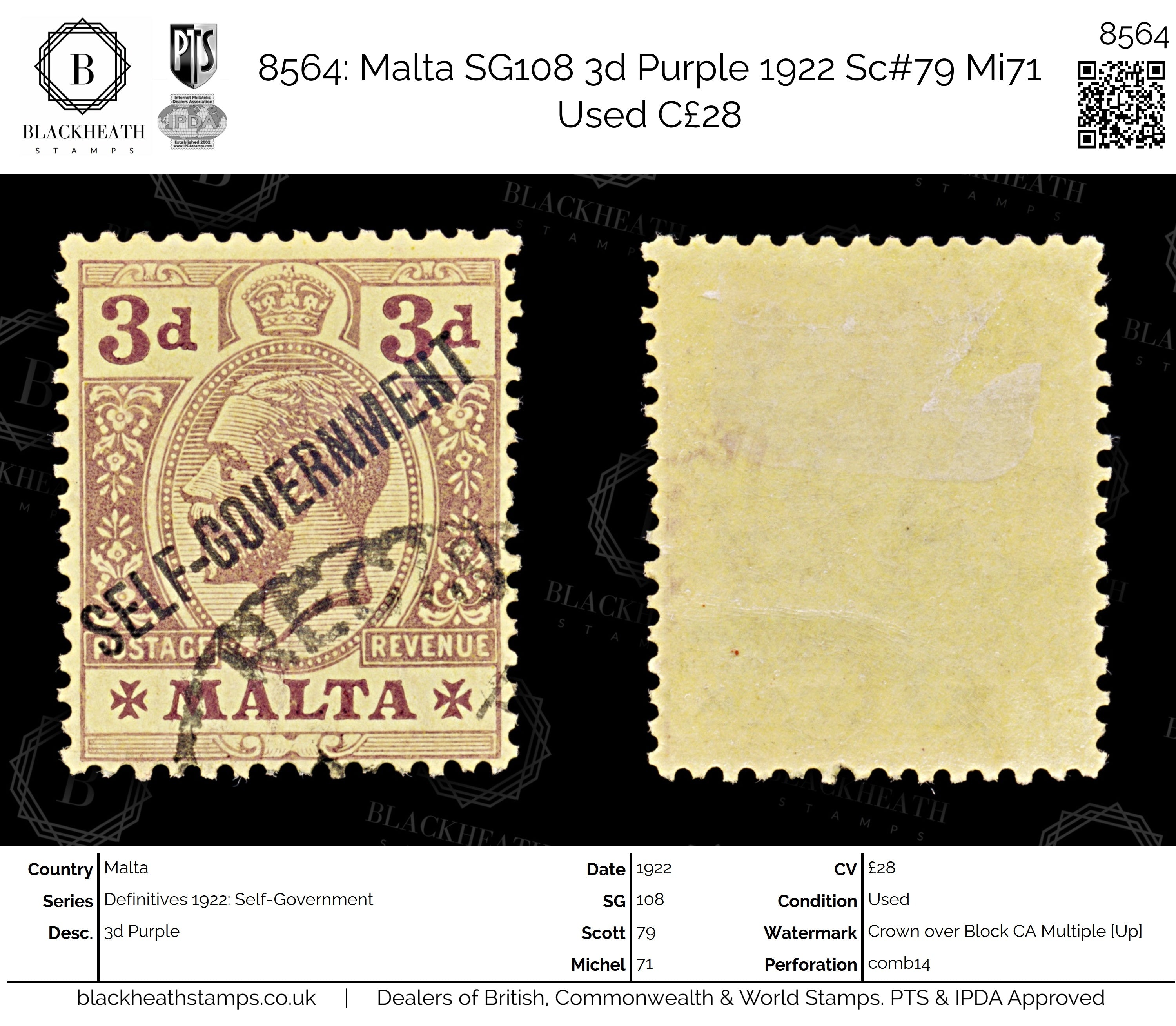 8564: Malta SG108 3d Purple 1922 Sc#79 Mi71 Uséd C£28