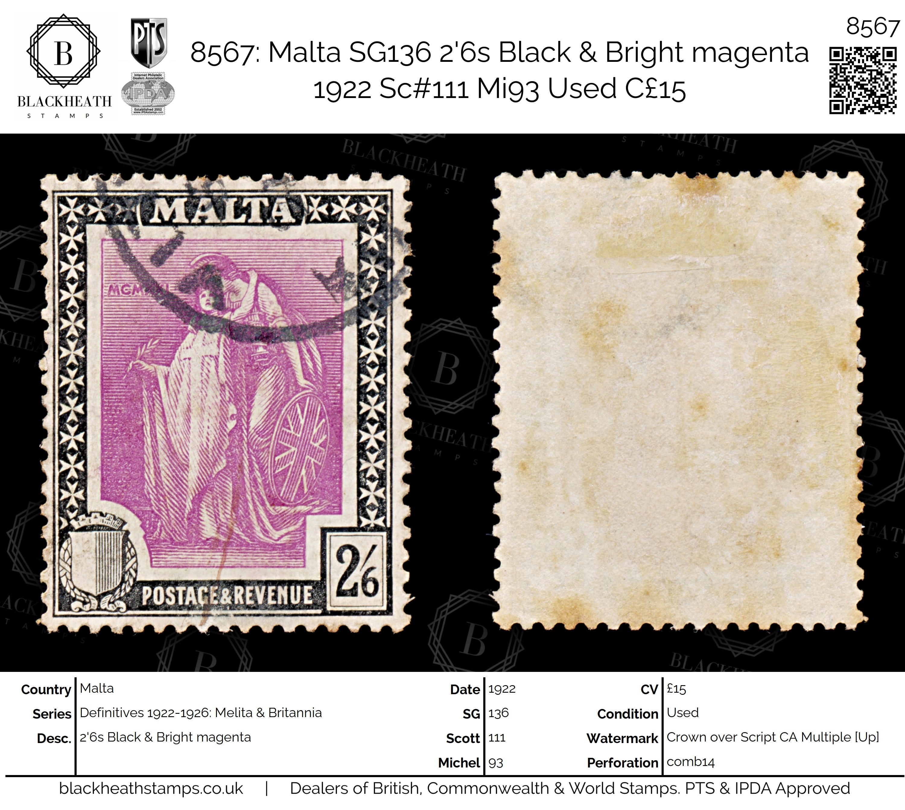 8567: Malta SG136 2'6s Black & Bright magenta 1922 Sc#111 Mi93 Uséd C£15