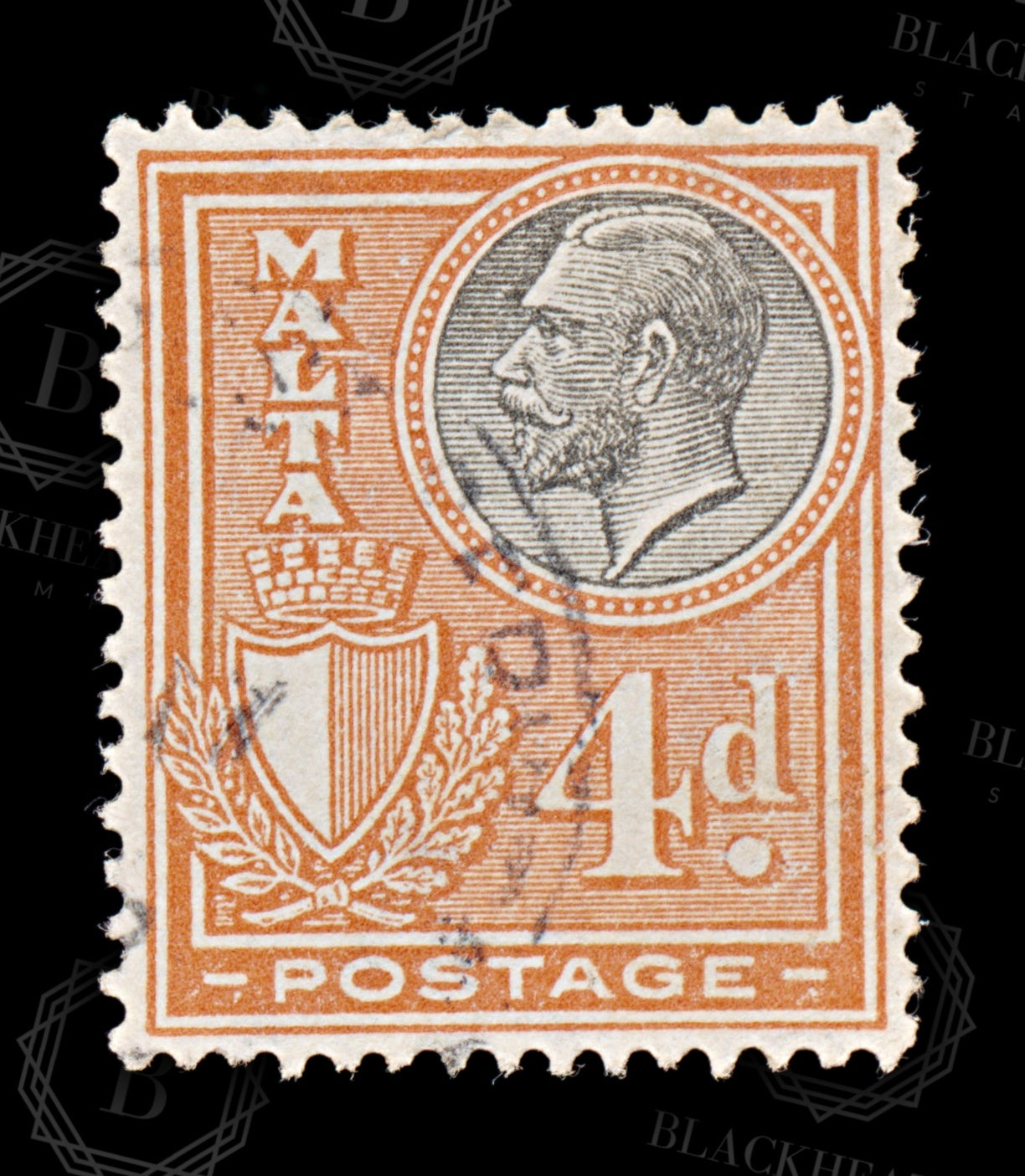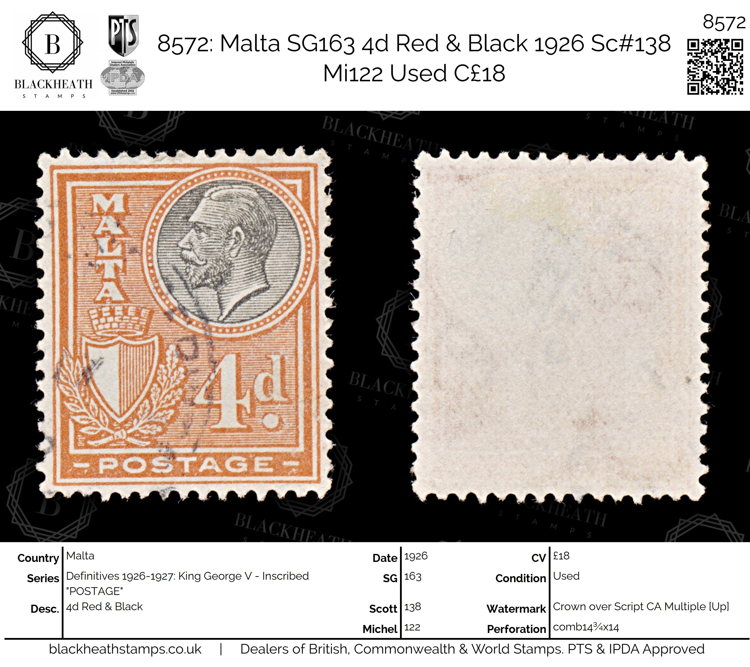 8572: Malta SG163 4d Red & Black 1926 Sc#138 Mi122 Uséd C£18