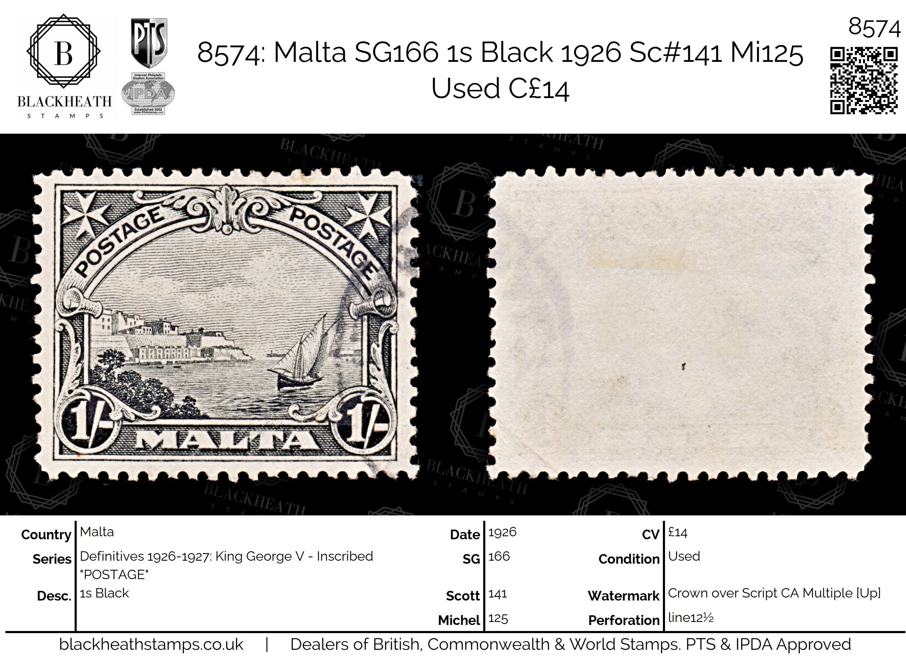 8574: Malta SG166 1s Black 1926 Sc#141 Mi125 Used C£14