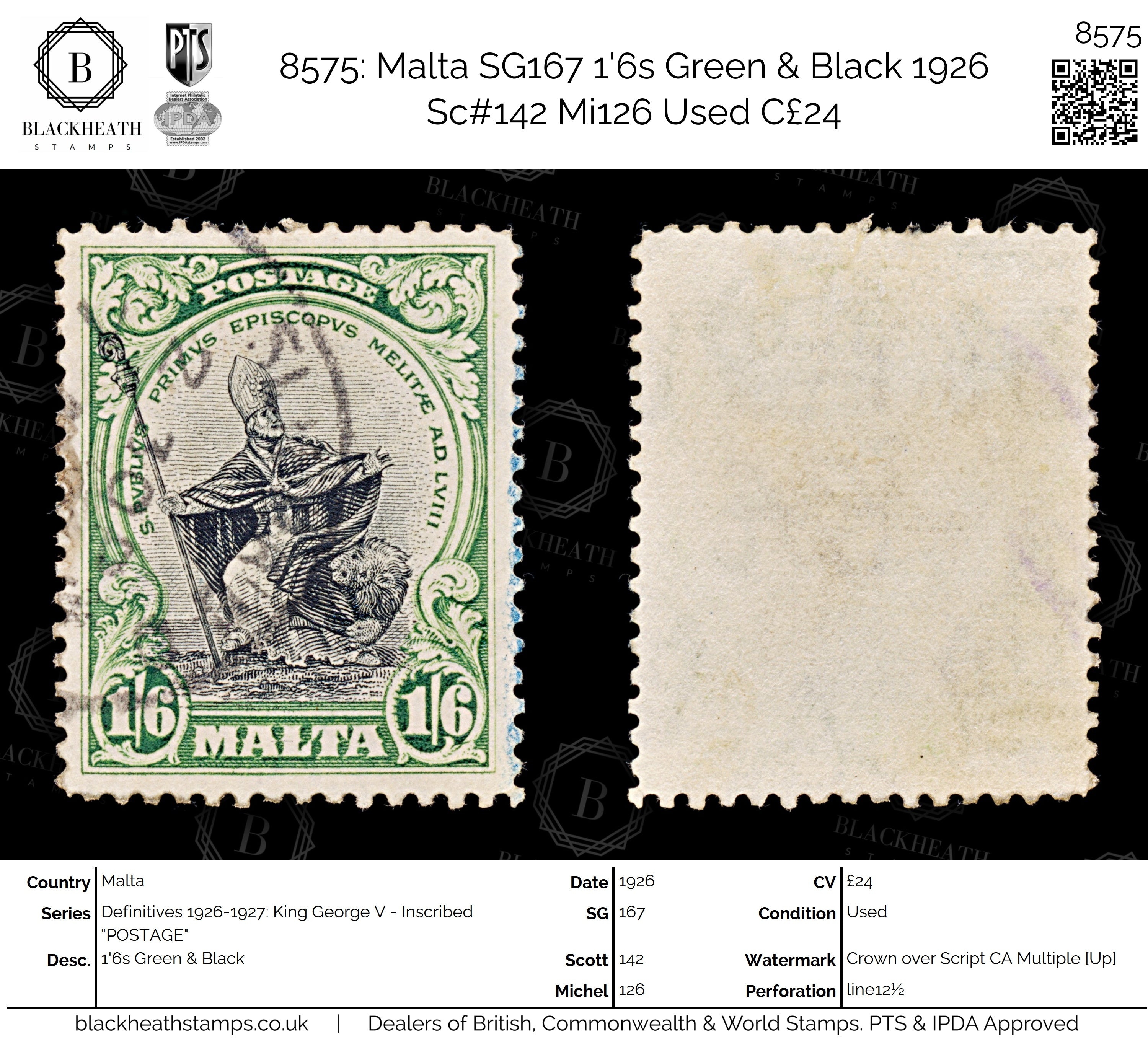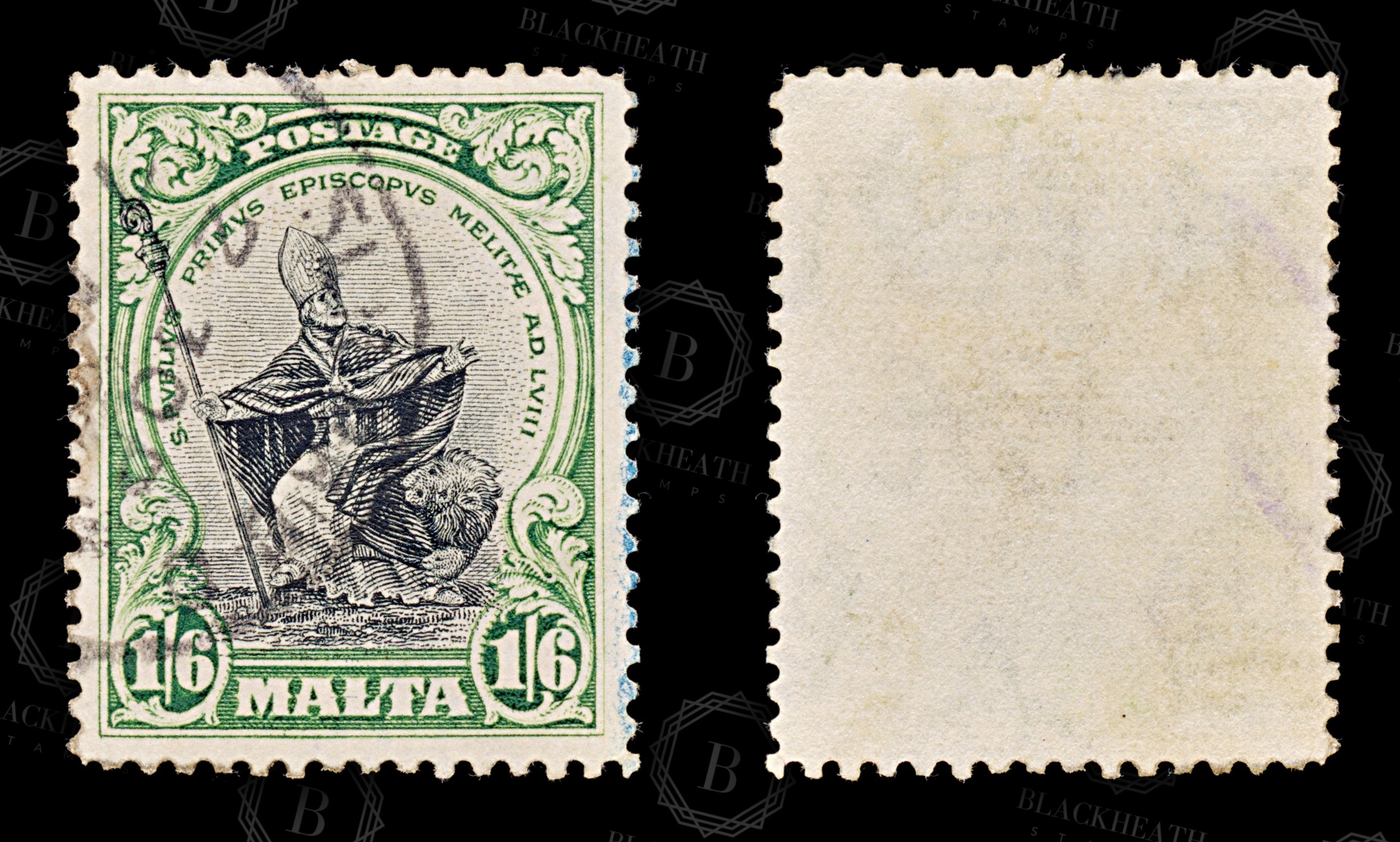 8575: Malta SG167 1'6s Green & Black 1926 Sc#142 Mi126 Used C£24