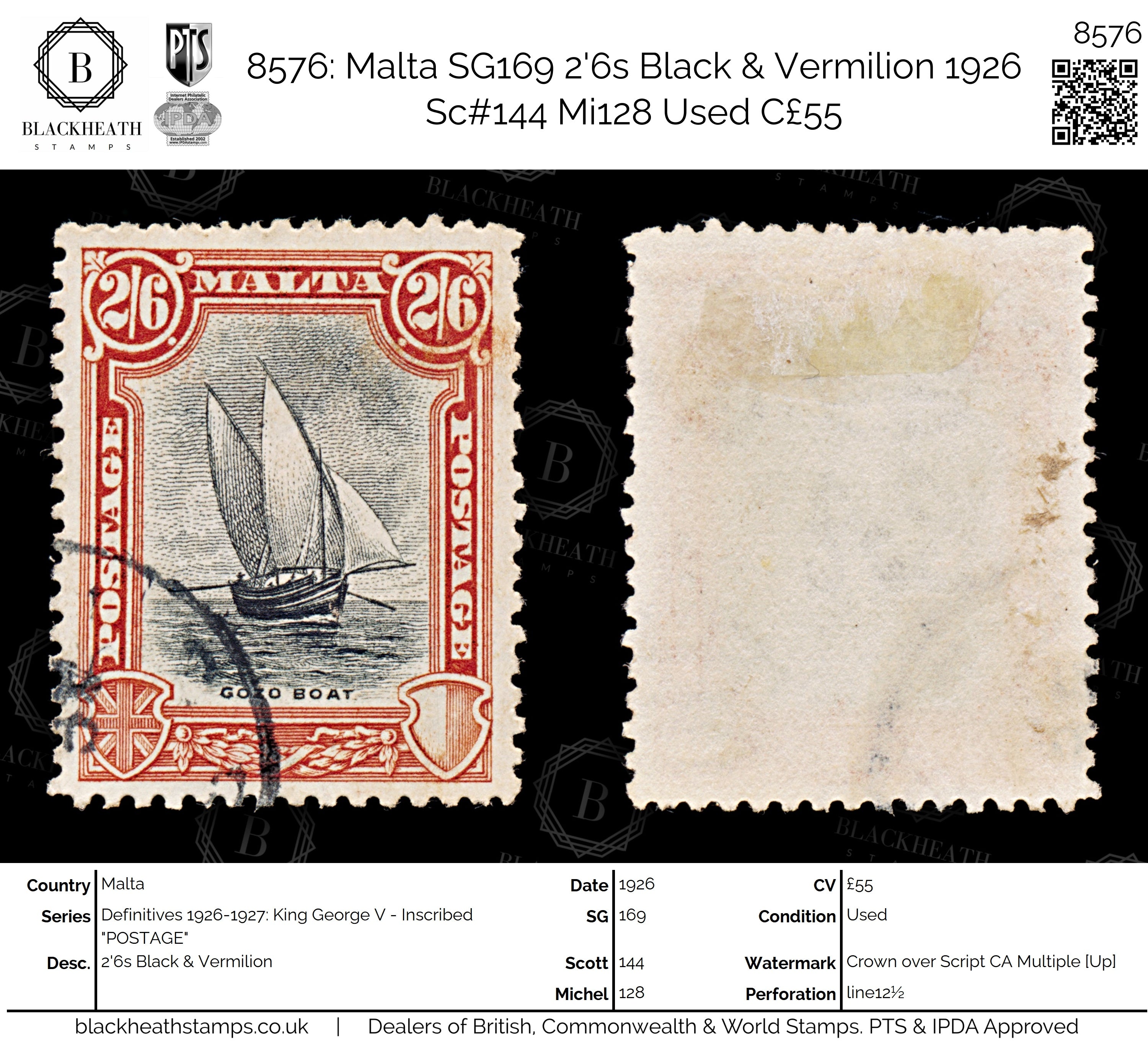 8576: Malta SG169 2'6s Black & Vermilion 1926 Sc#144 Mi128 Uséd C£55
